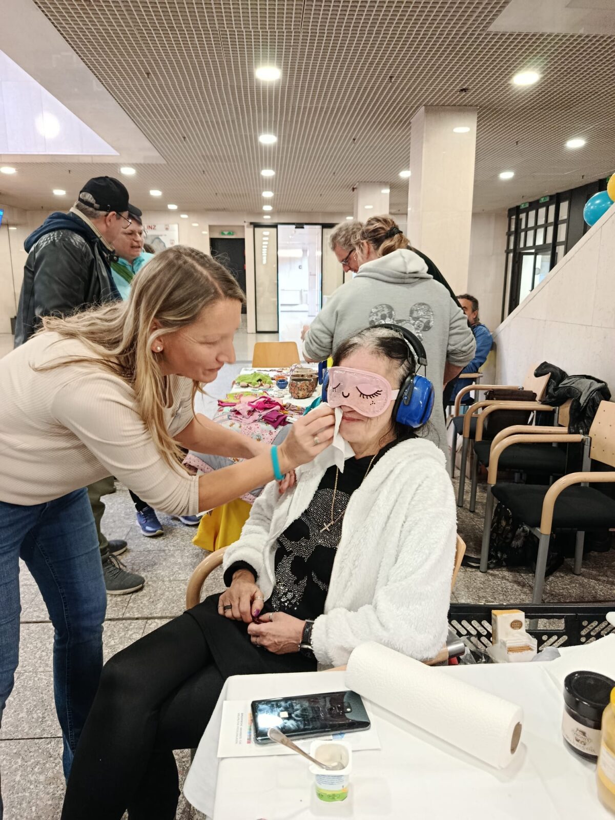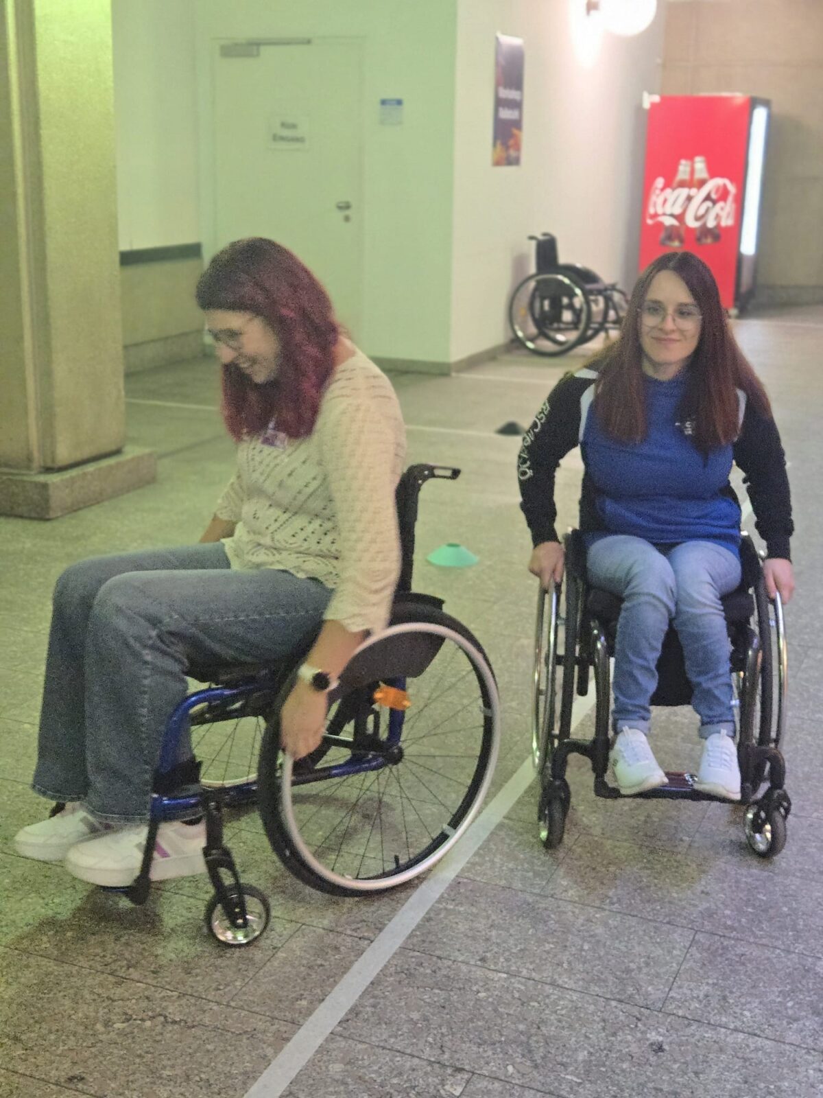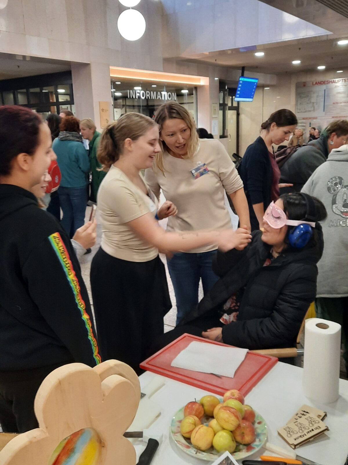 Zahlreiche Schulgruppen, überwiegend aus Sozialberufen, und private Interessierte nahmen teil, um inklusiven Alltag kennenzulernen. Zum Ausprobieren standen Rollstuhl, Blindenstock und verschiedene Utensilien wie z.B. Körpergewichte (etwa zur Simulation von Bewegungseinschränkung) bereit, um Barrieren in Alltagssituationen erlebbar zu machen. Bewegungs- und Wahrnehmungsübungen gaben Einblicke in das Erleben von Einschränkungen – inklusive der passenden Emotionen. Besonders bei Alltagssituationen wie Essen eingeben bei anderen Menschen hatten viele ein „Aha“-Erlebnis: Nicht zu wissen, welches Essen kommt, plötzlich eine Serviette über den Mund gewischt zu bekommen,… all diese Kleinigkeiten fühlen sich ohne vorherige „Vorwarnung“ sehr überrumpelnd an.
