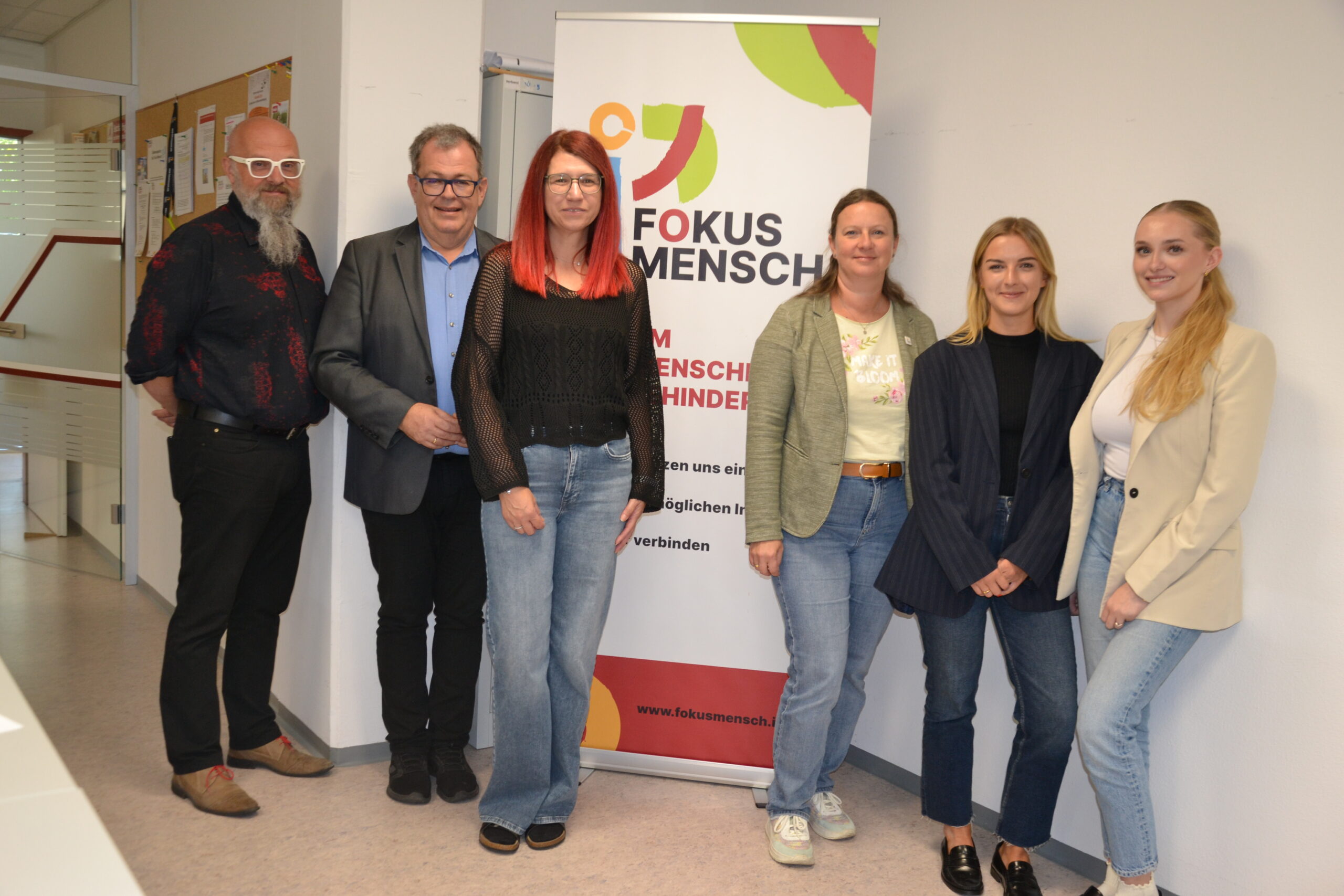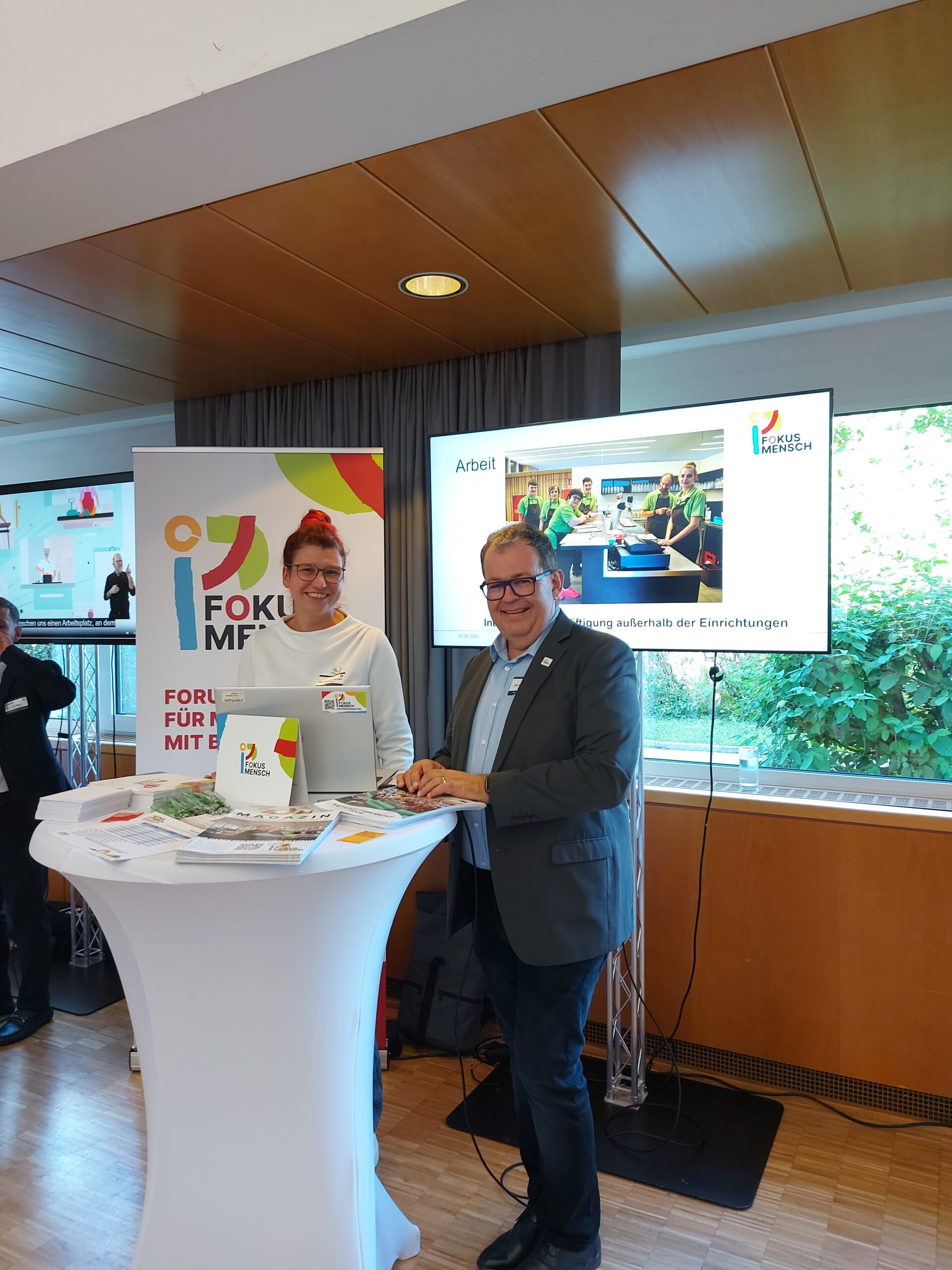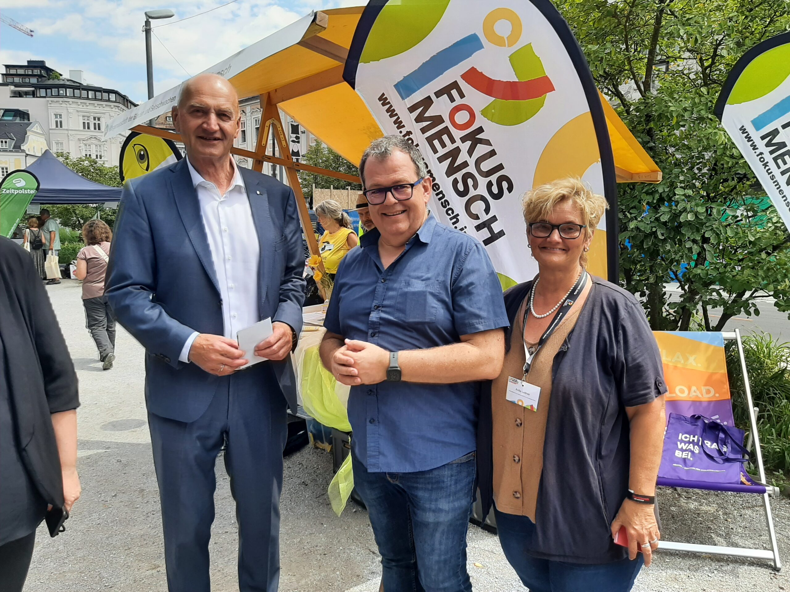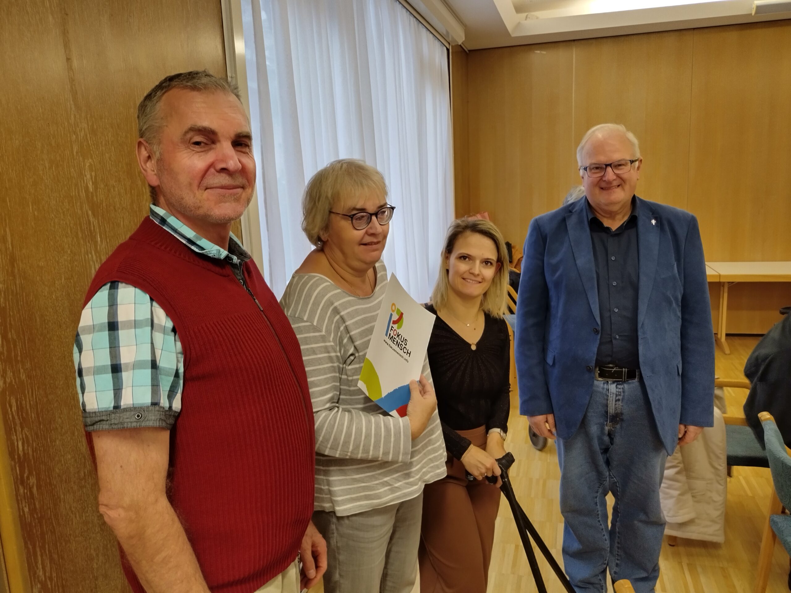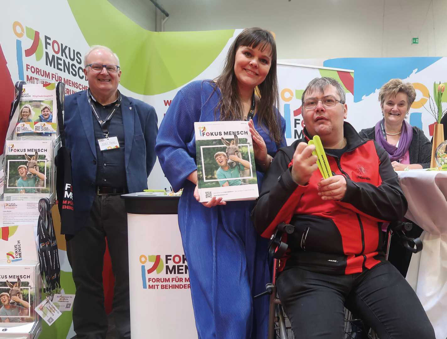 | alt: | Zwei Frauen und ein Mann präsentieren gemeinsam einen Flyer von Fokus Mensch auf einer Veranstaltung. |