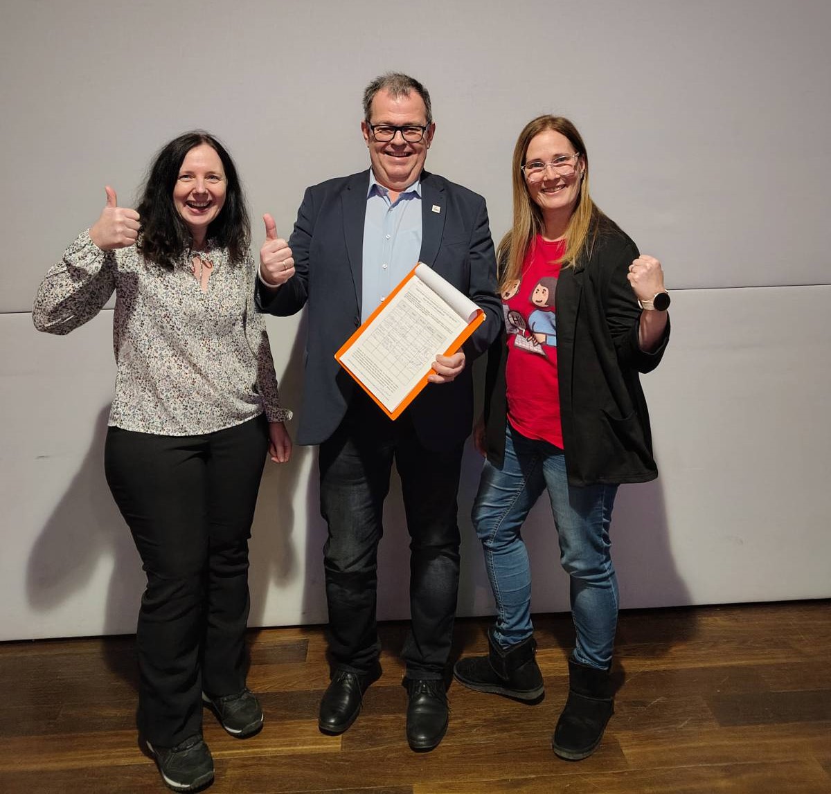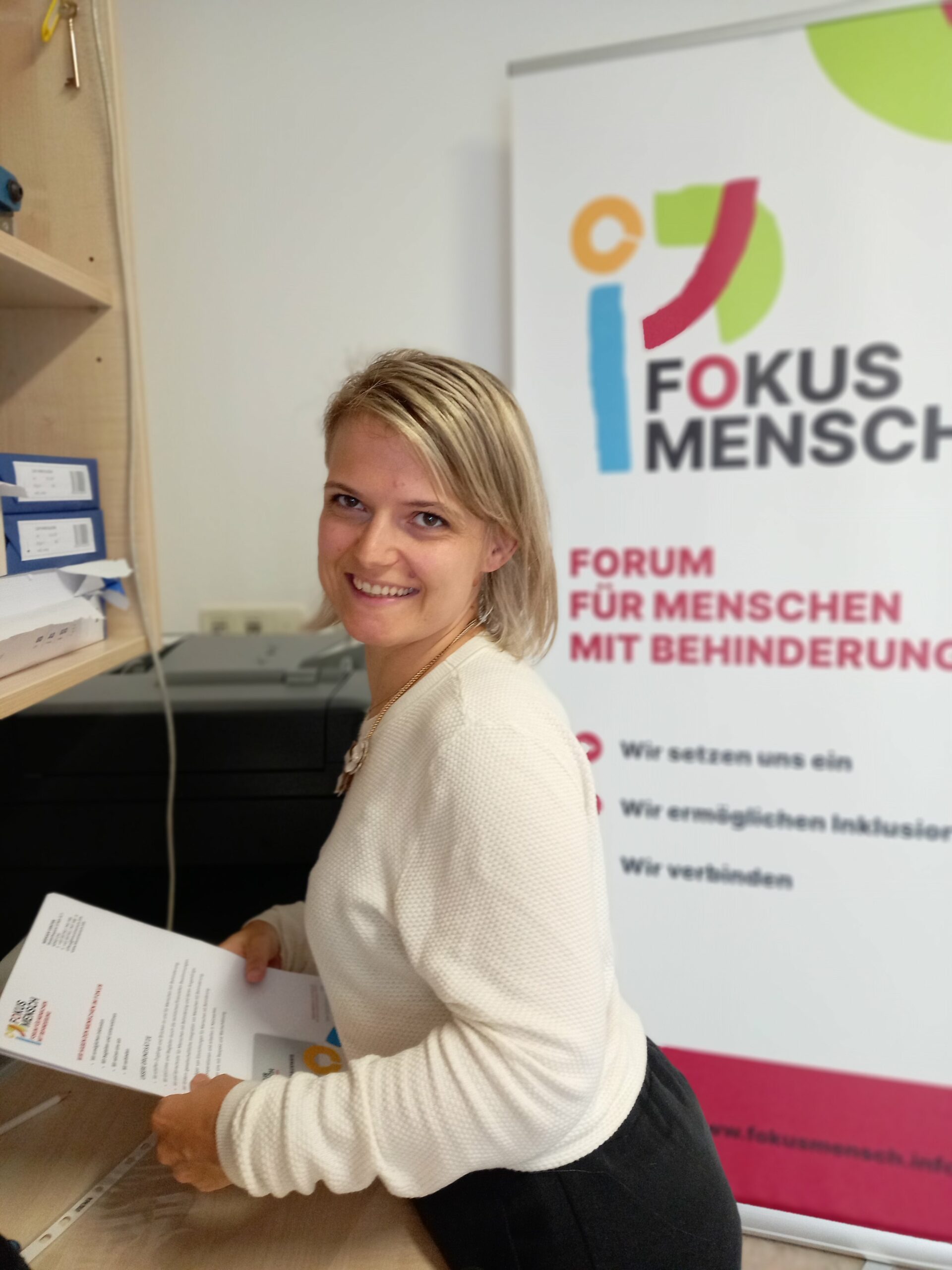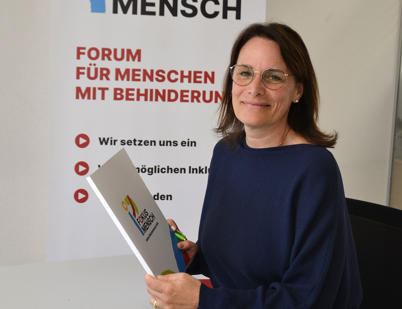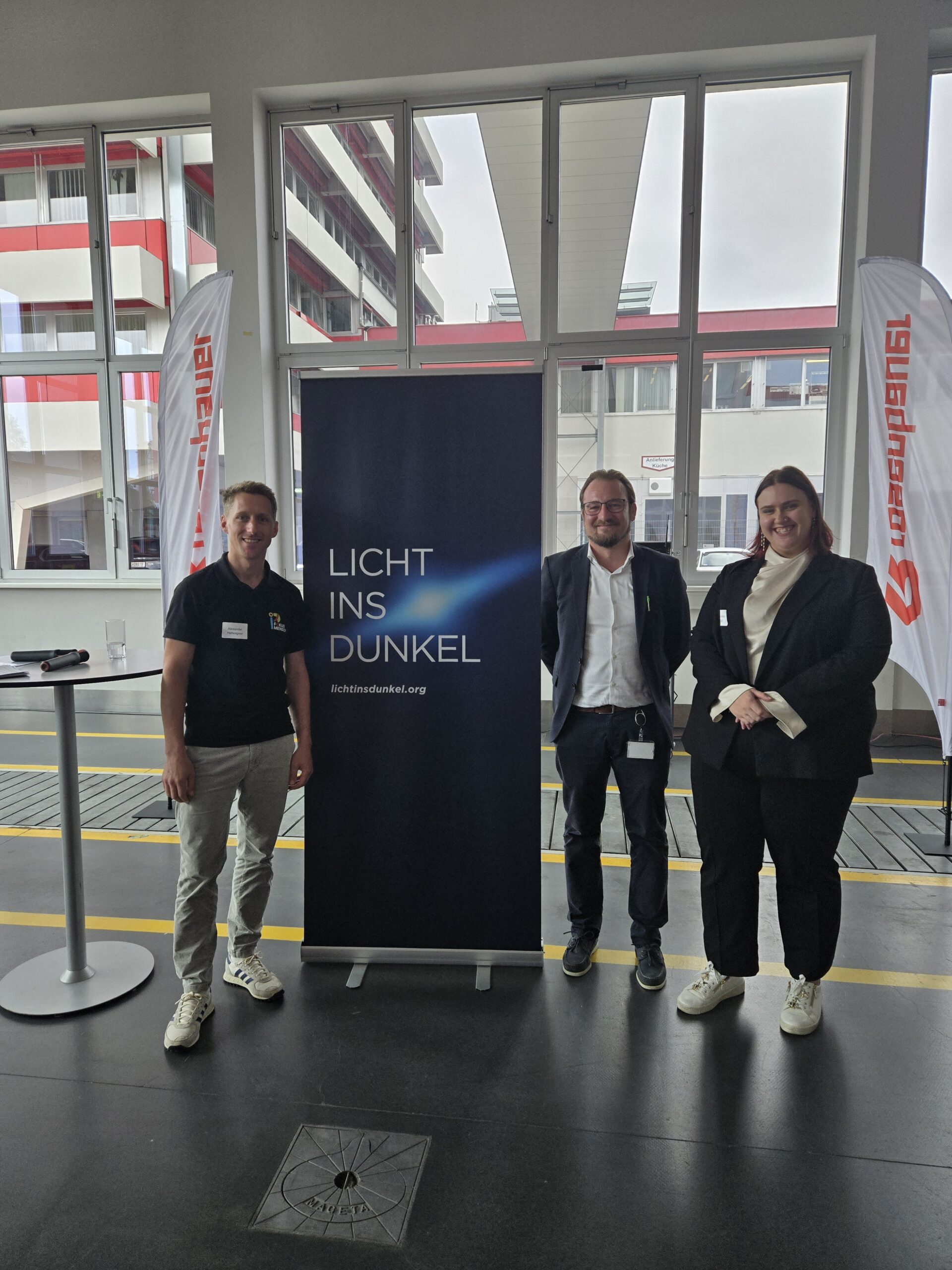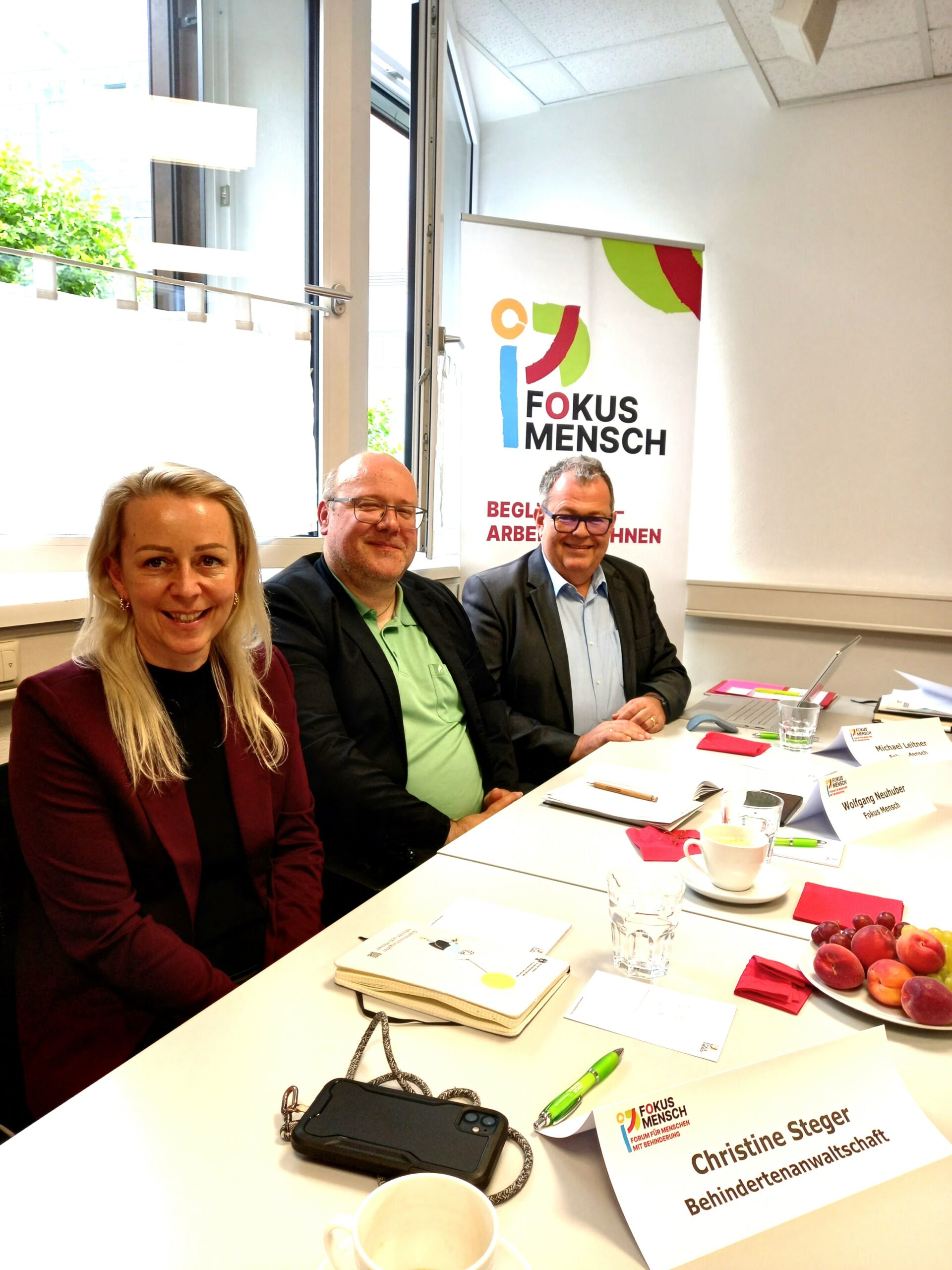 | alt: | Zwei Frauen und ein Mann präsentieren gemeinsam einen Flyer von Fokus Mensch auf einer Veranstaltung. |