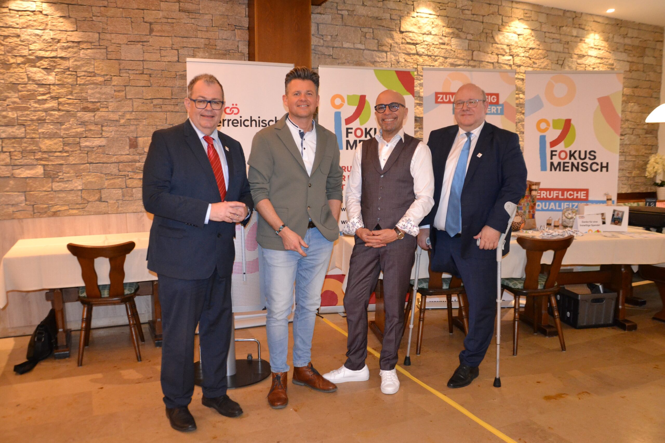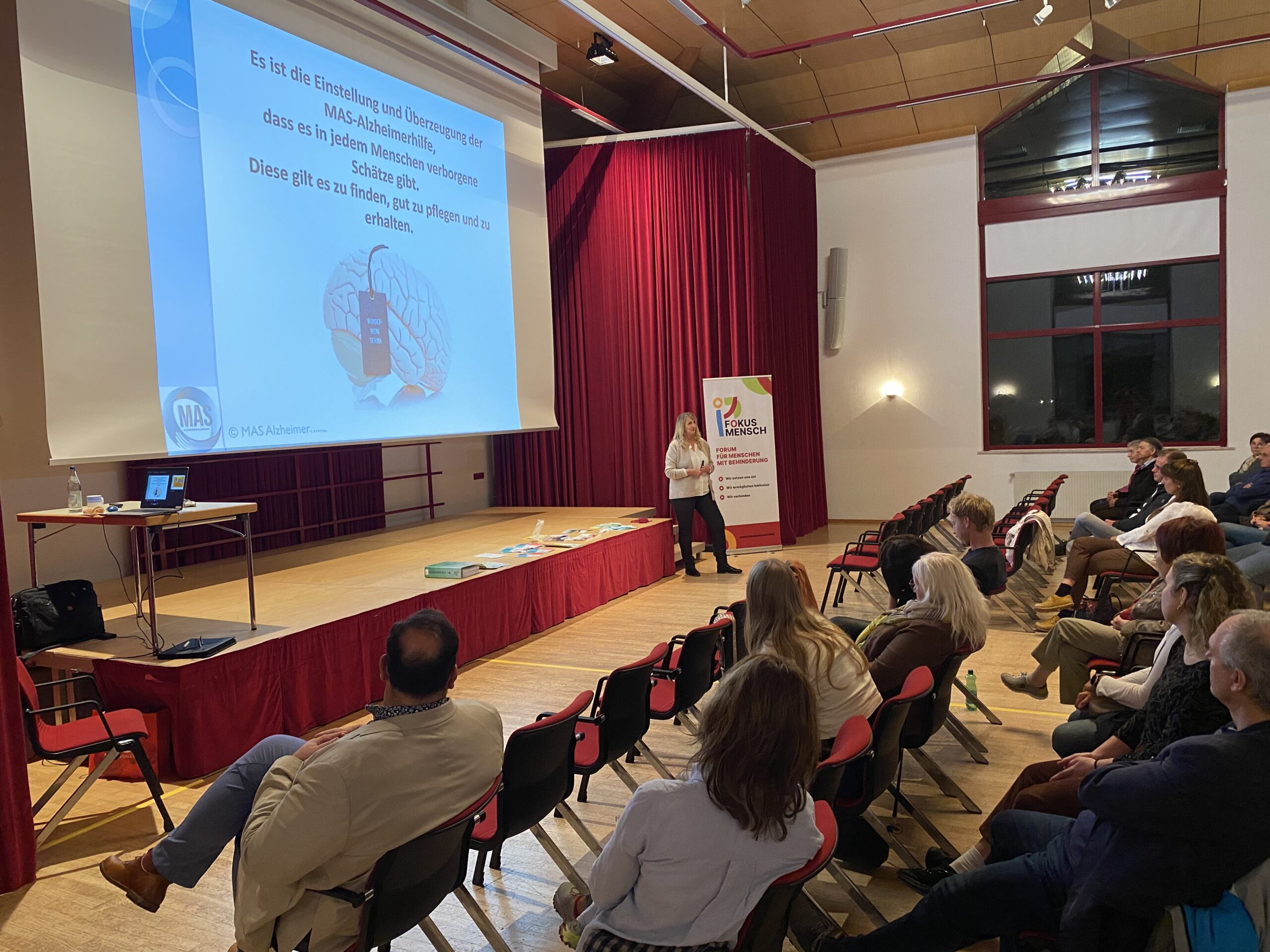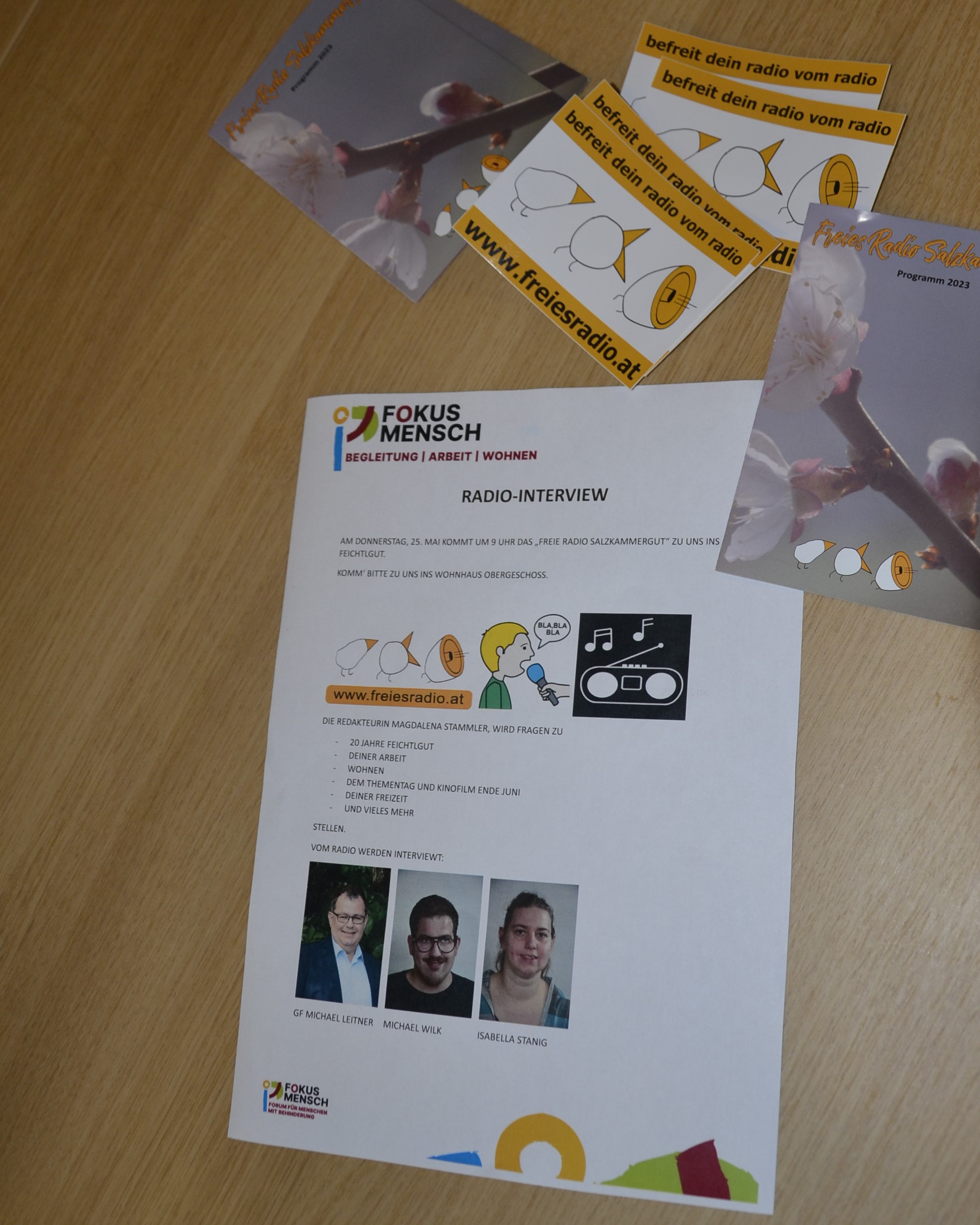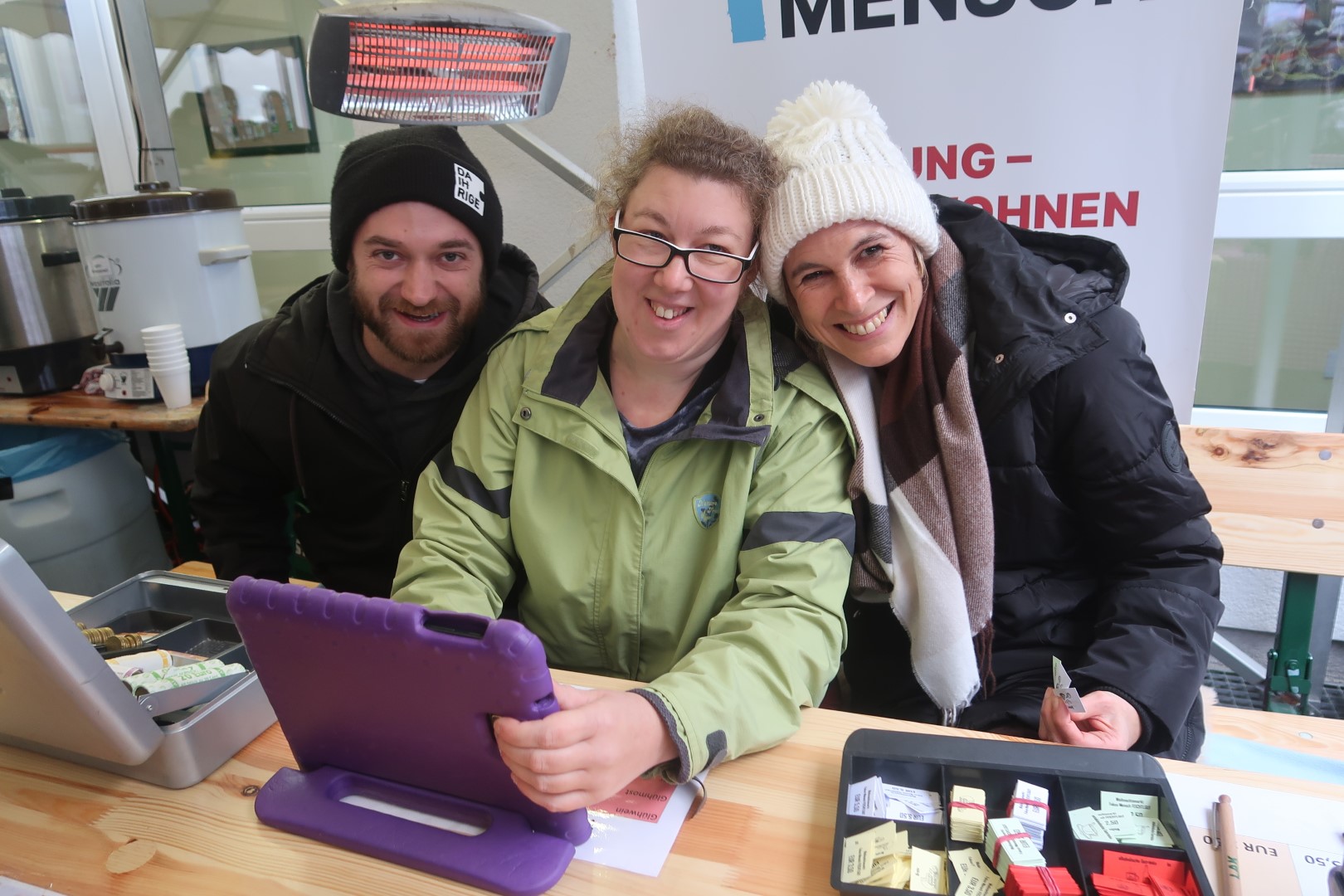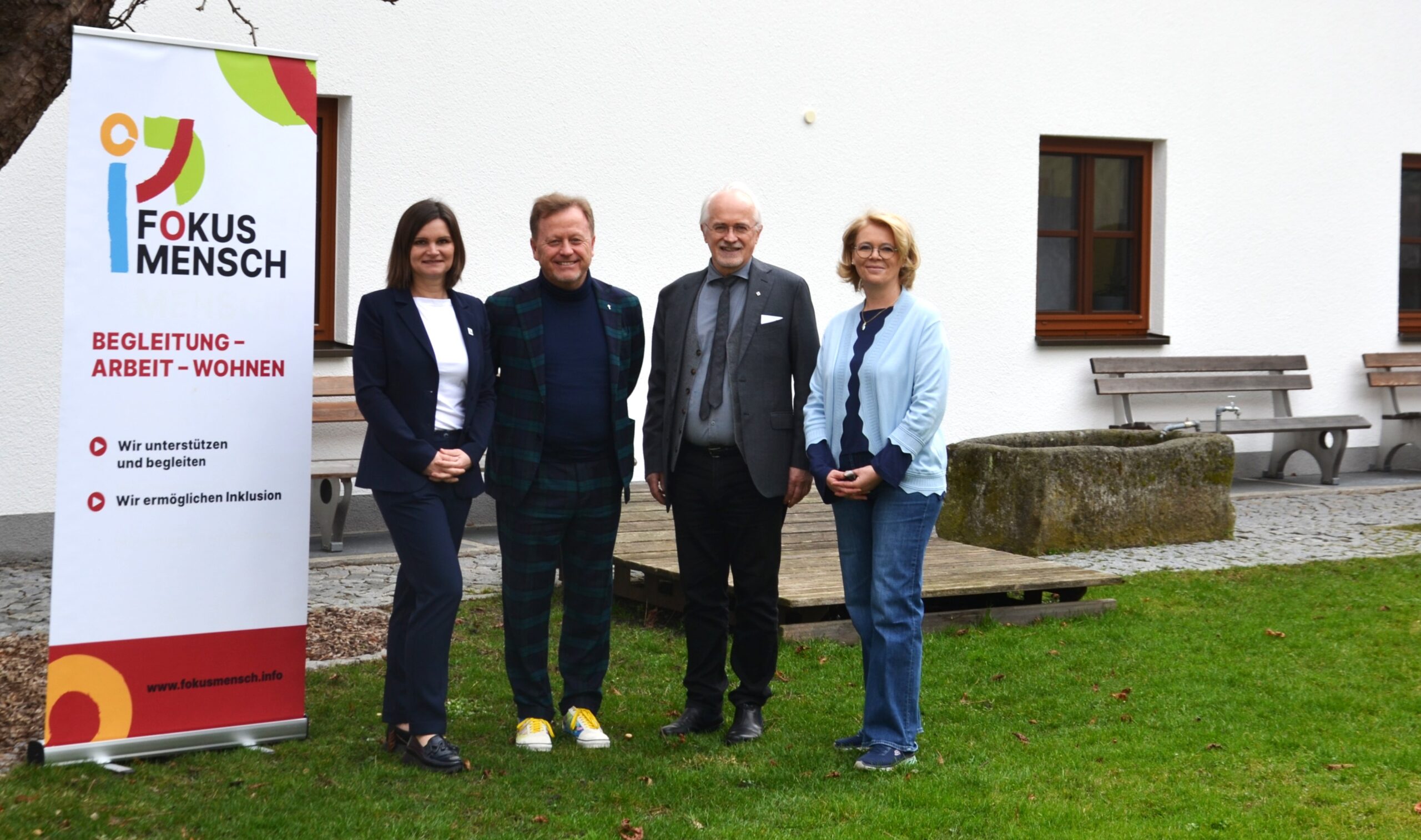 | alt: | Zwei Frauen und ein Mann präsentieren gemeinsam einen Flyer von Fokus Mensch auf einer Veranstaltung. |