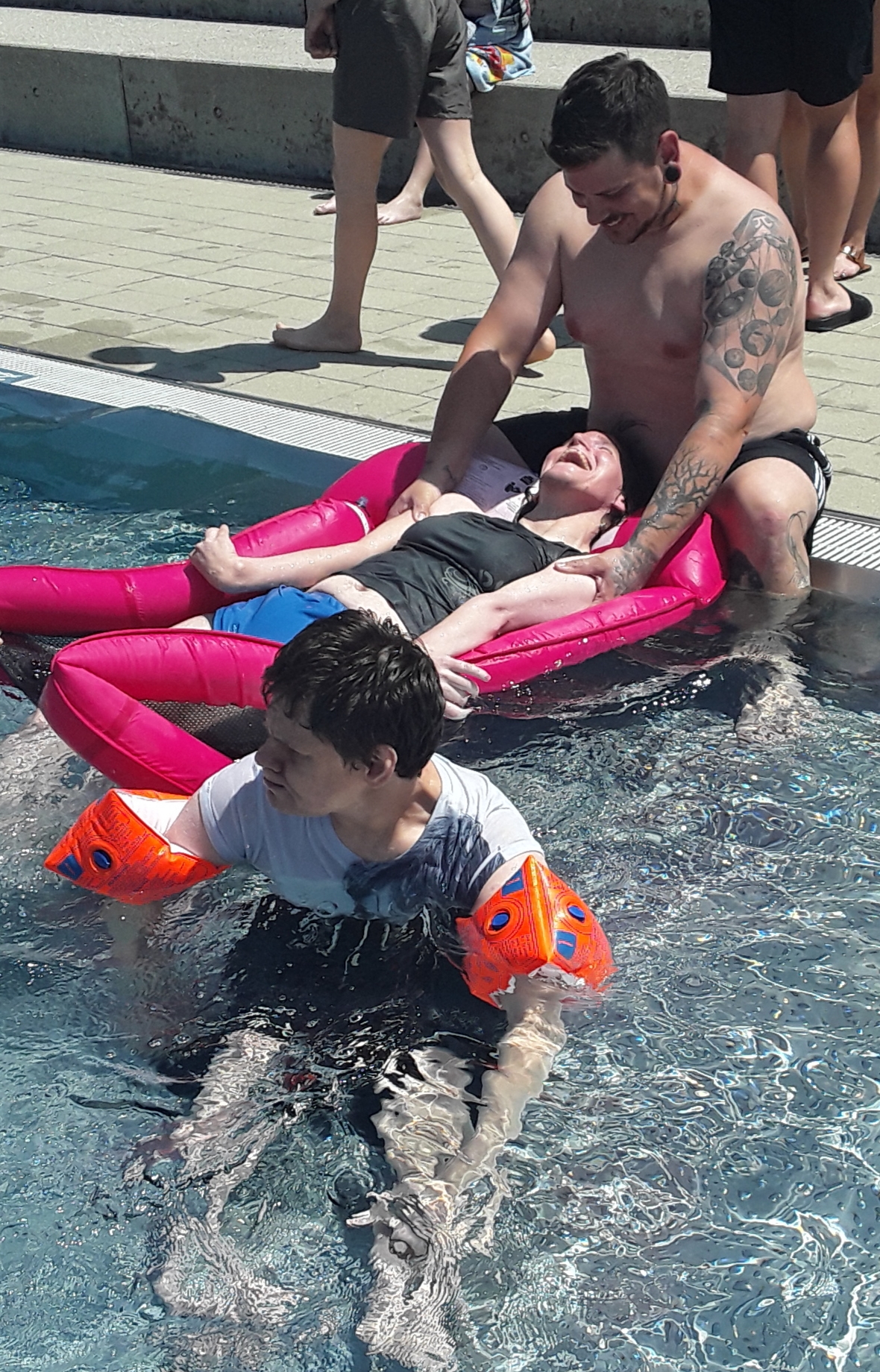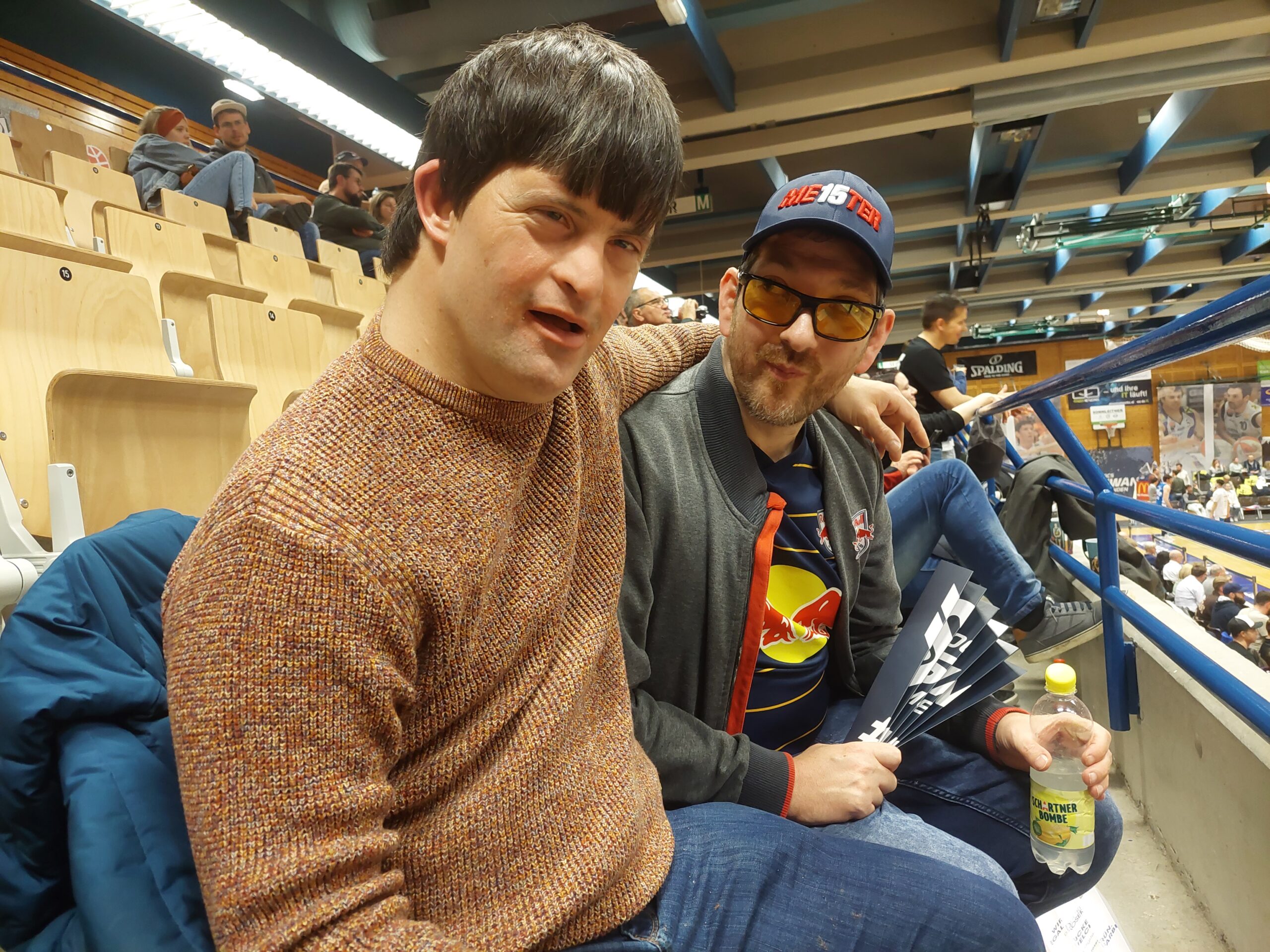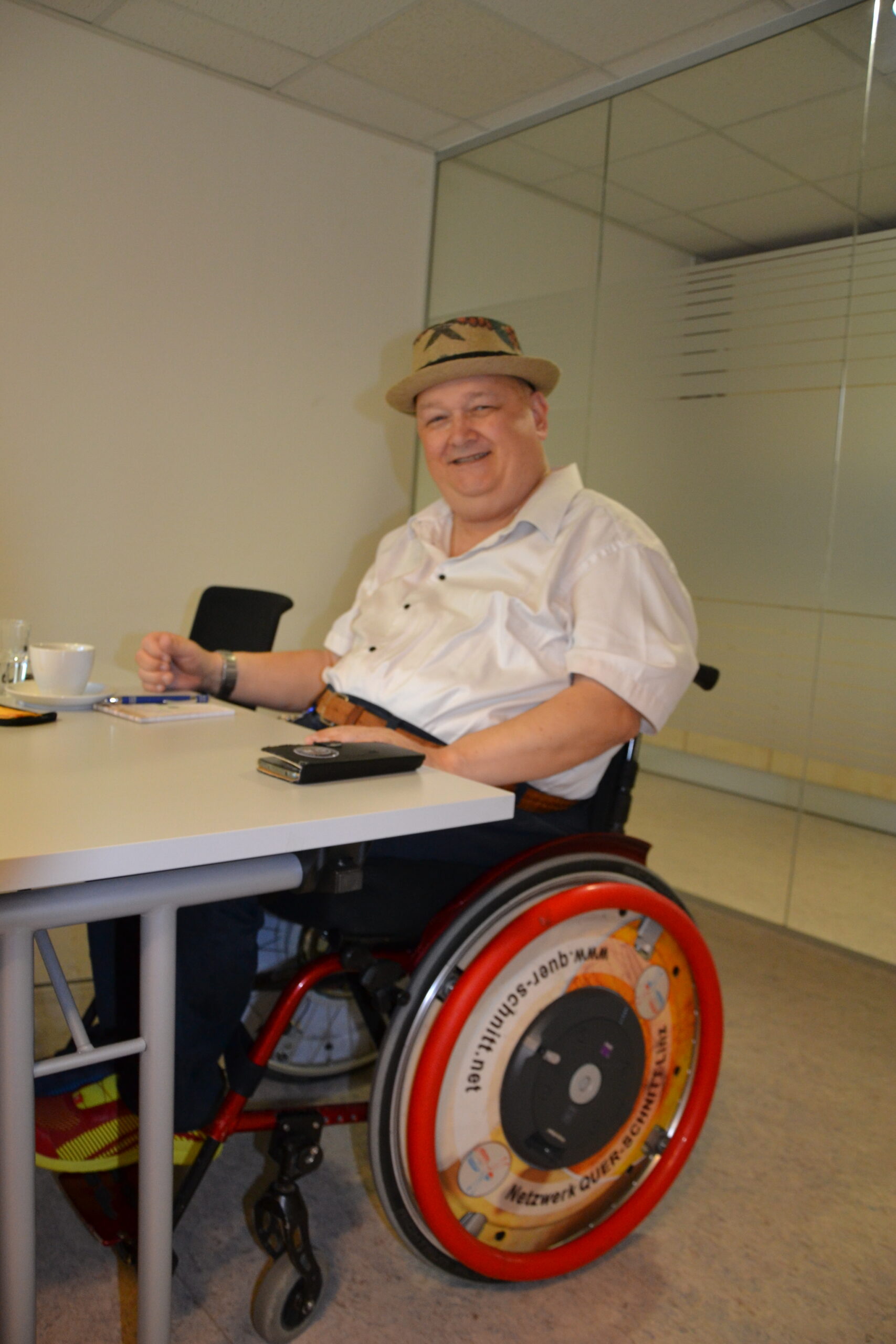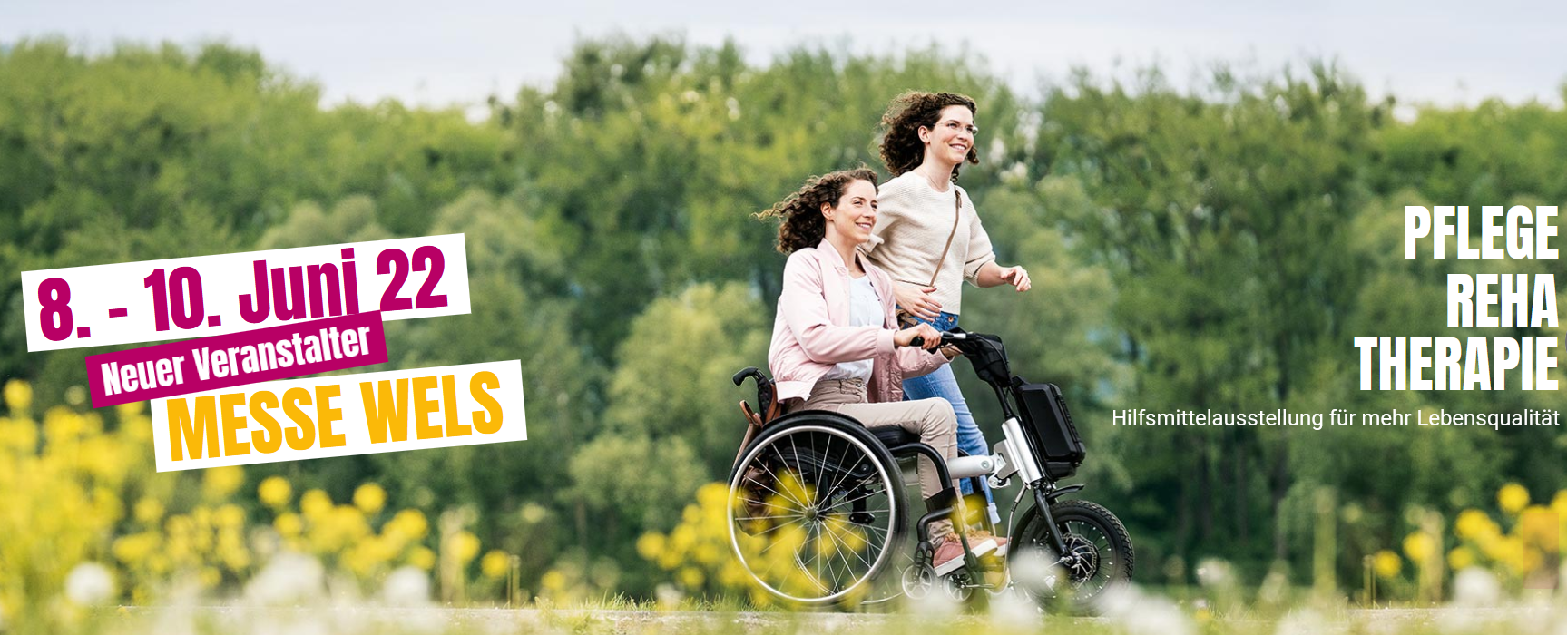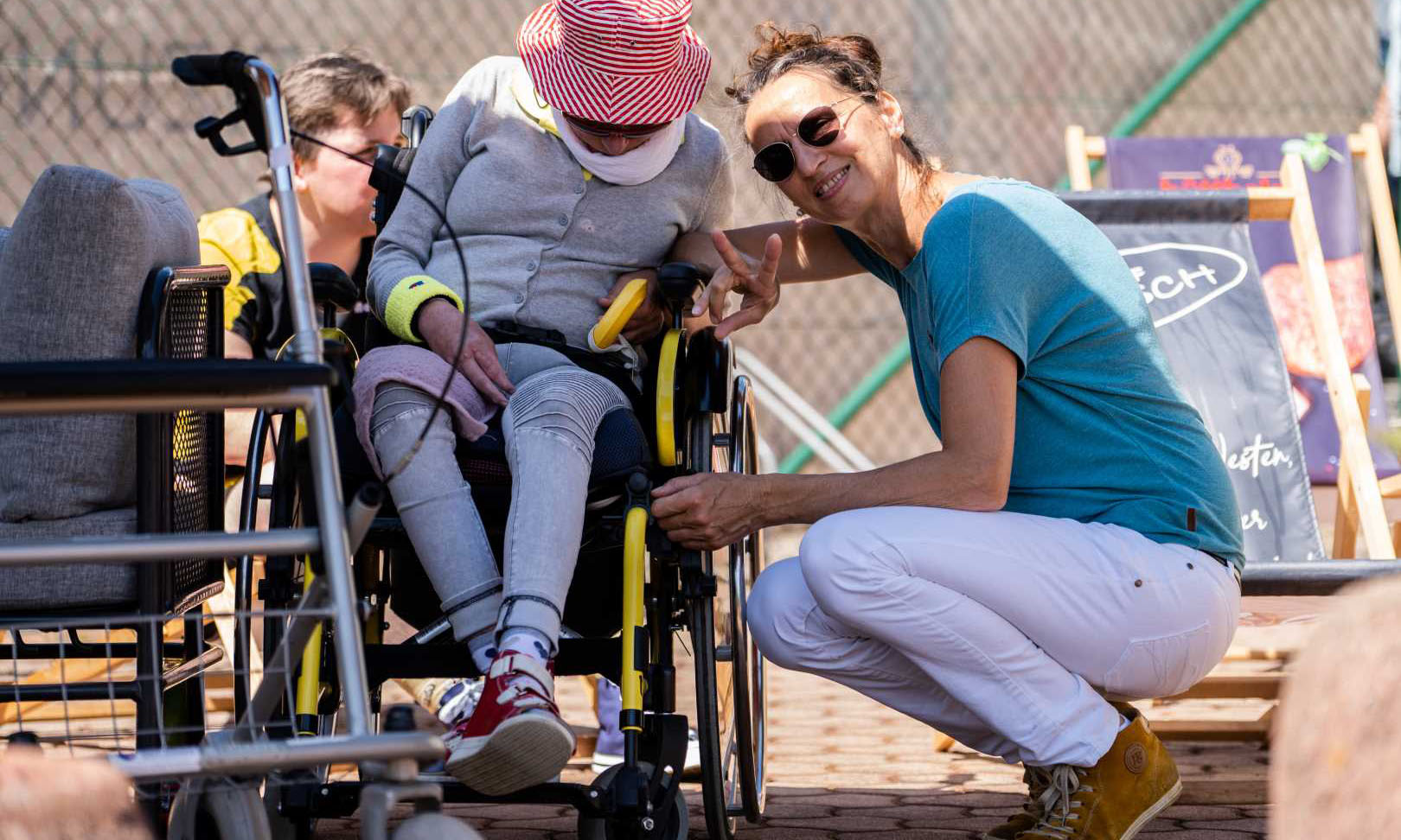 | alt: | Zwei erwachsene im Aussenbereich, eine davon sitzt im Rollstuhl. |