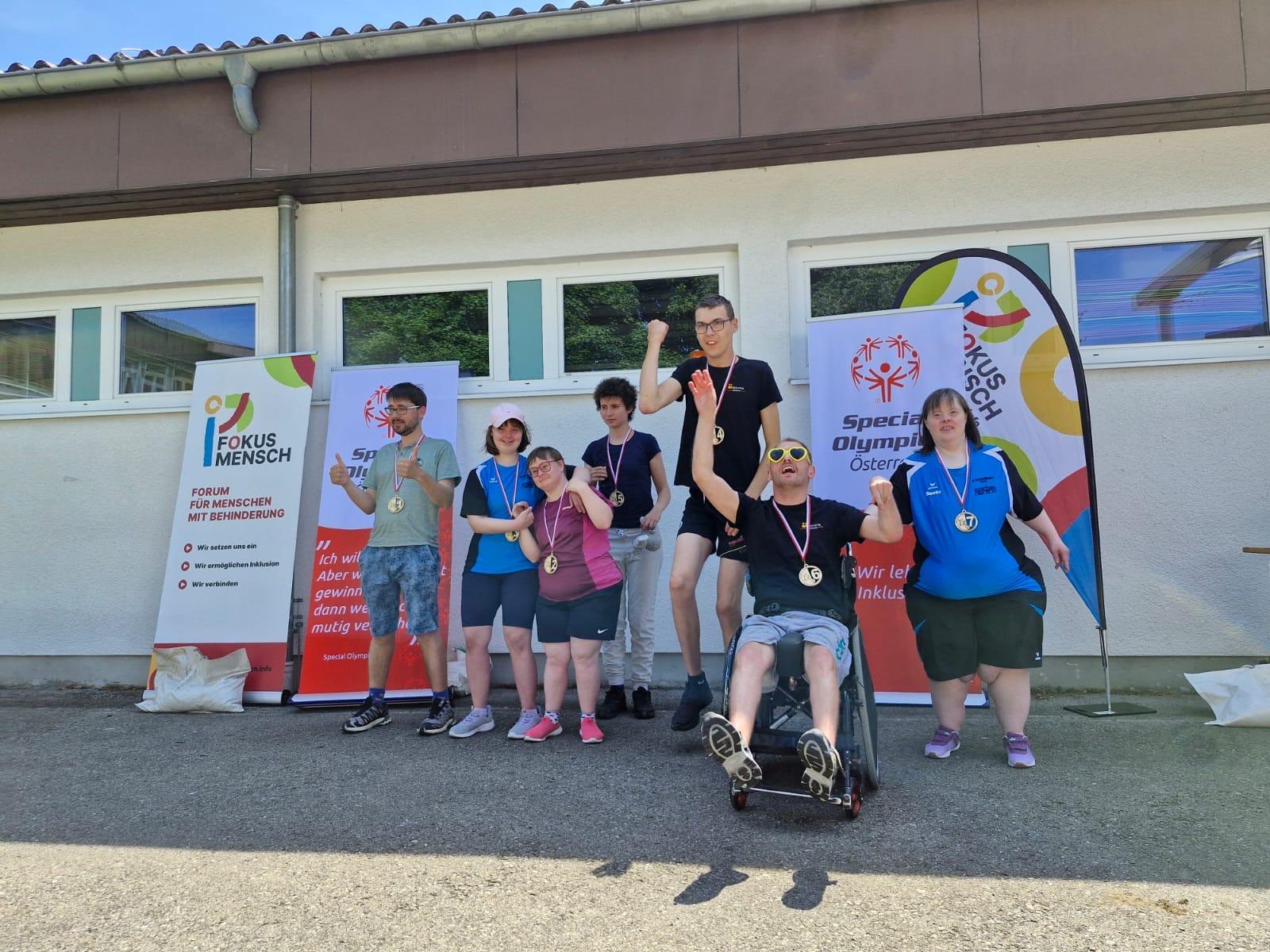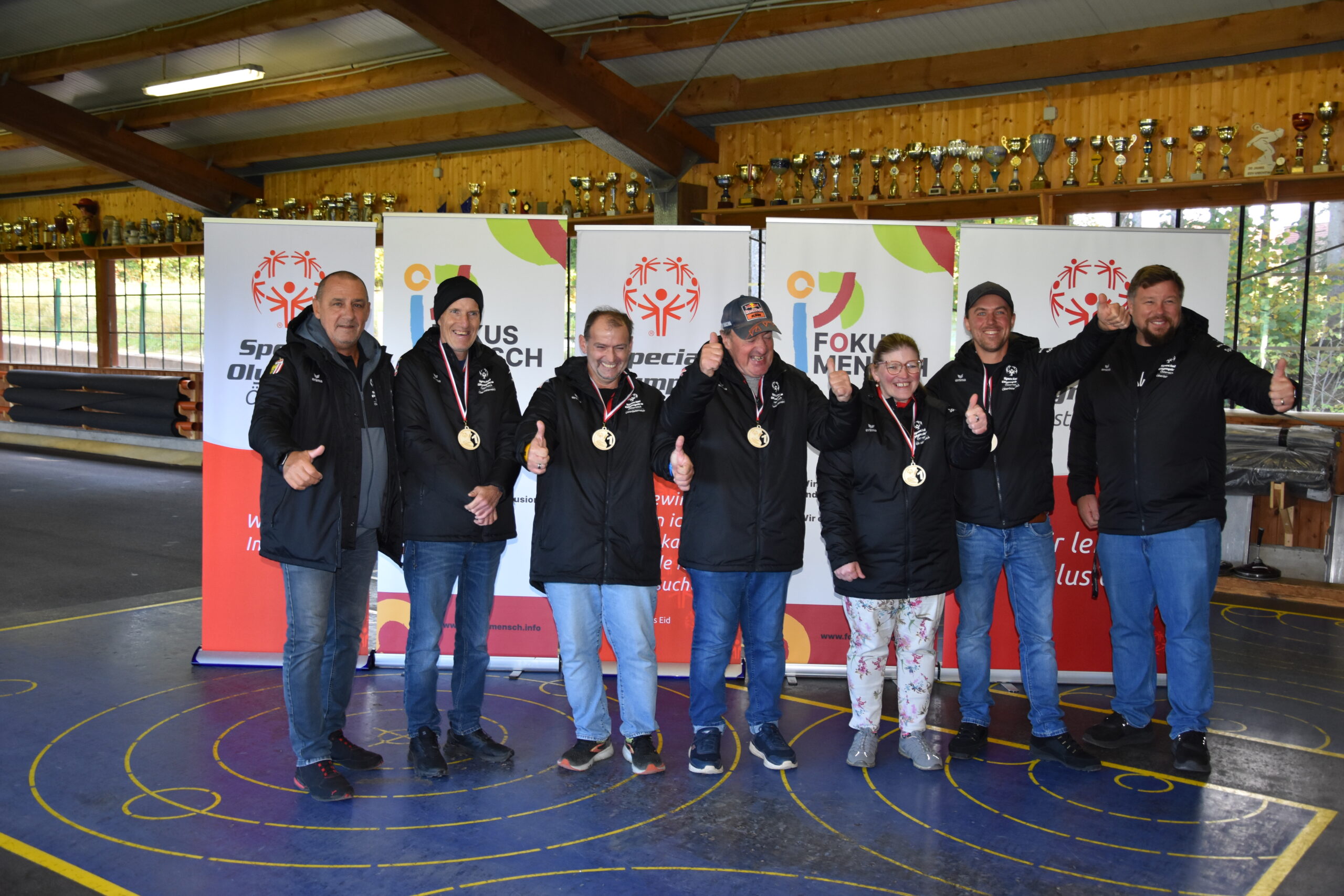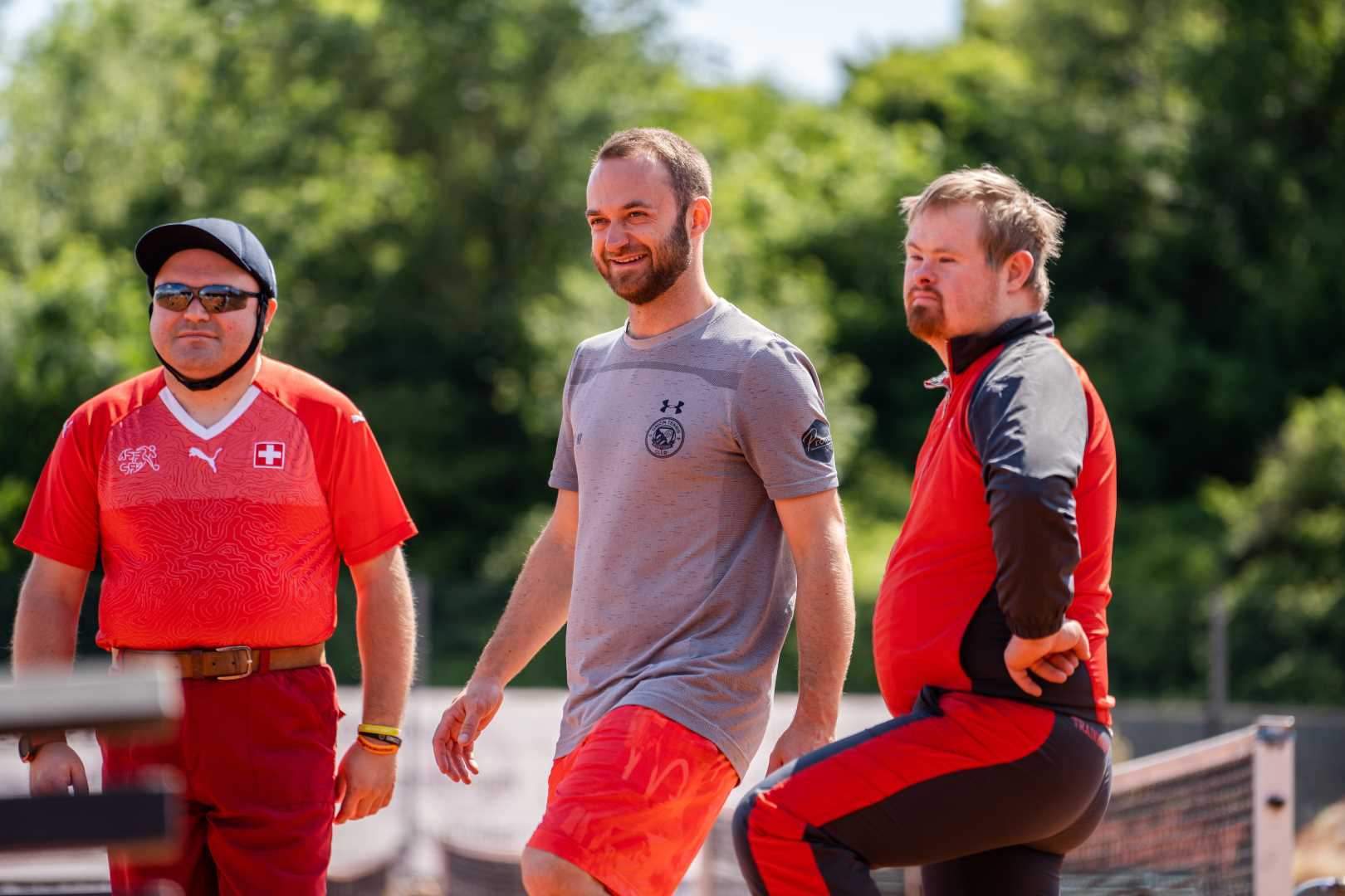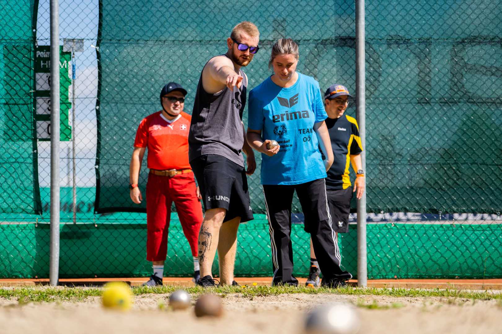 | alt: | Mehrere junge Menschen spielen im Aussenbereich gemeinsam Boccia |