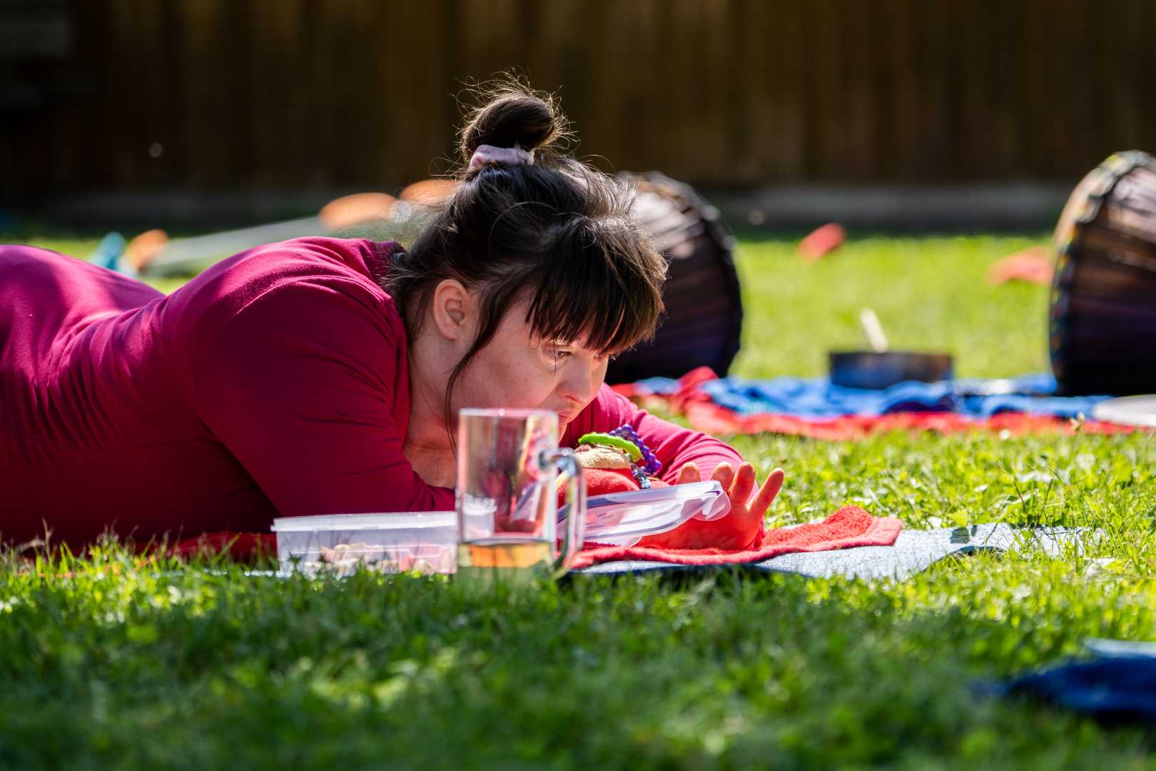 | alt: | Mehrere Personen sitzen auf einer Wiese und spielen Trommeln. |