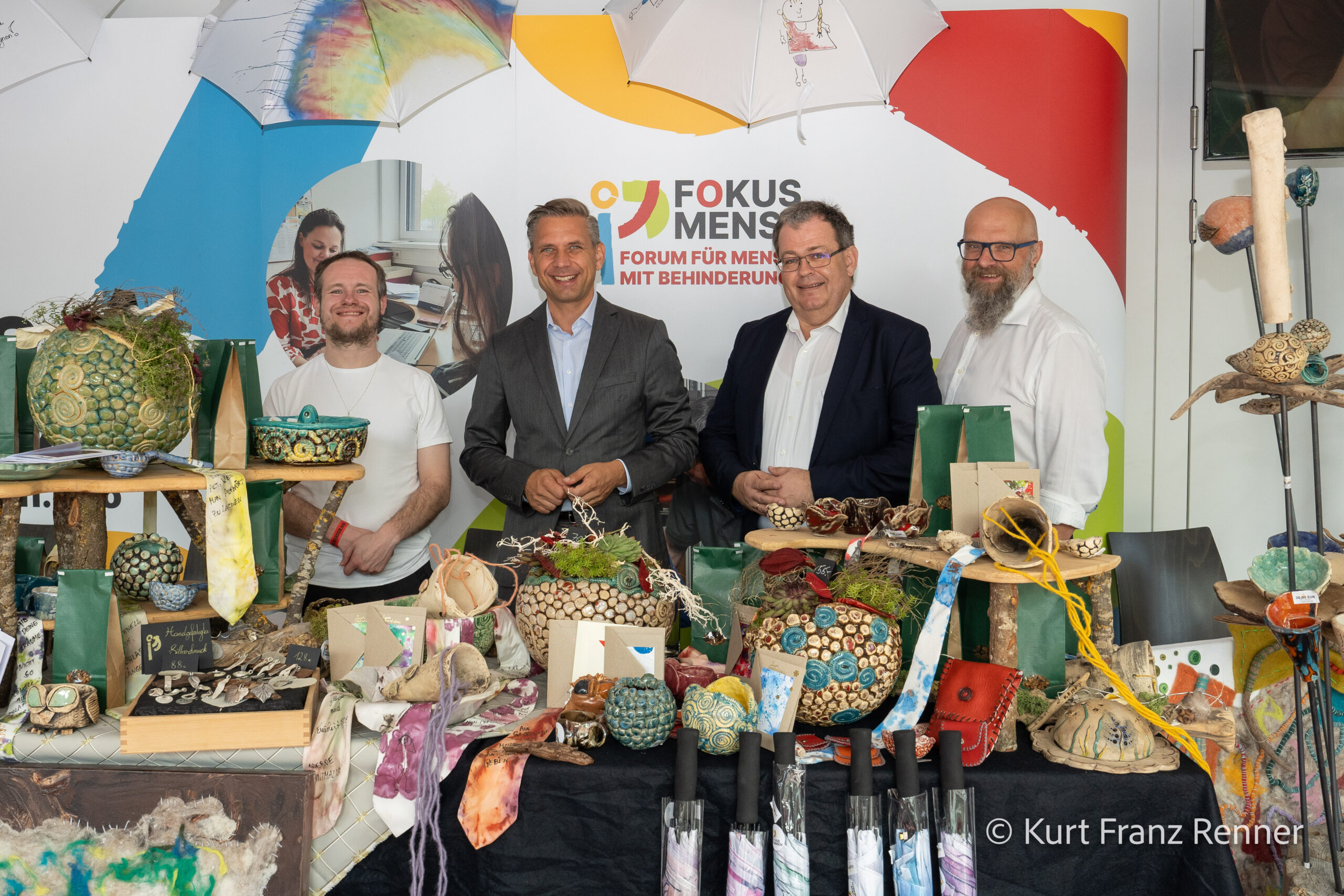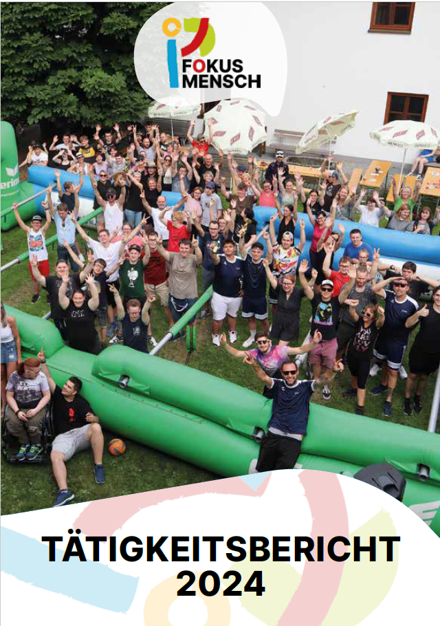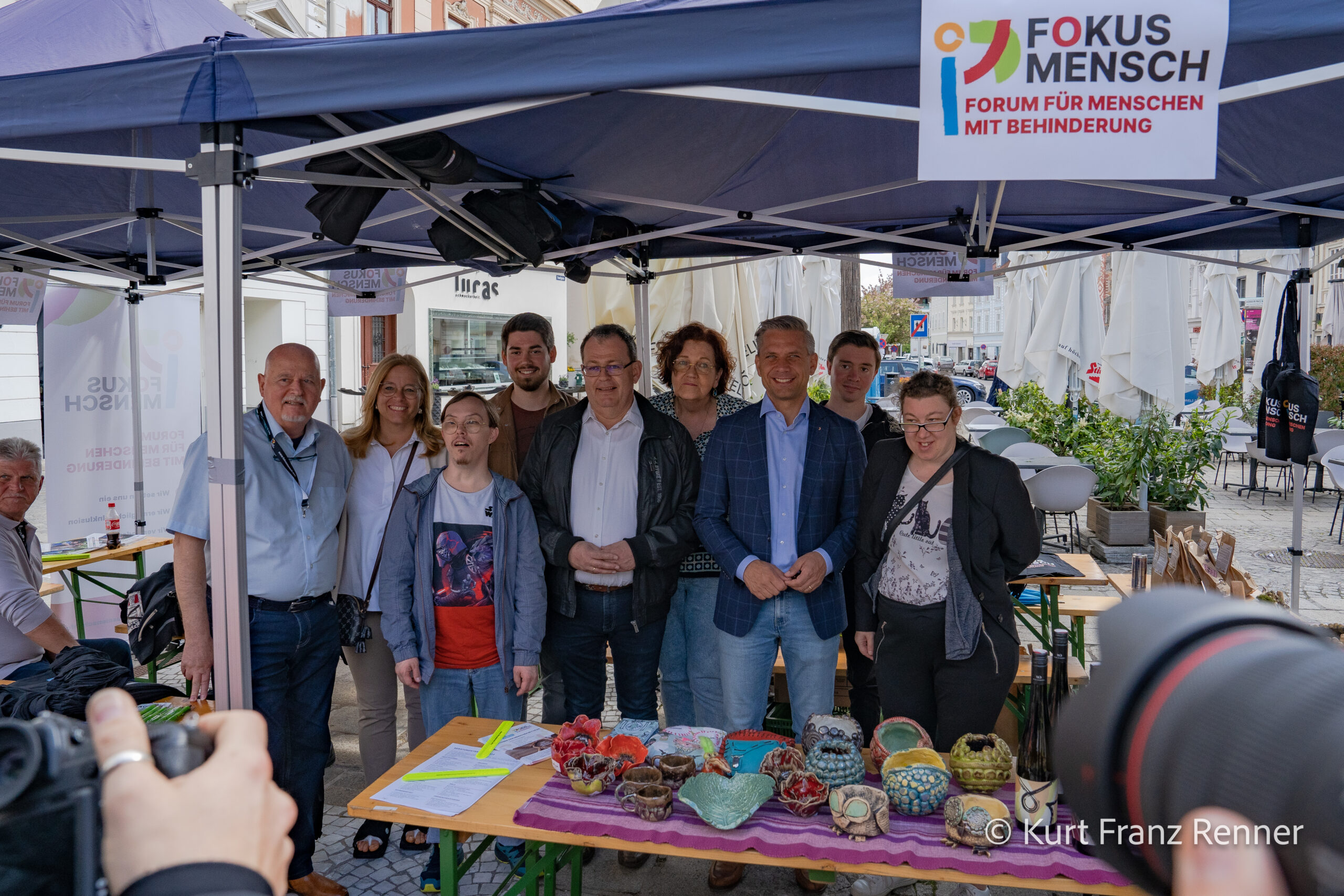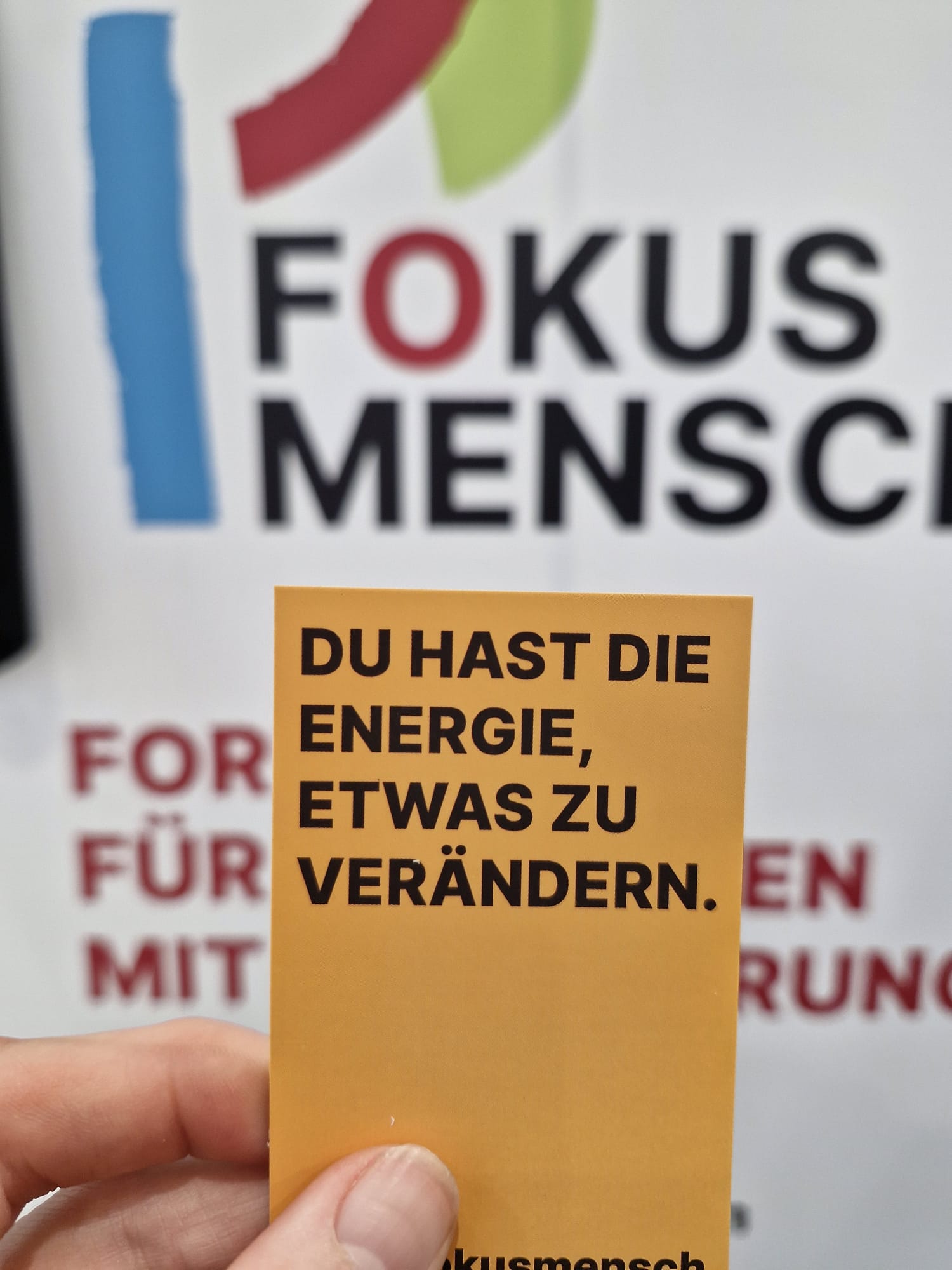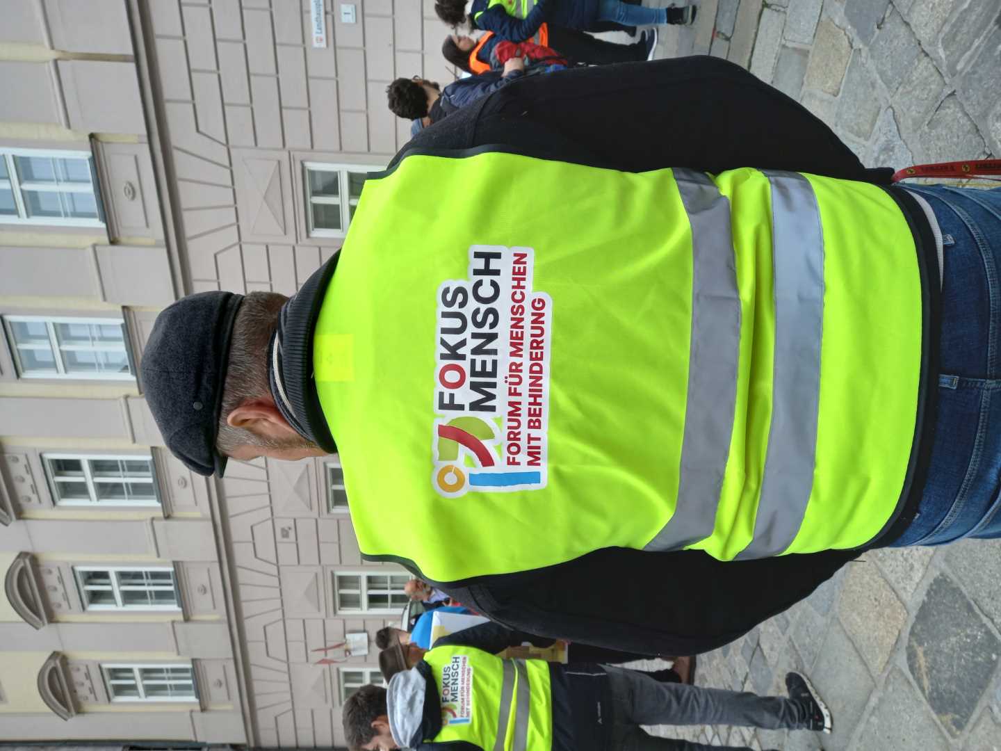| alt: | Ein Mann steht im freien und trägt eine Weste mit der Aufschrift "Fokus Mensch, Forum für Menschen mit Behinderung". Im Hintegrund stehen weitere Menschen. |