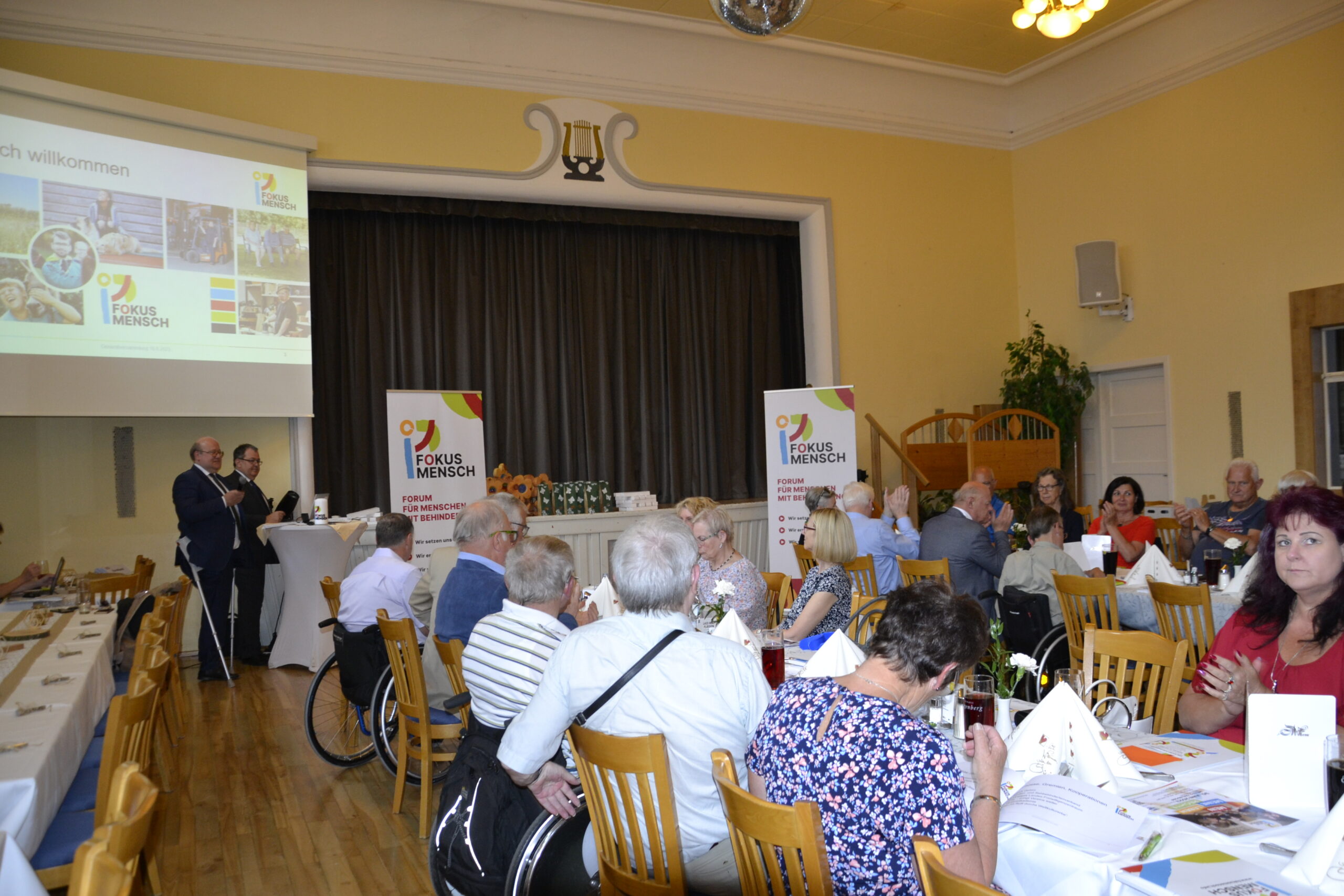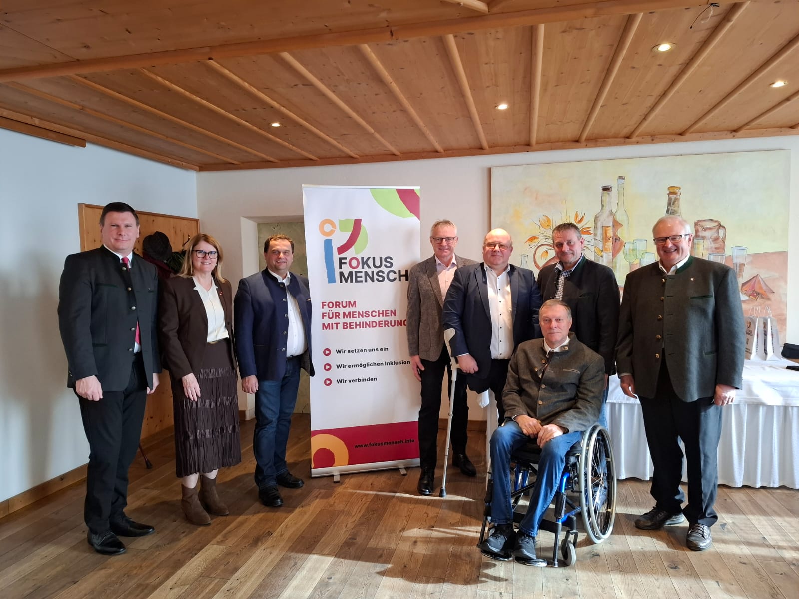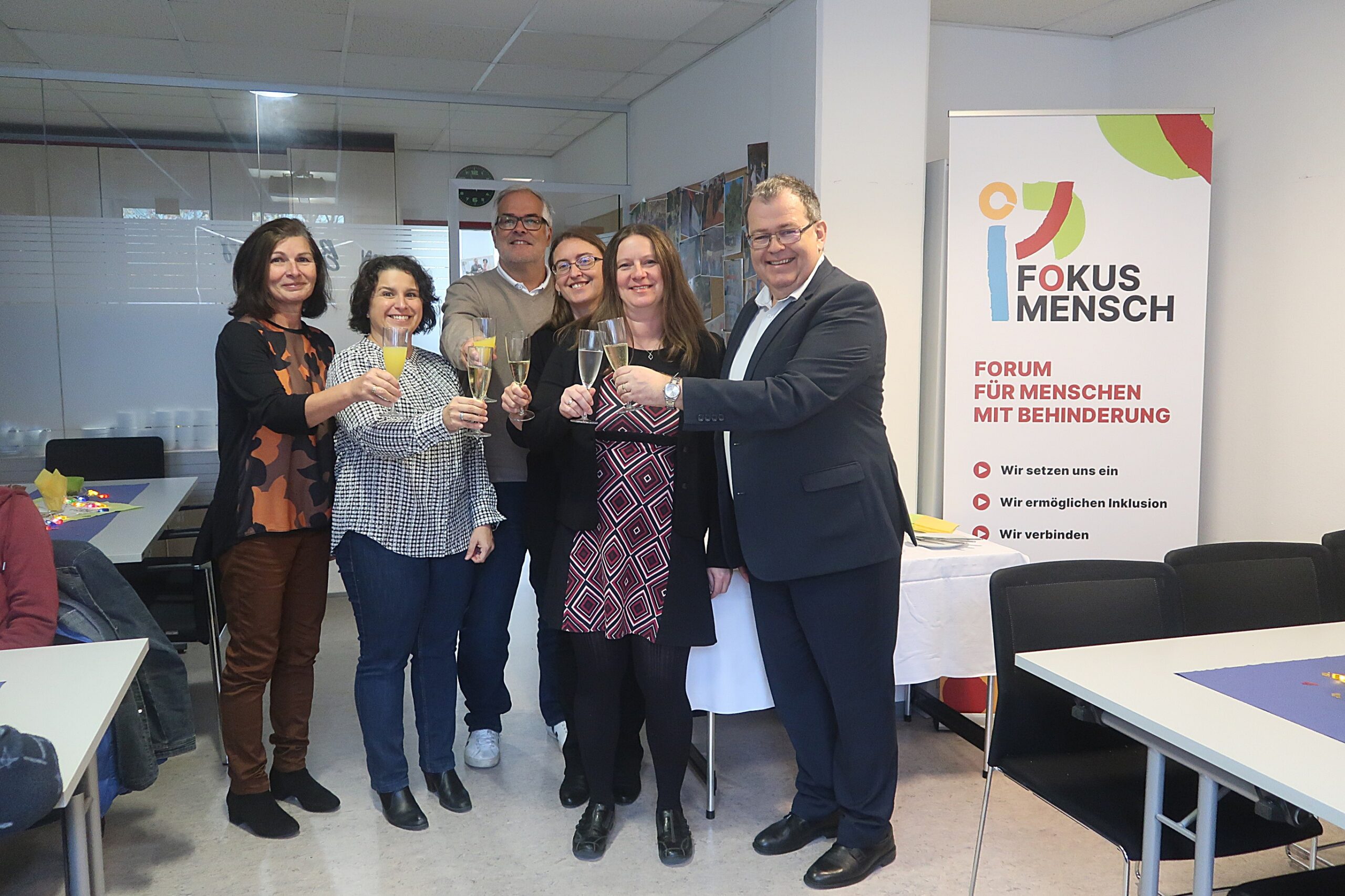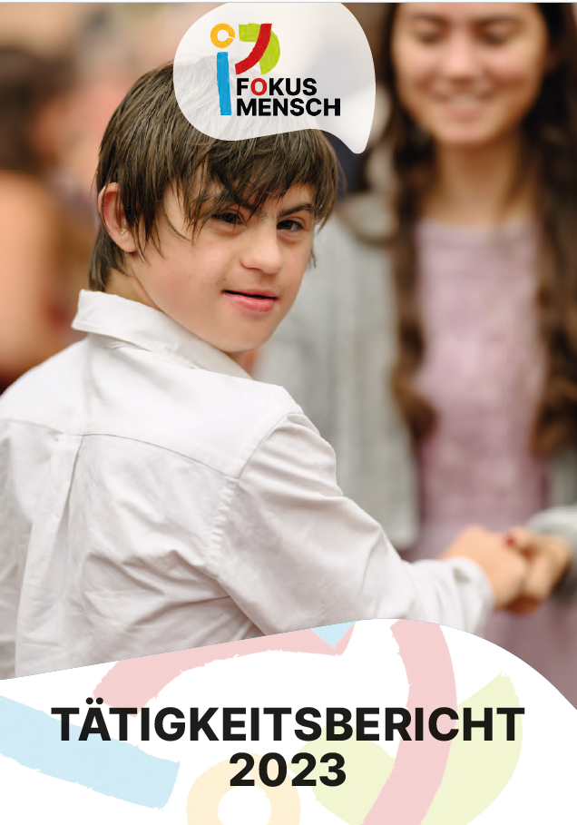 | alt: | Ein Mann steht im freien und trägt eine Weste mit der Aufschrift "Fokus Mensch, Forum für Menschen mit Behinderung". Im Hintegrund stehen weitere Menschen. |
