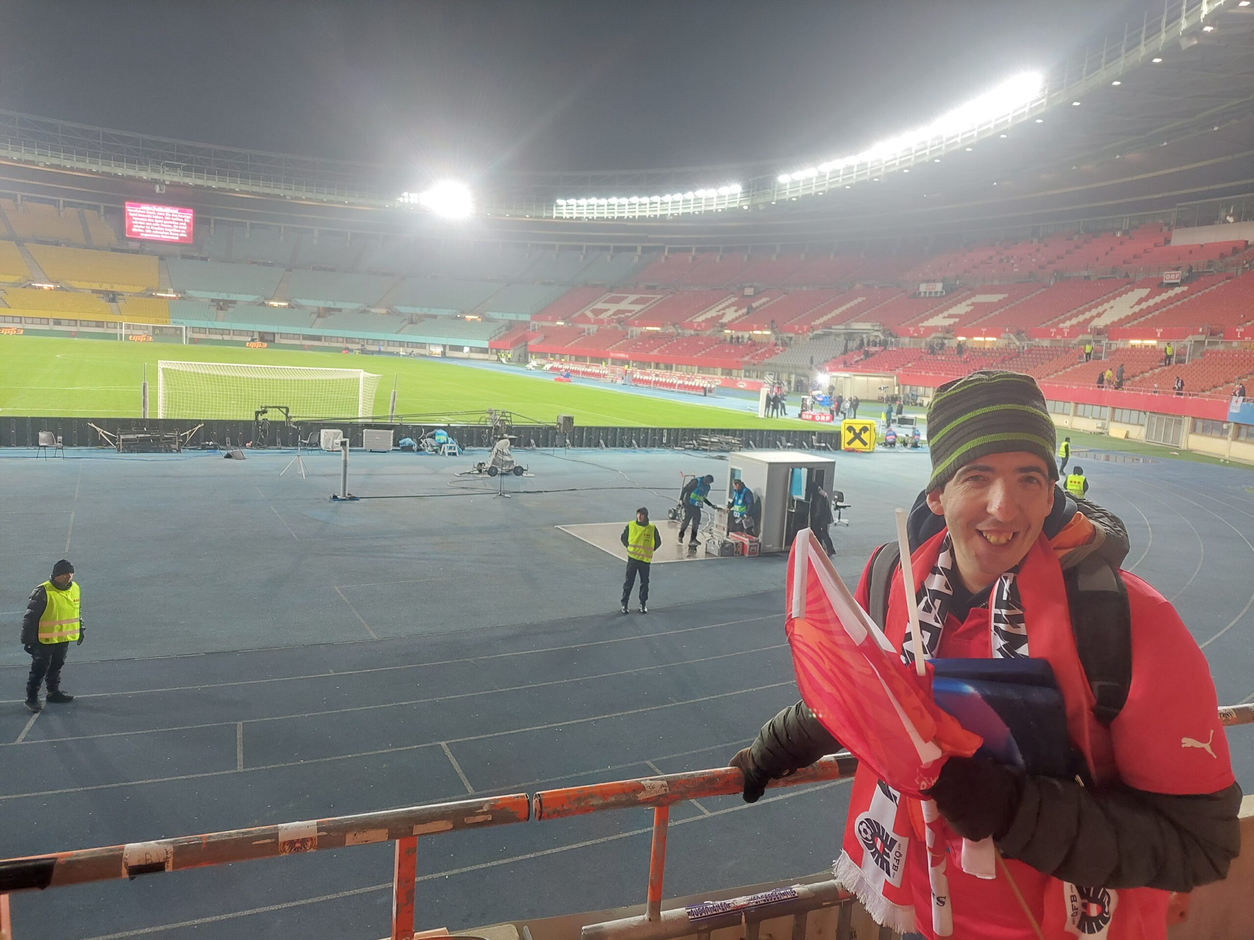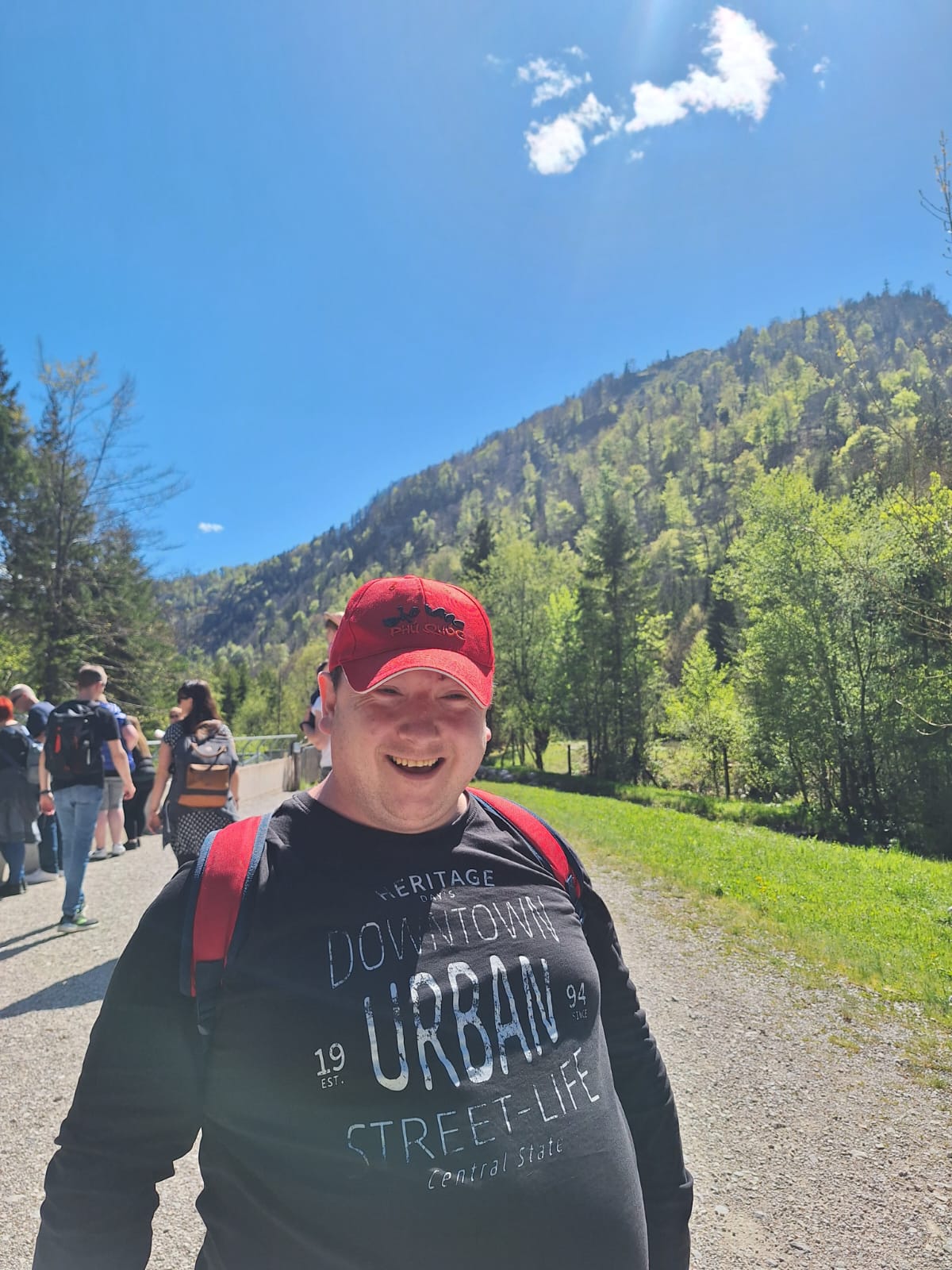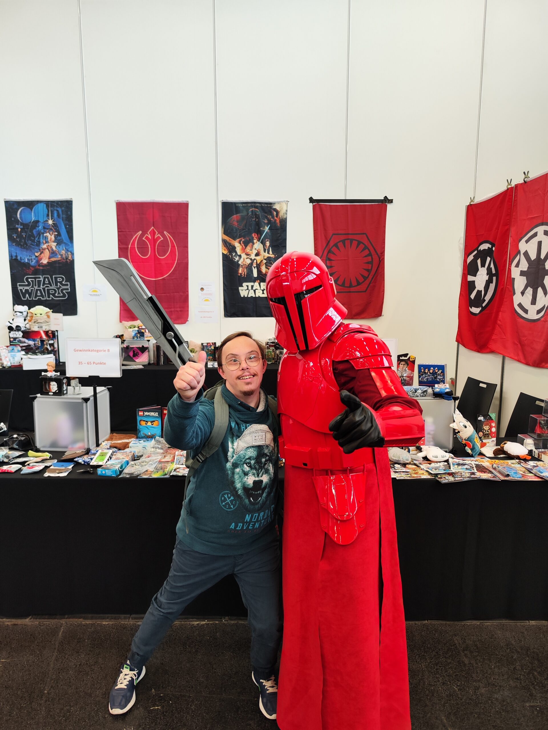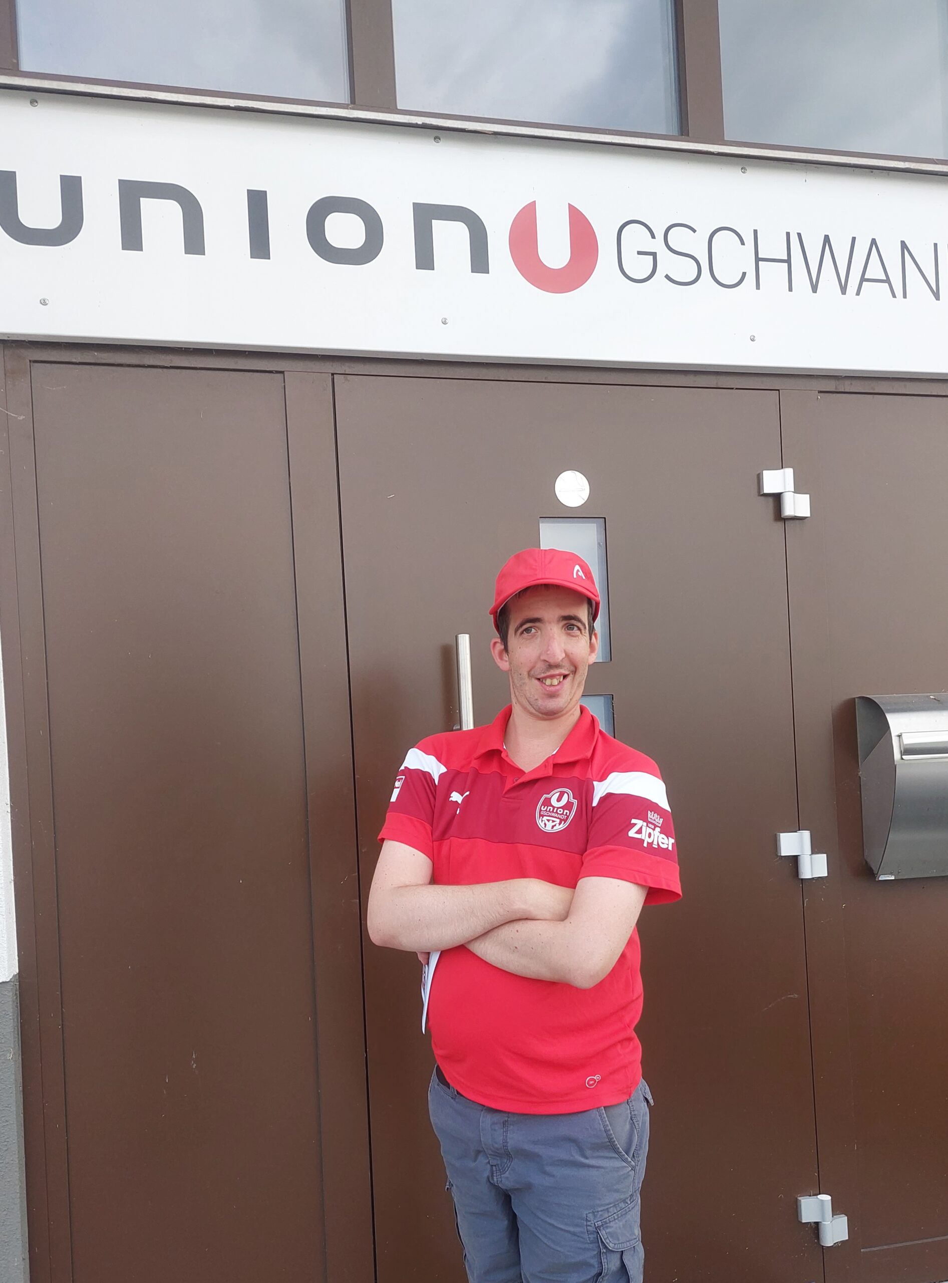 | alt: | Ein Mann steht im freien und trägt eine Weste mit der Aufschrift "Fokus Mensch, Forum für Menschen mit Behinderung". Im Hintegrund stehen weitere Menschen. |