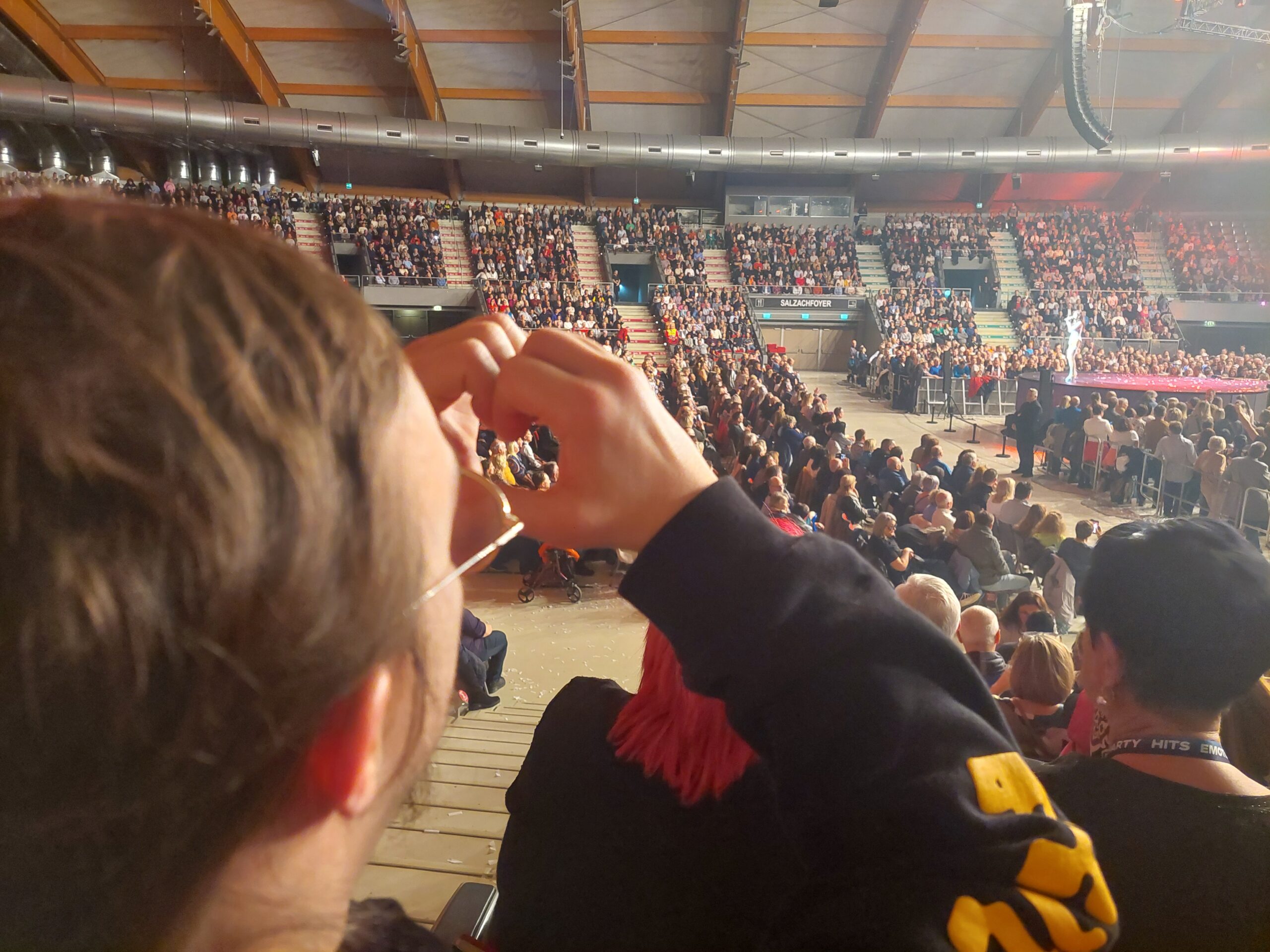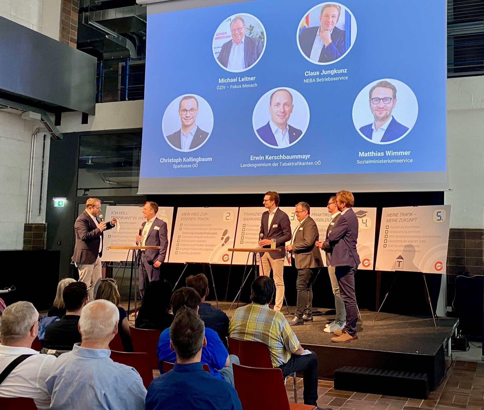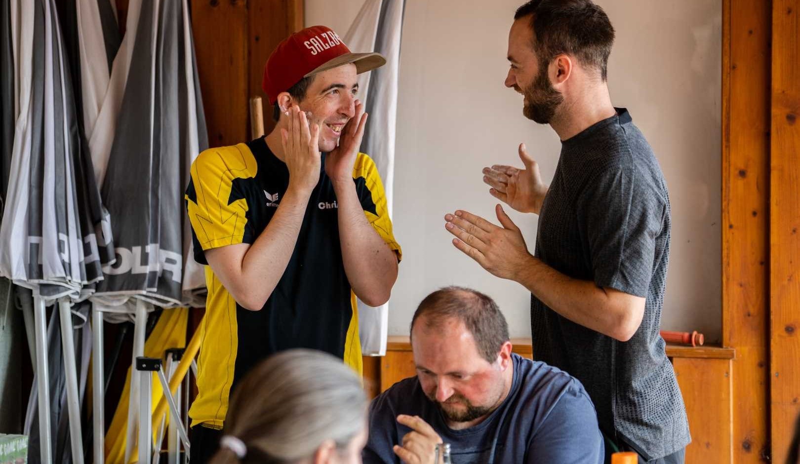| alt: | Zwei Männer stehen sich gegenüber und sprechen miteinander in einem Innenraum. Im vordergrund sind weitere Personen zu sehen. |