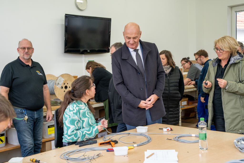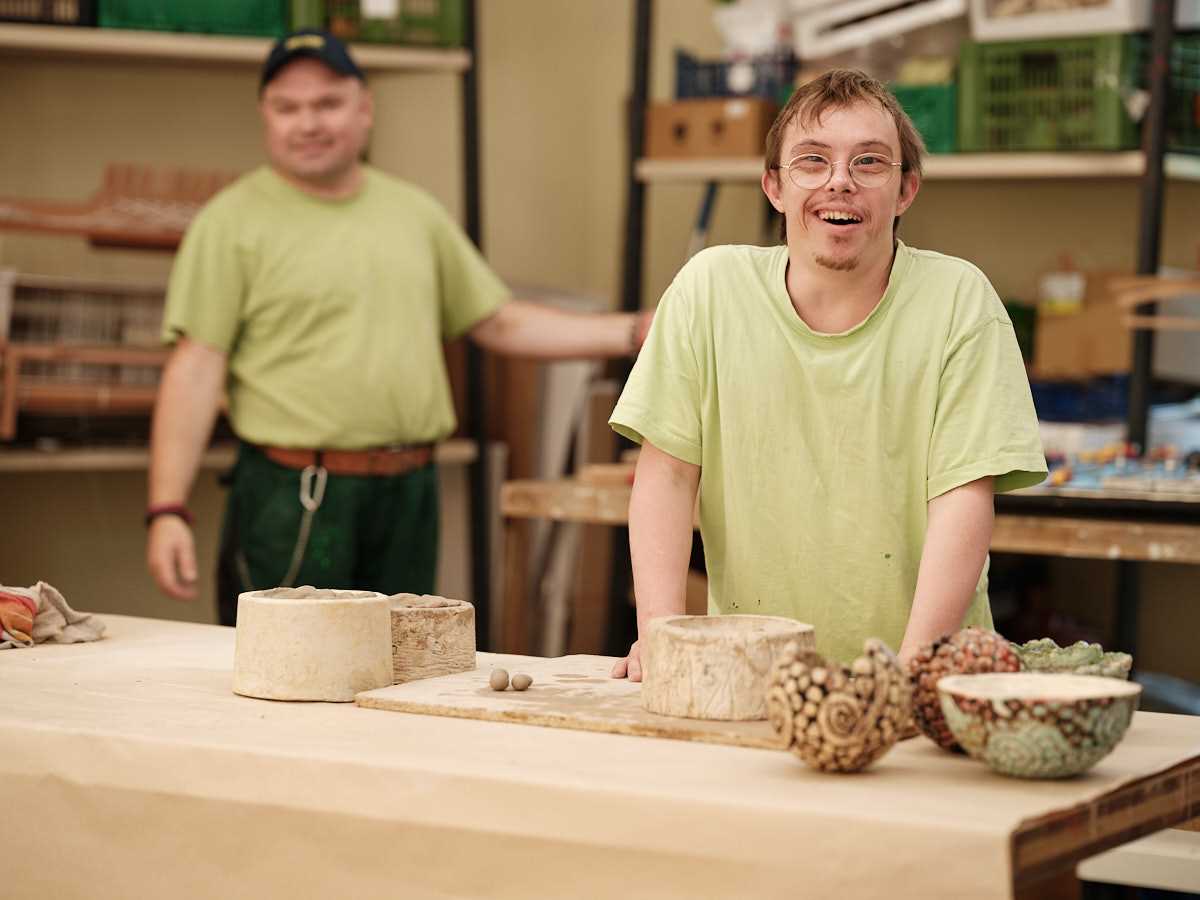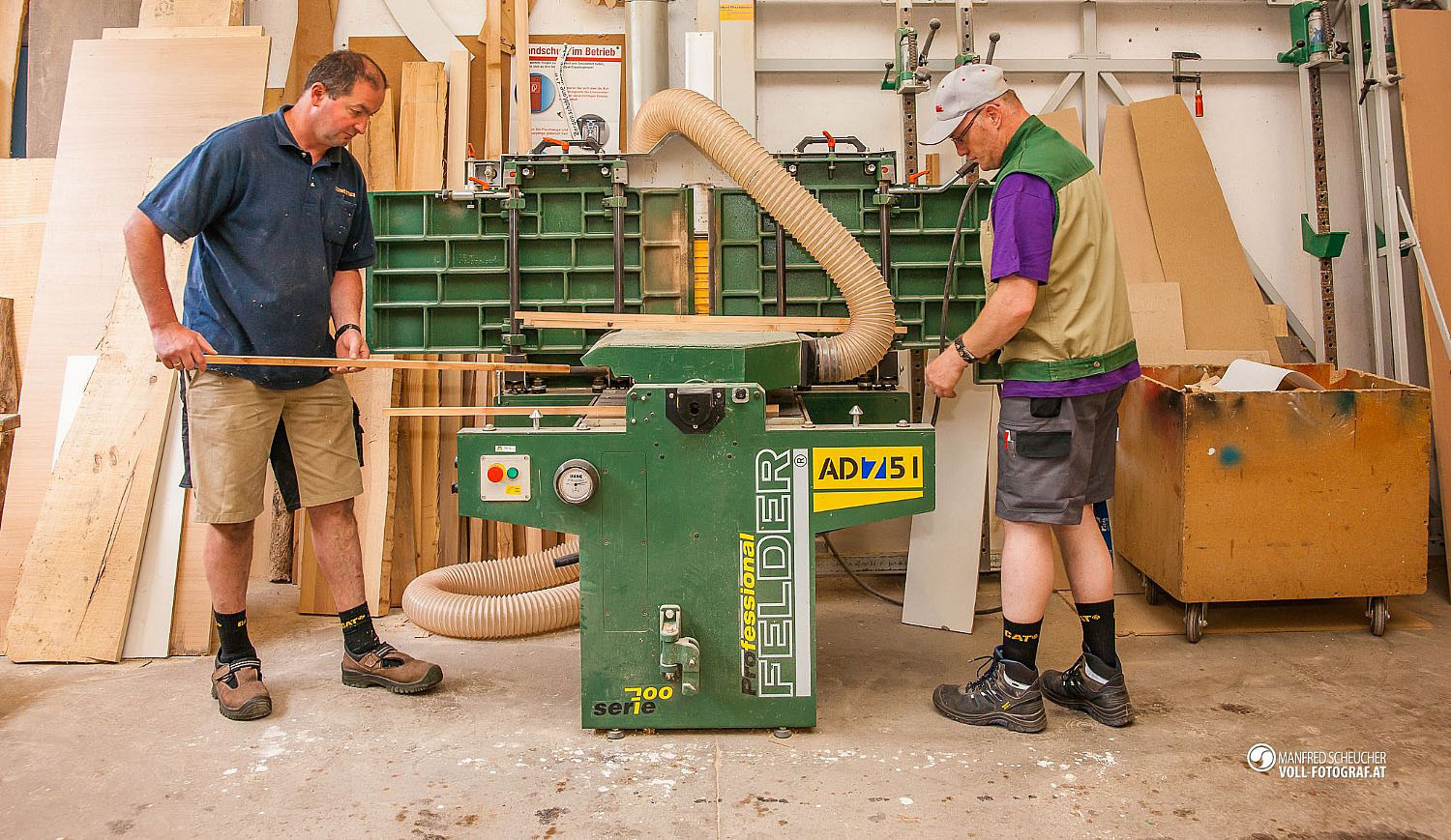 | alt: | Zwei Männer stehen in einer Werkstatt, im Vordergrund sind mehrere Werkstücke zu sehen. |