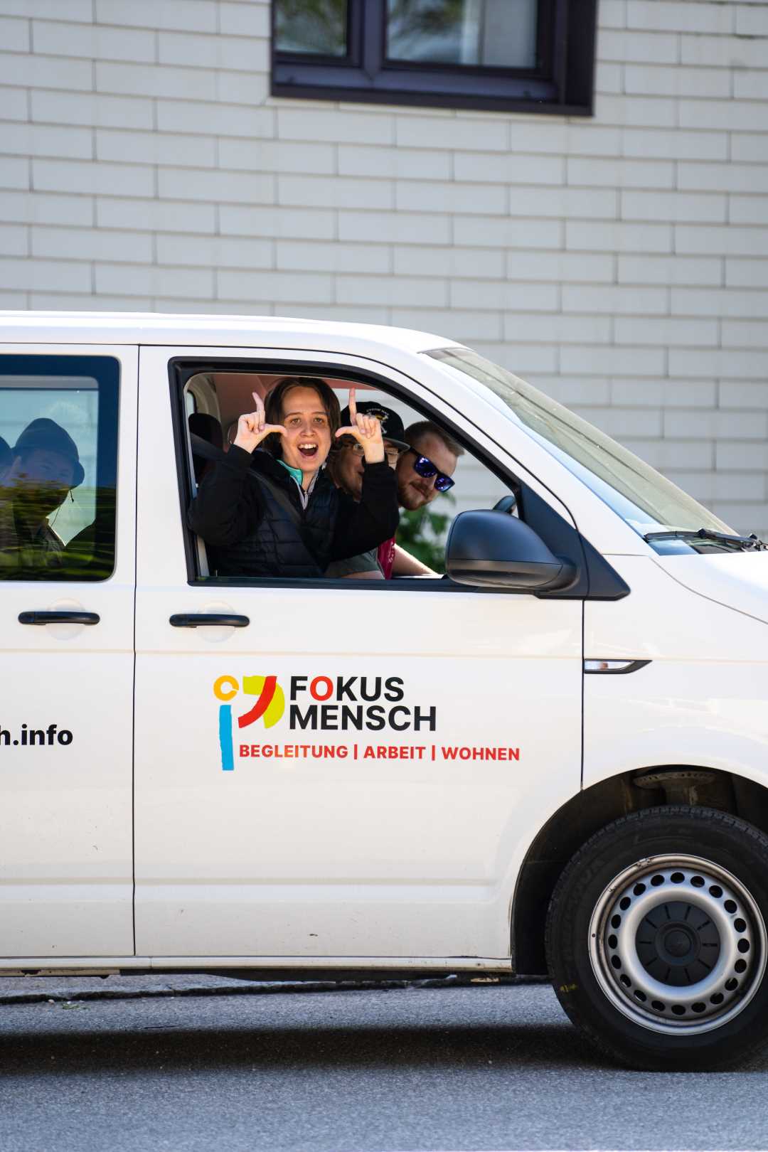 | alt: | Zwei Personen sitzen in einem Fahrzeug mit FOKUS-MENSCH-Beschriftung und blicken aus dem offenen Fenster. |