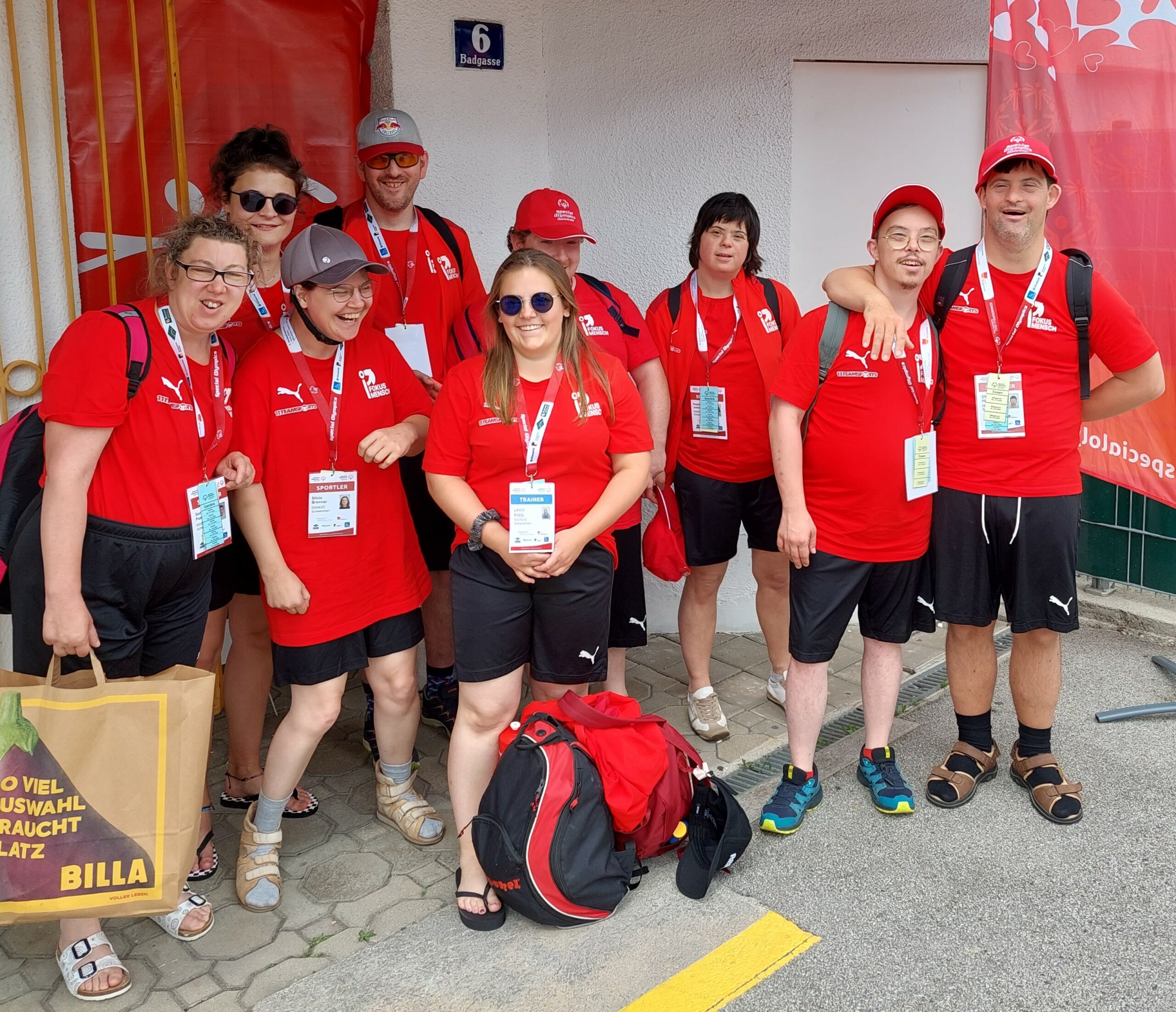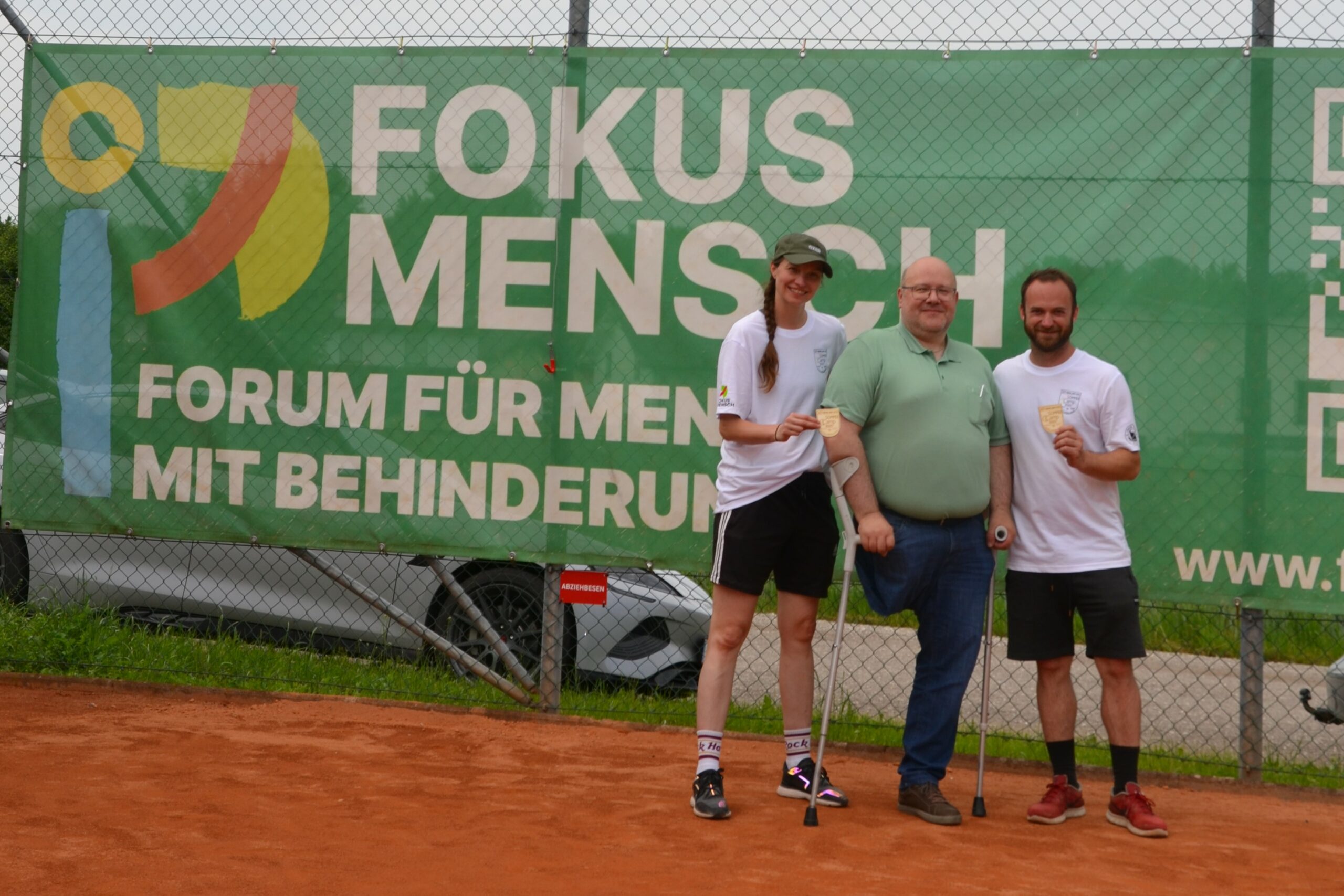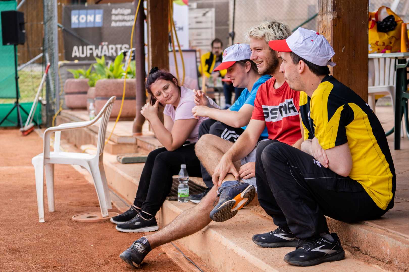 | alt: | Gruppe von Personen steht auf einem Tennisplatz, mehrere halten Tennisschläger in der Hand und heben die Arme. |