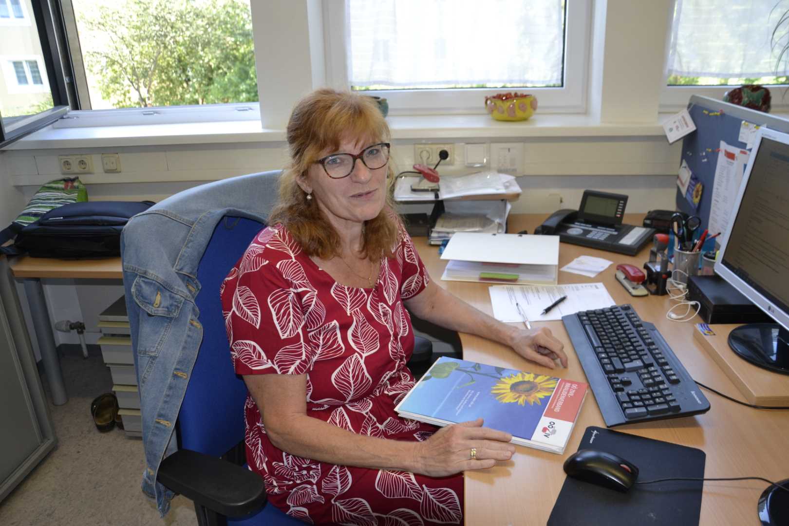 | alt: | Eine Frau sitzt an einem Schreibtisch in einem Büro und arbeitet am Computer. |