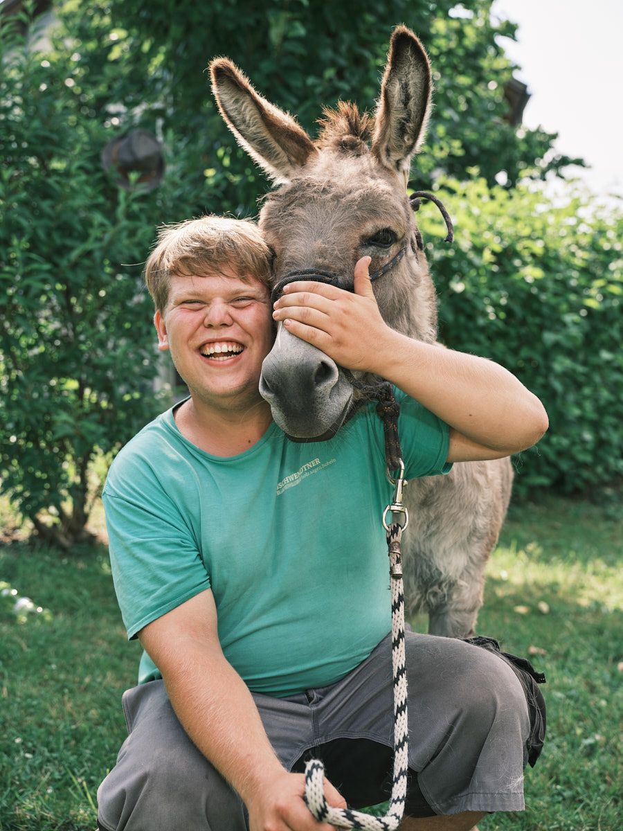 | alt: | Ein junger Mann steht im Freien neben einem Esel und hält das Tier am Halfter. |