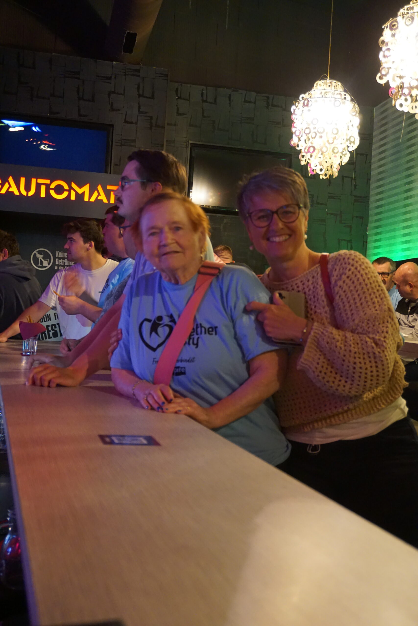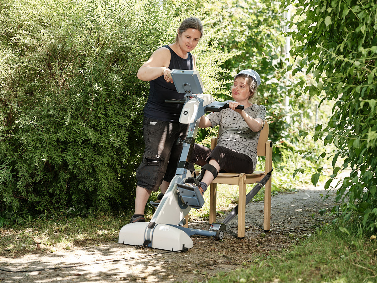 | alt: | Zwei Frauen befinden sich im Freien neben einem Trainingsgerät, eine Person sitzt auf dem Gerät, die andere steht daneben und unterstützt. |