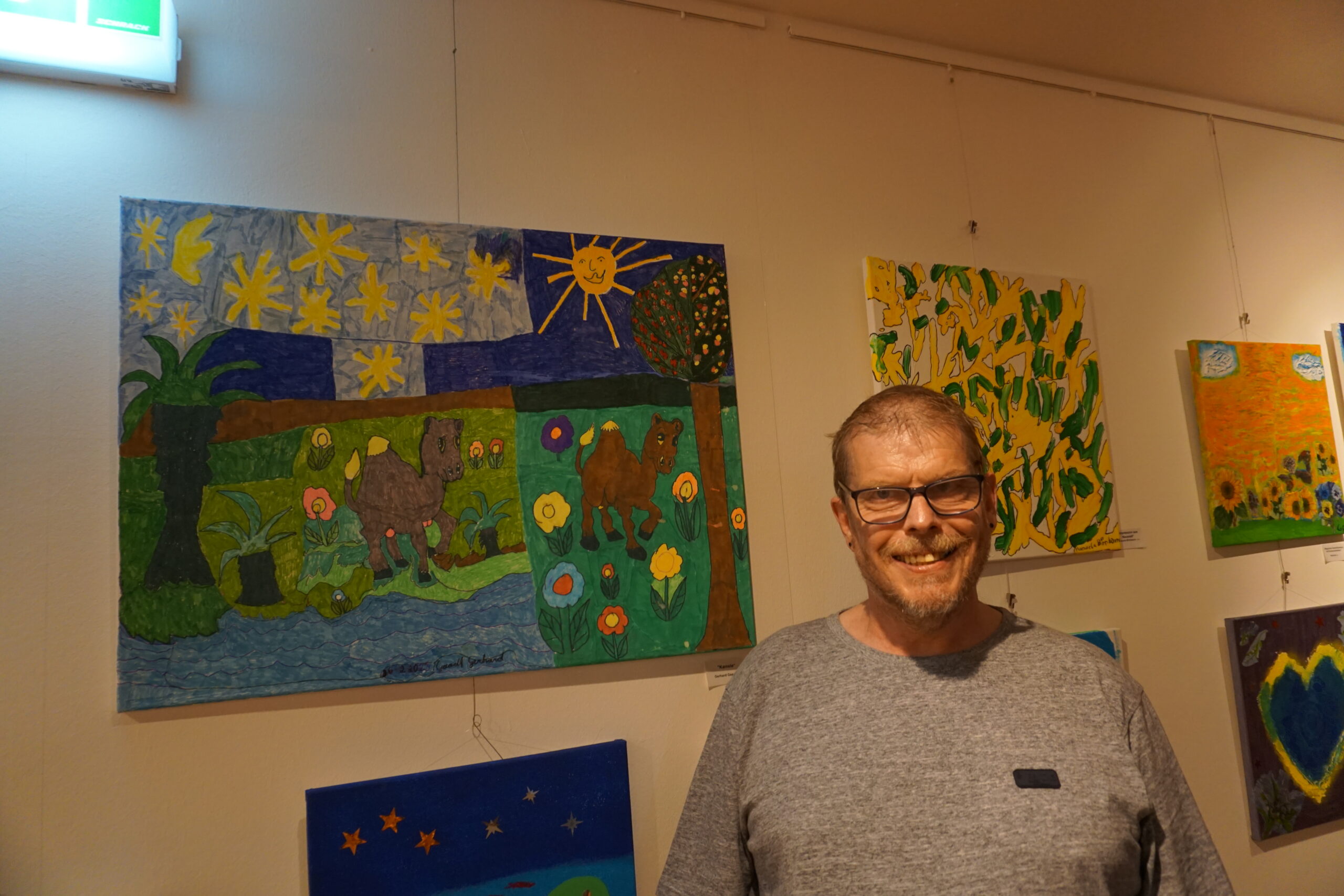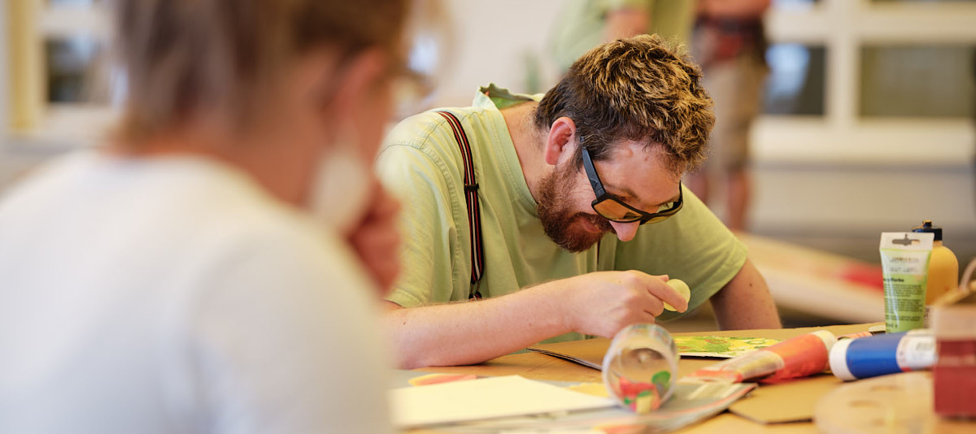 | alt: | Mann mit Brille sitzt an einem Tisch und arbeitet mit Farben an einem Werkstück. |