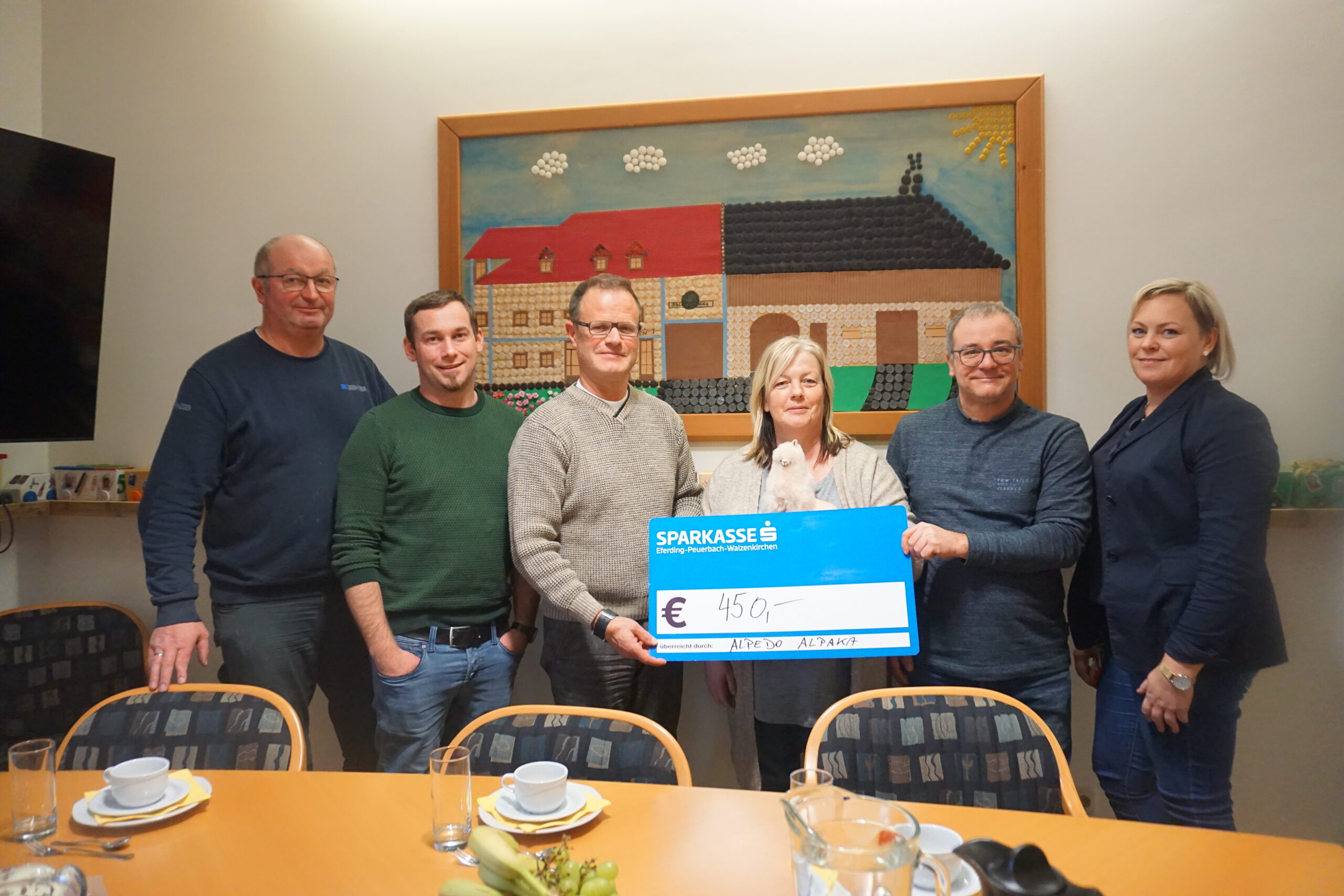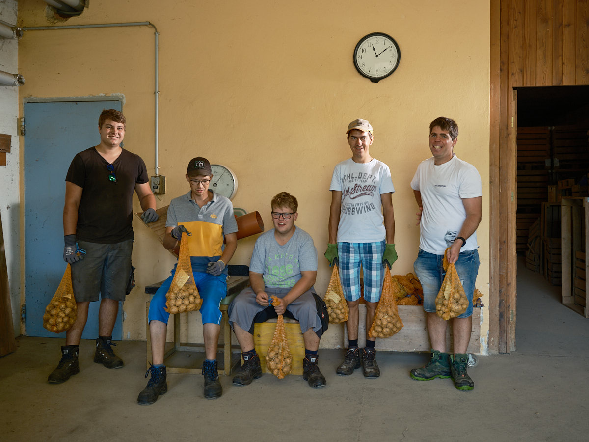 | alt: | Fünf Personen stehen nebeneinander vor einer Wand und halten Gelbe Kartoffelsäcke in den Händen. |