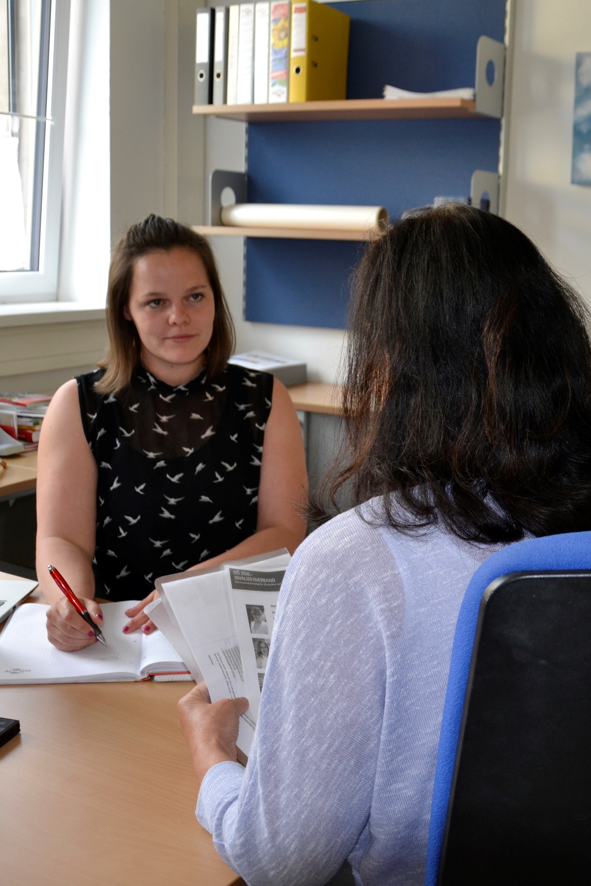 | alt: | Zwei Frauen sitzen sich in einem Büro gegenüber und führen ein Beratungsgespräch mit Unterlagen auf dem Tisch – persönliche Beratung in ruhiger Atmosphäre. |