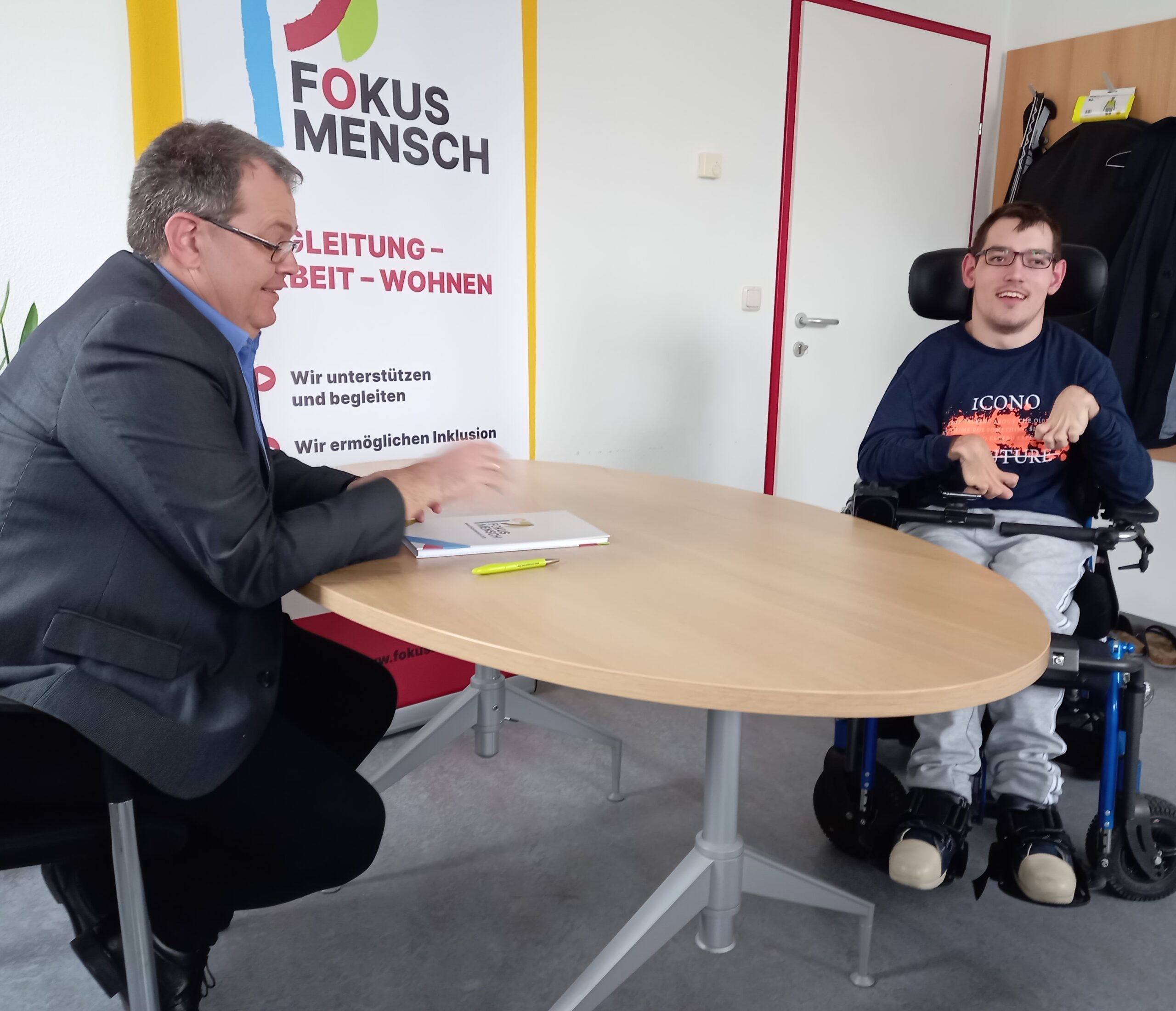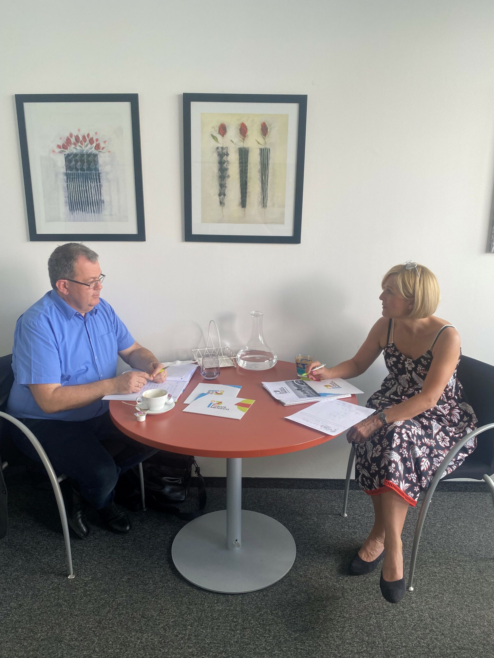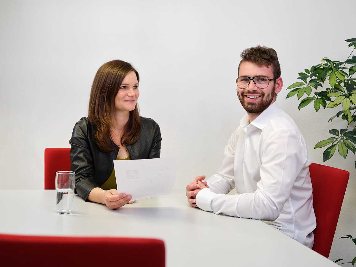 | alt: | Zwei Personen sitzen sich an einem Tisch gegenüber und führen ein Gespräch mit Unterlagen – Bewerbungsgespräch oder berufliche Beratung. |