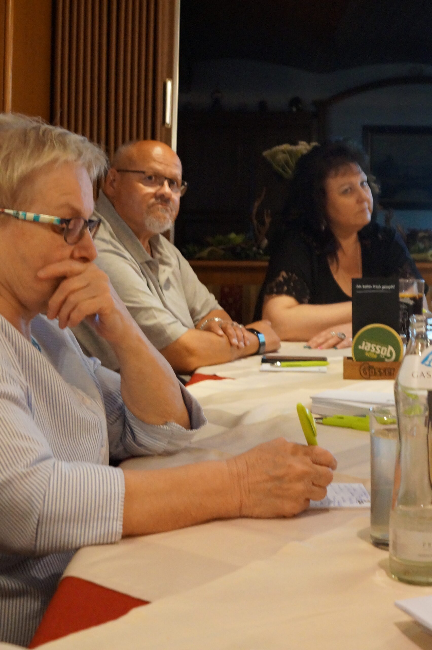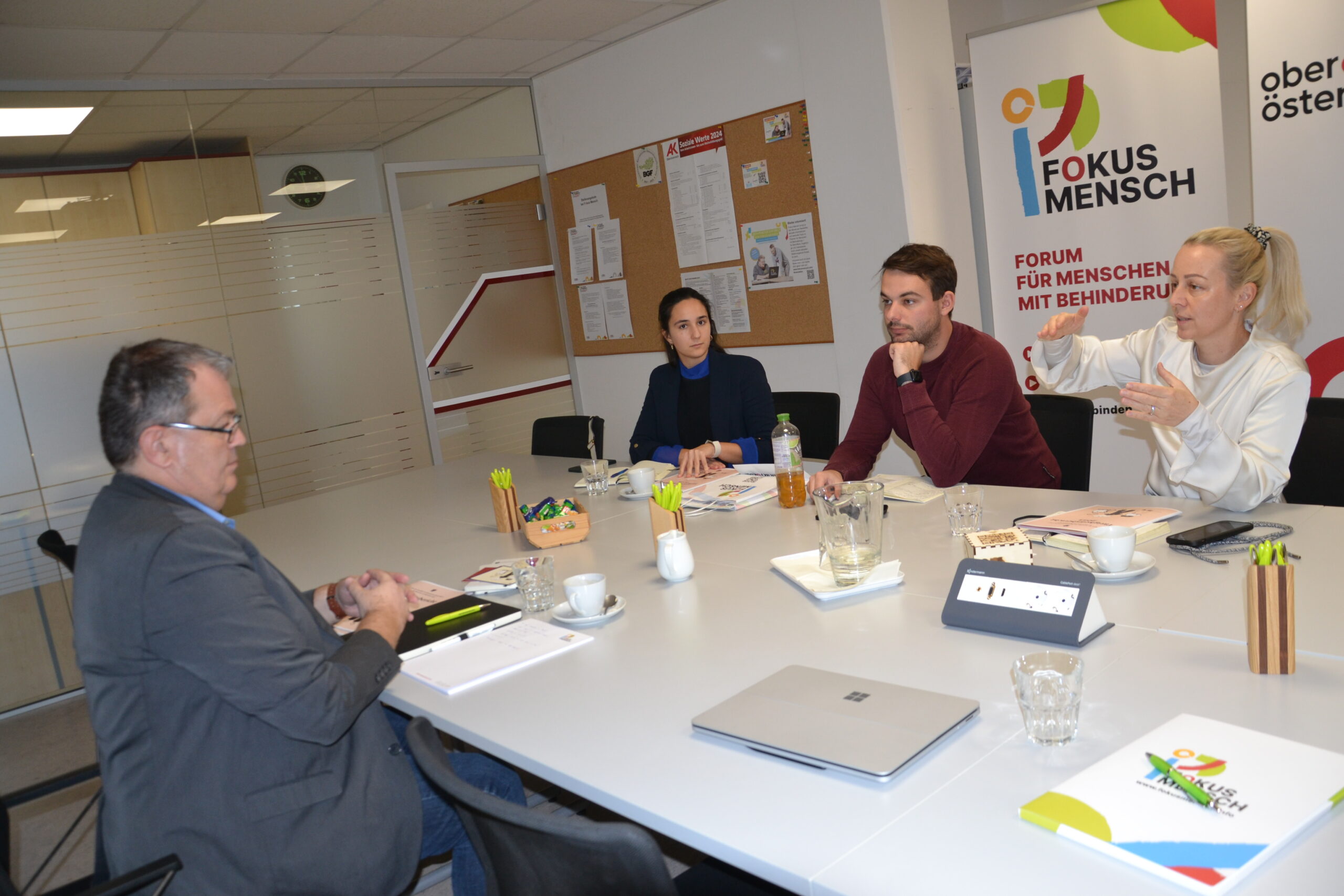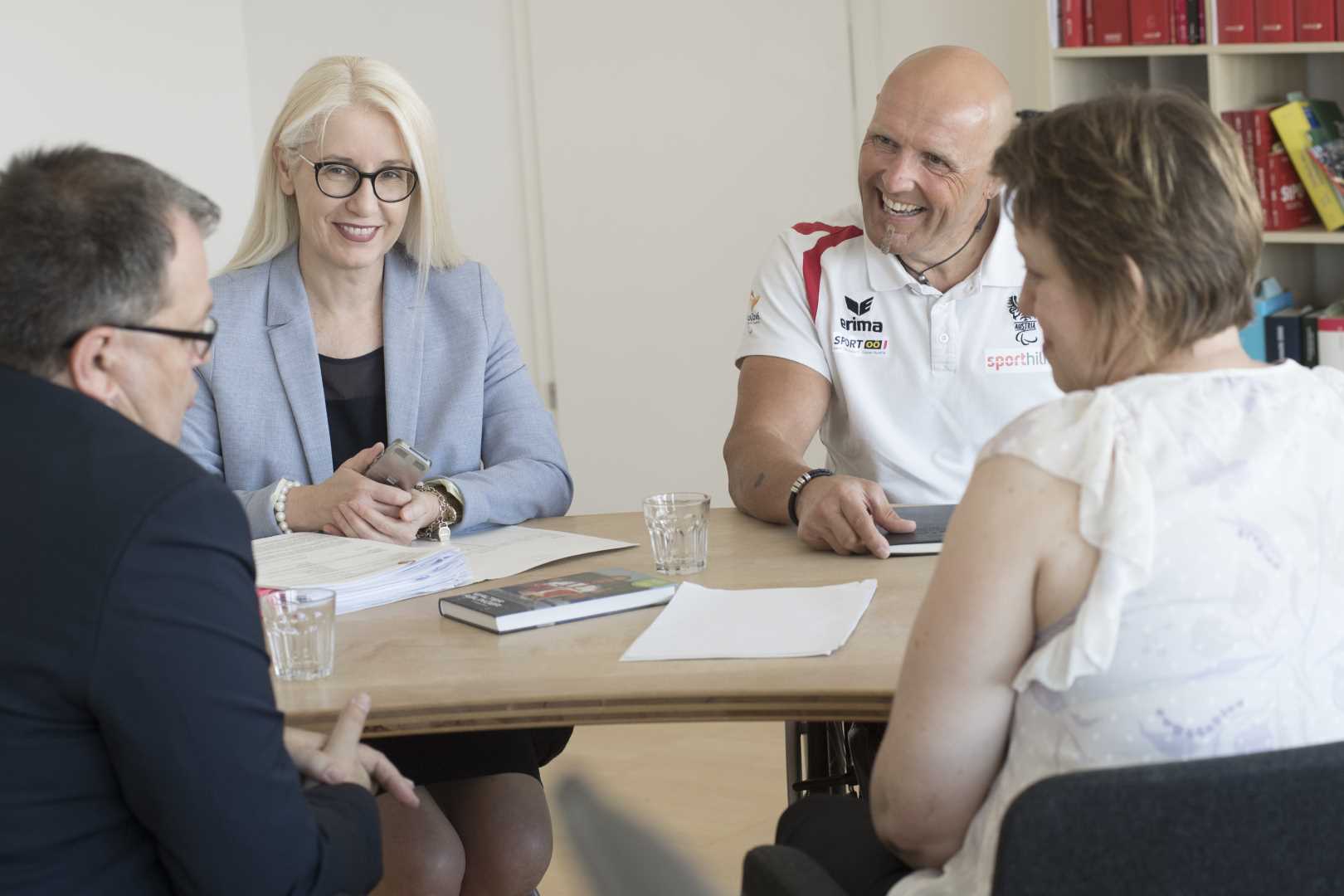 | alt: | Vier Personen sitzen an einem Tisch in einem Besprechungsraum und führen ein Gespräch mit Unterlagen – Beratung und rechtliche Unterstützung im Team. |