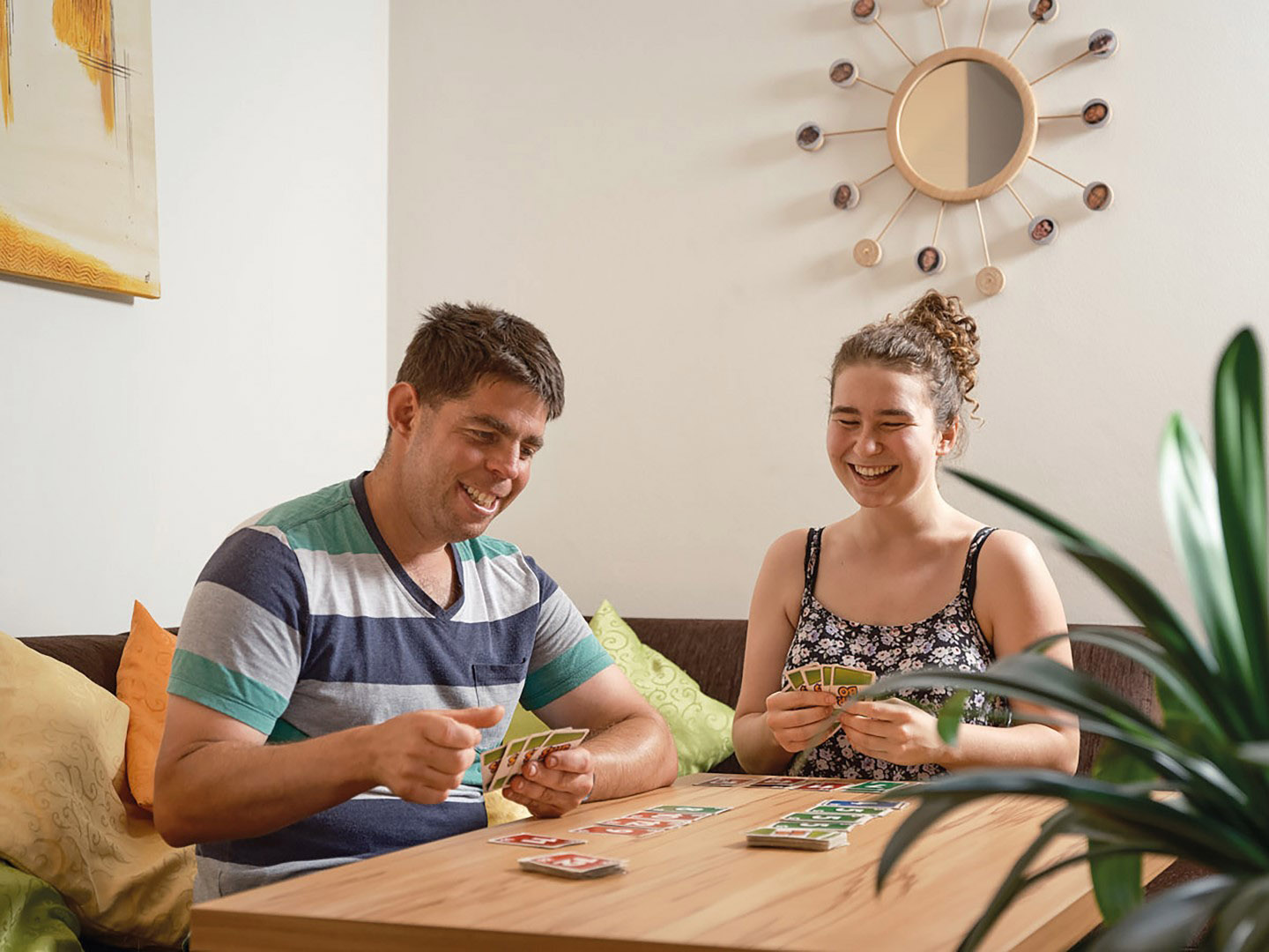| alt: | Zwei junge Erwachsene sitzen an einem Tisch und spielen gemeinsam Karten – unterstütztes Wohnen mit gemeinsamer Alltagsgestaltung. |