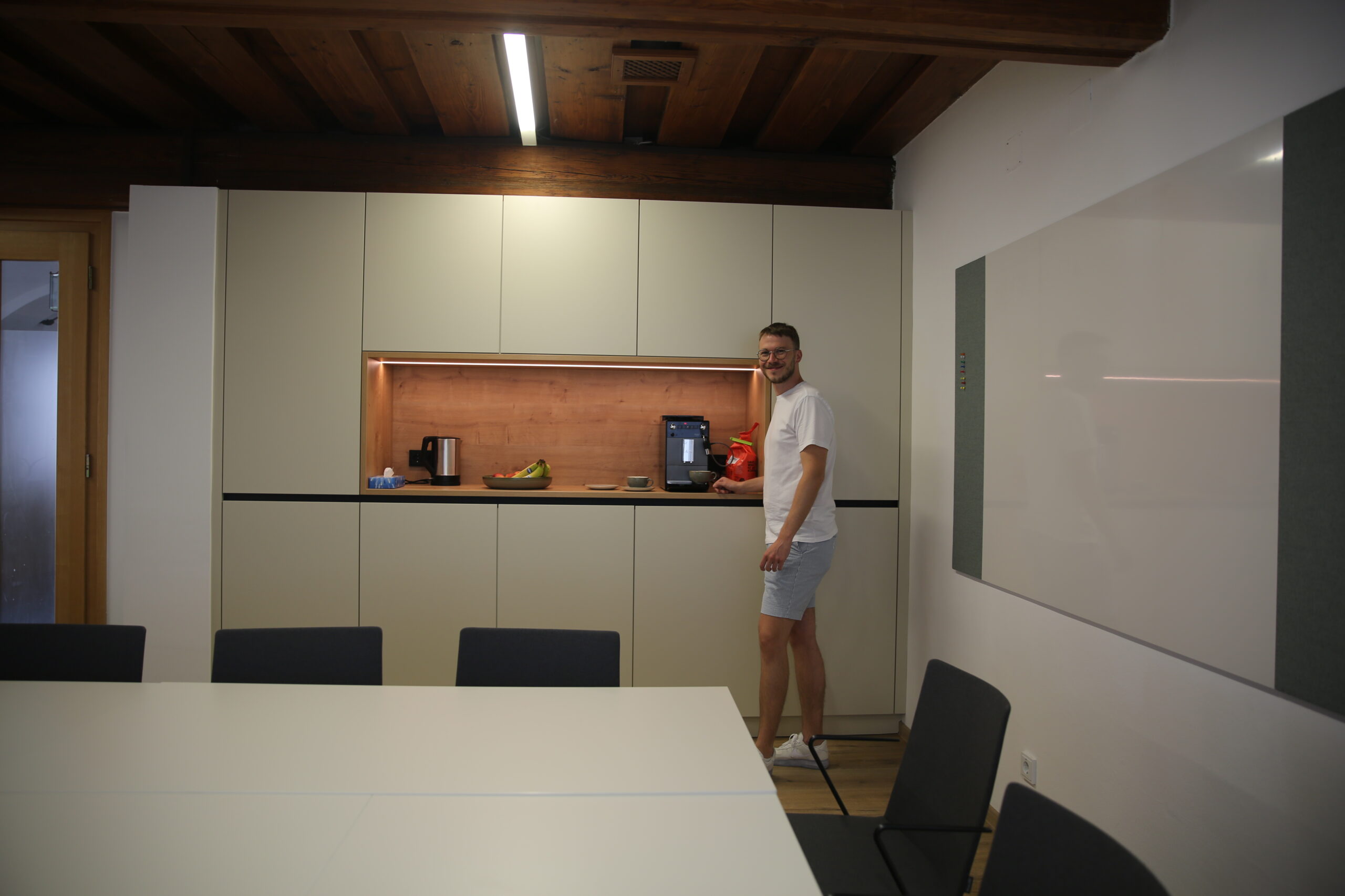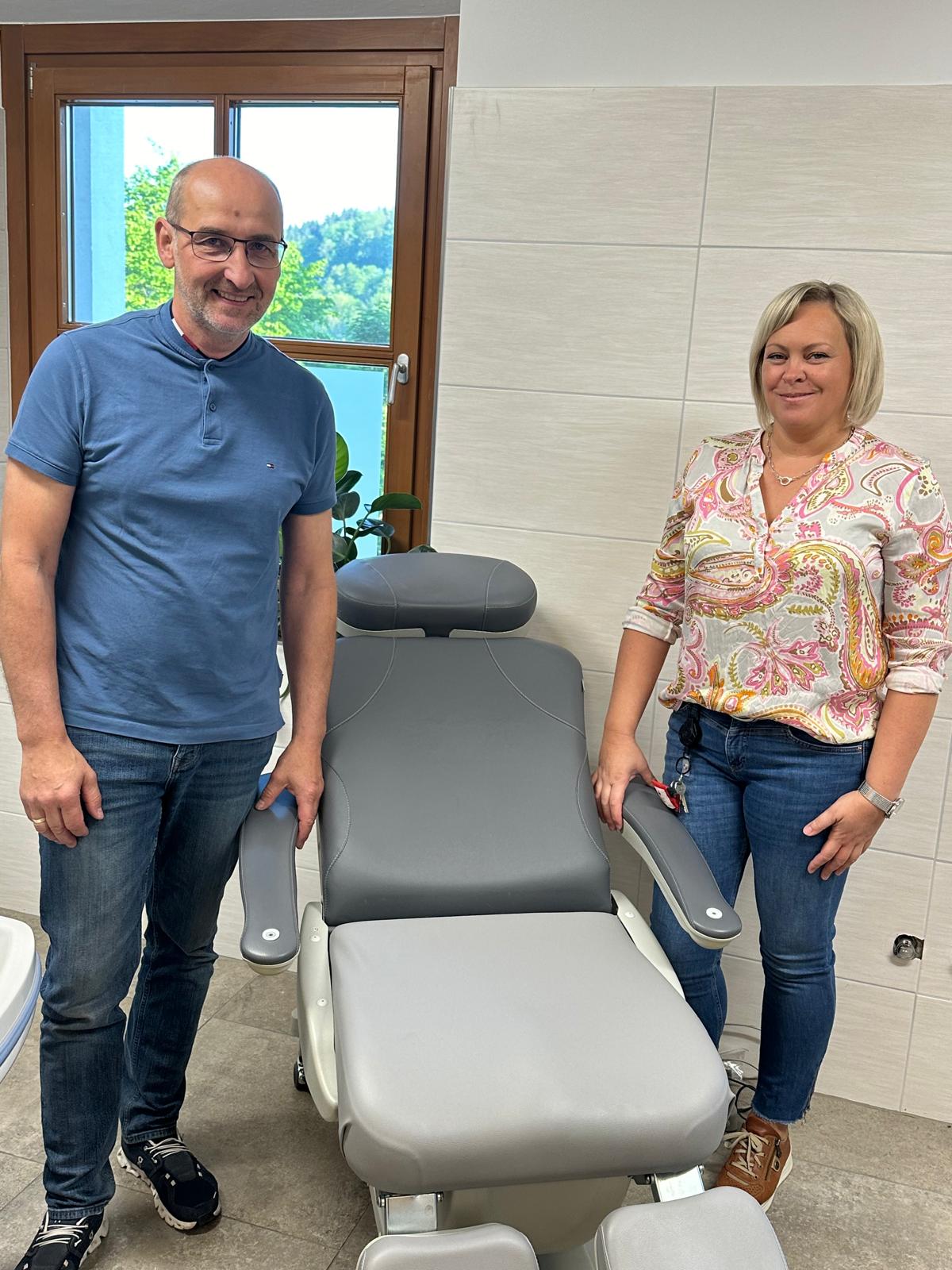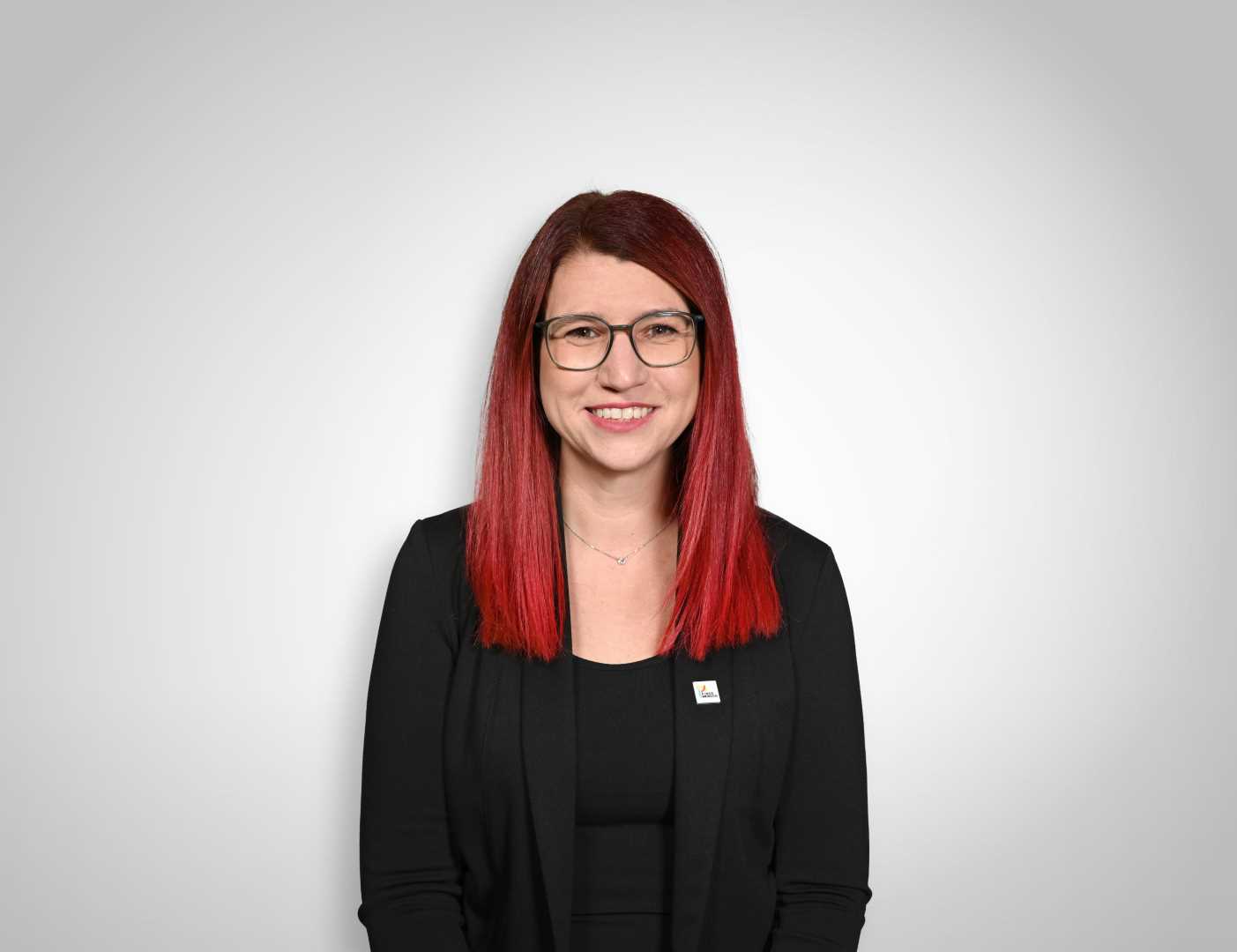| alt: | Zwei Mitarbeiterinnen stehen und sitzen gemeinsam in einem Büro und lächeln in die Kamera – persönliche Beratung in vertrauensvoller Atmosphäre. |