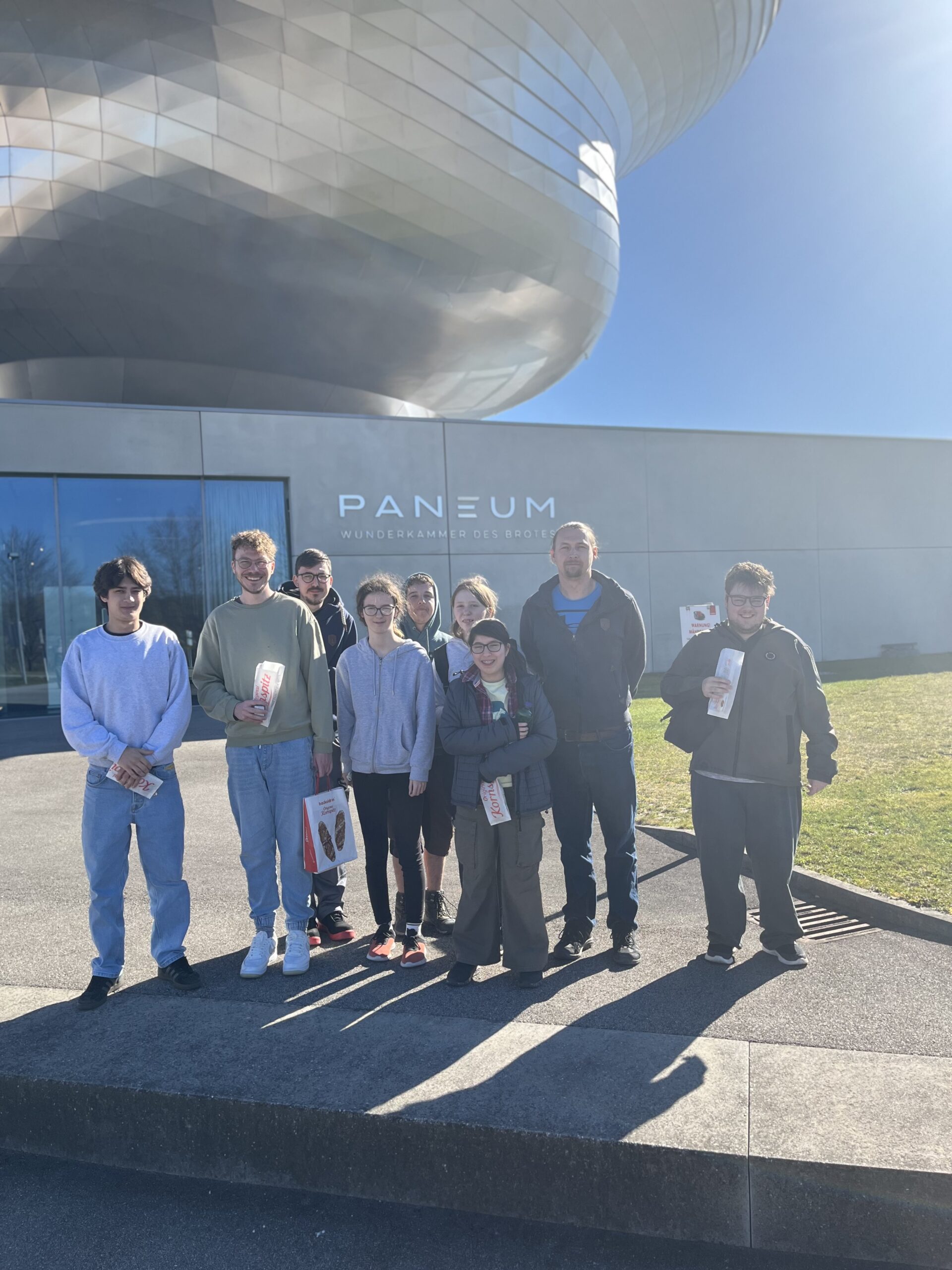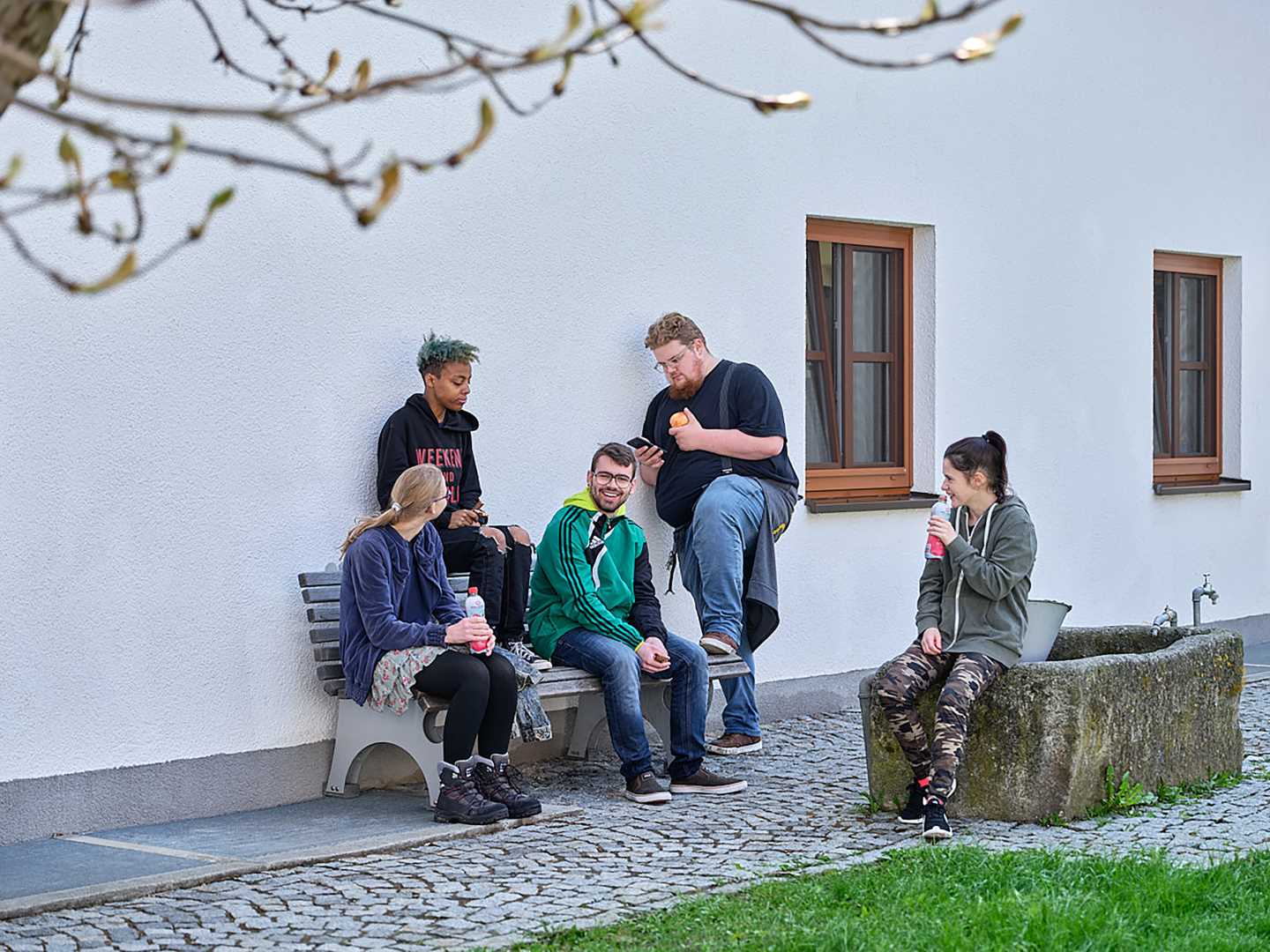 | alt: | Fünf junge Erwachsene sitzen und stehen gemeinsam bei einer Bank im Außenbereich. |