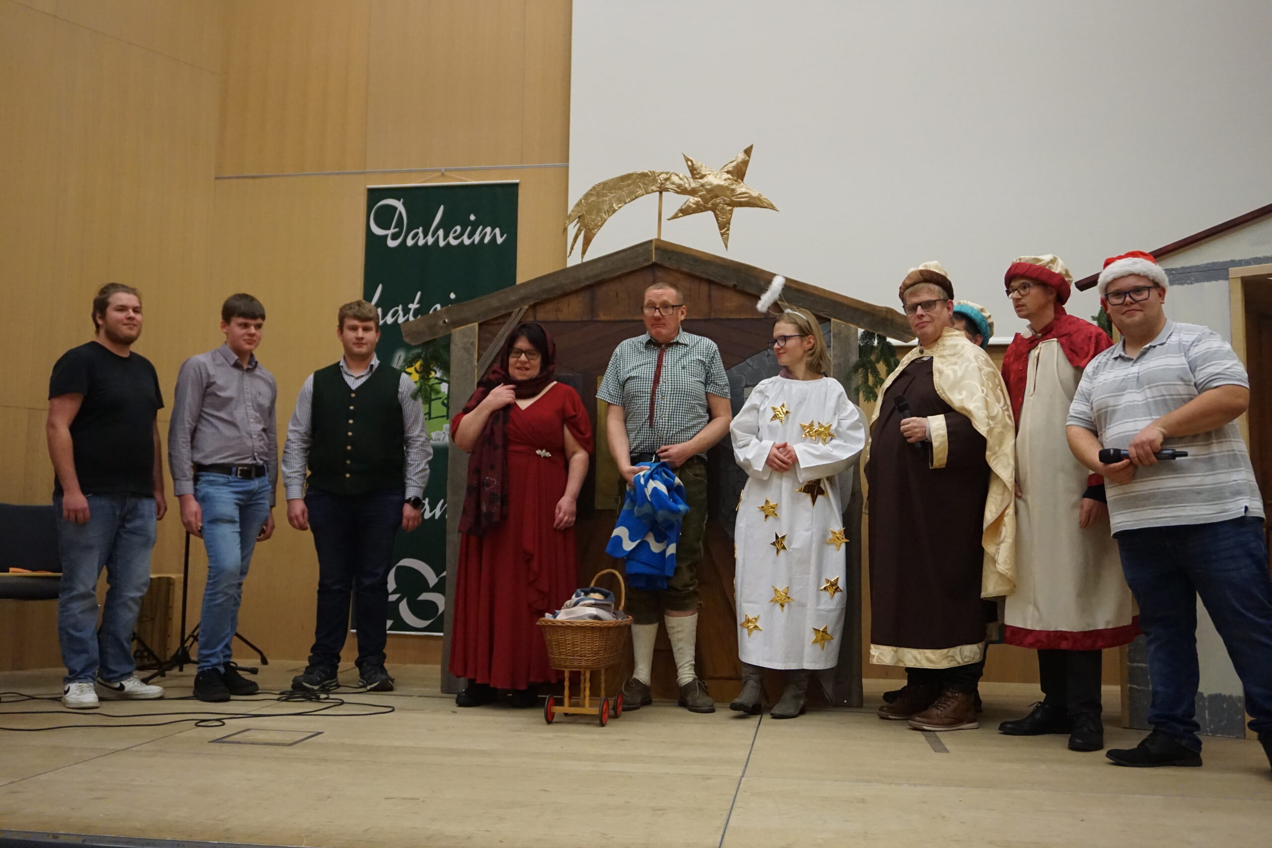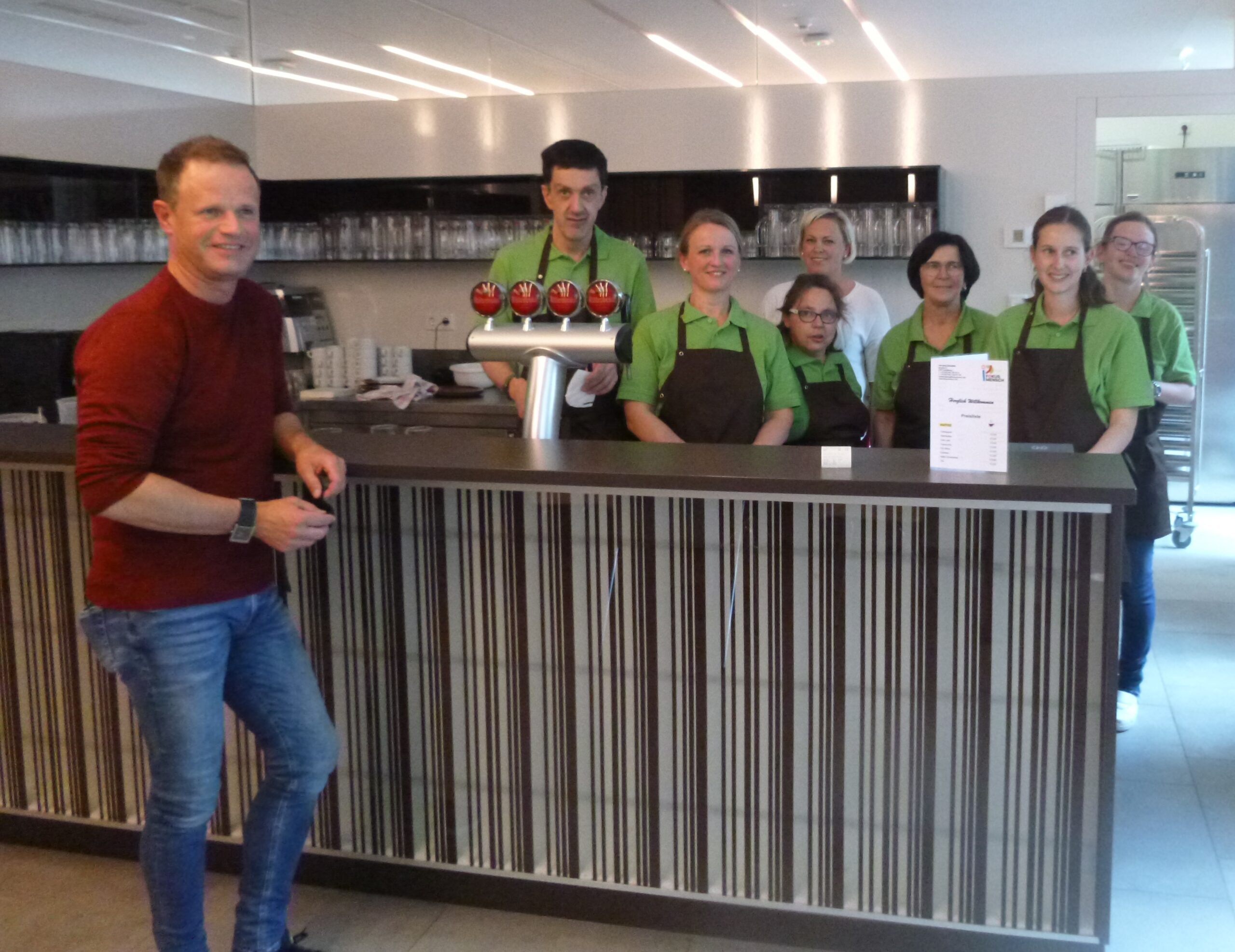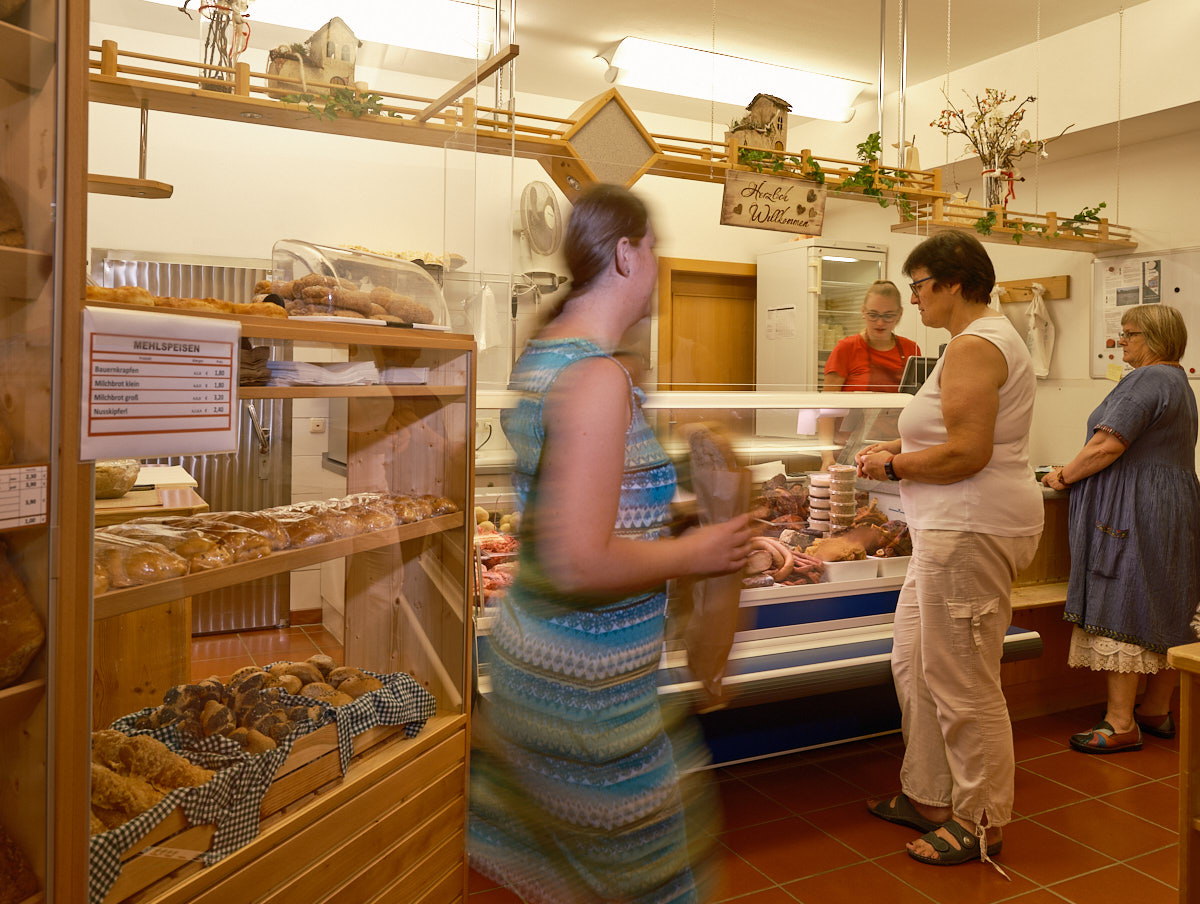 | alt: | Mehrere Personen stehen an einer Verkaufstheke mit Back- und Wurstwaren und sprechen miteinander. |