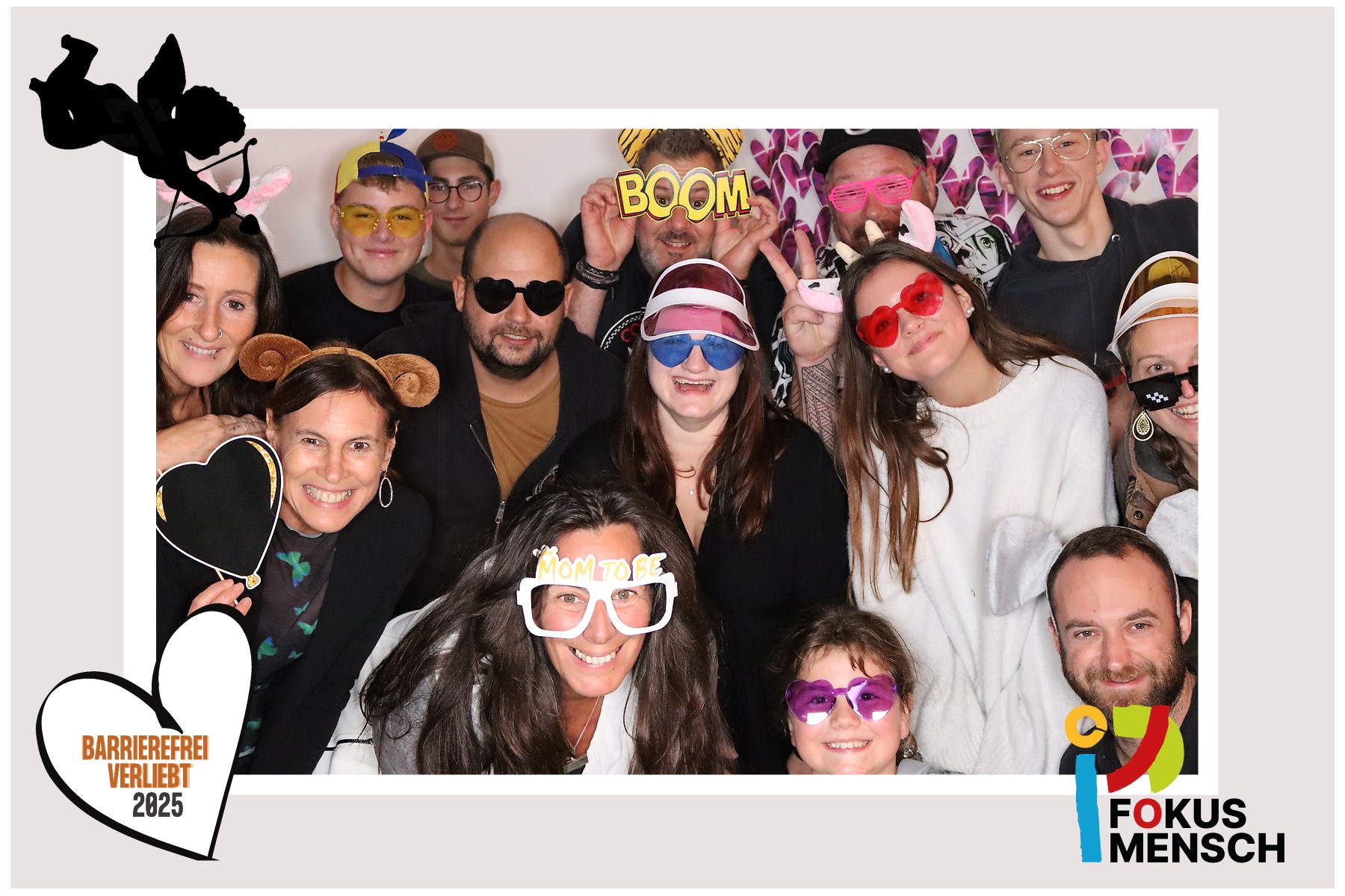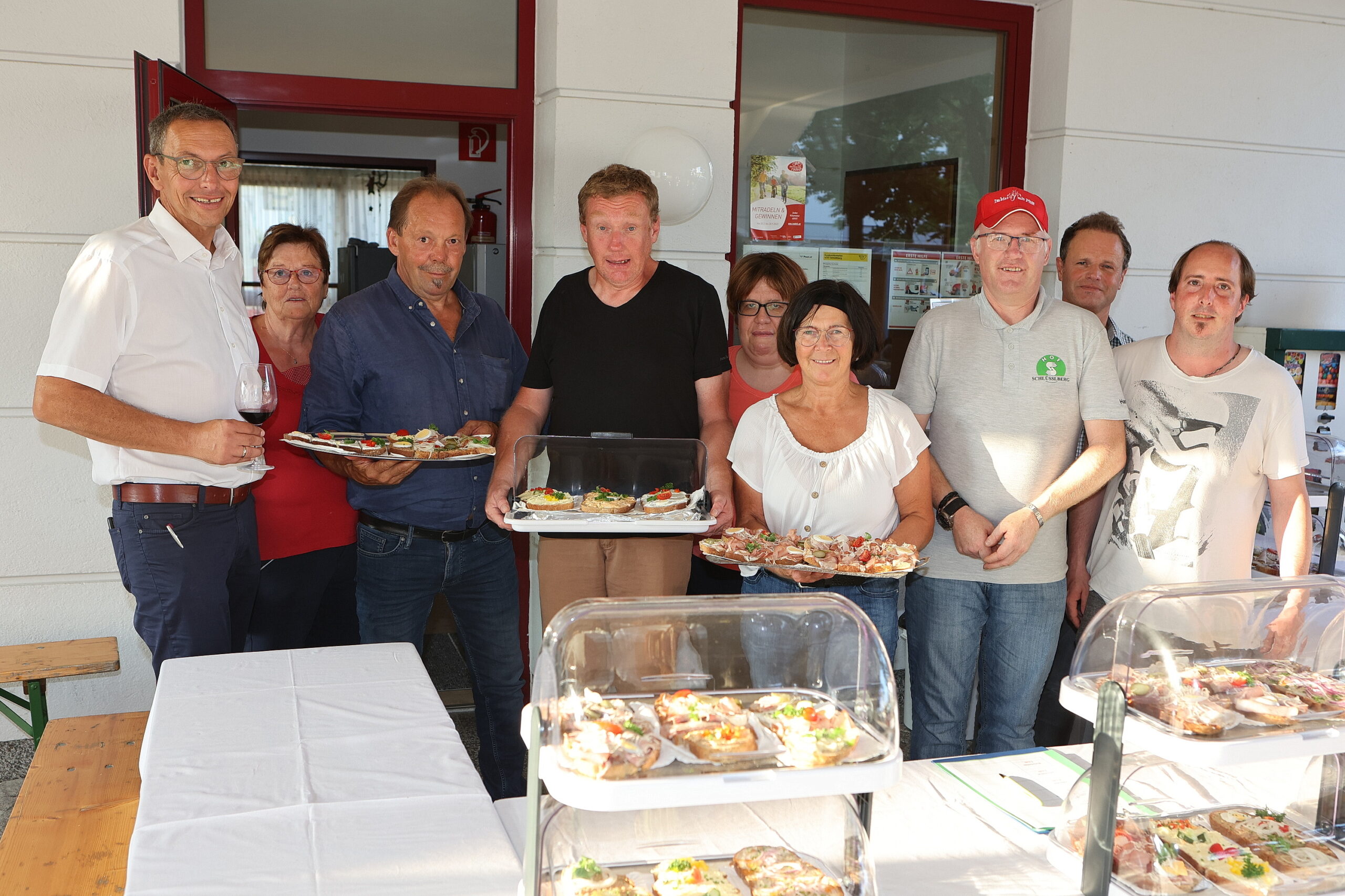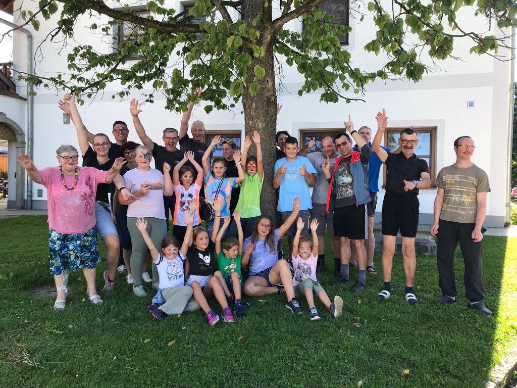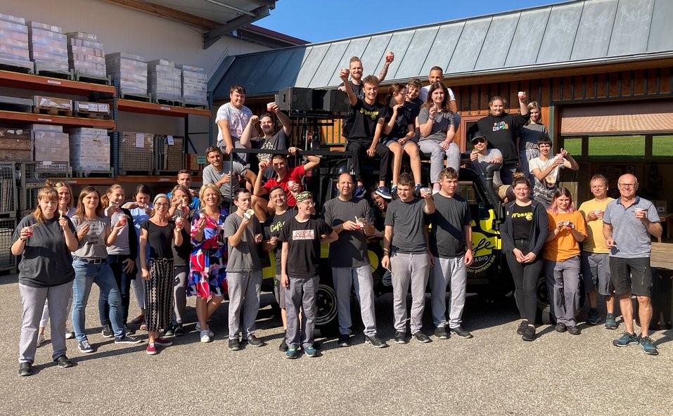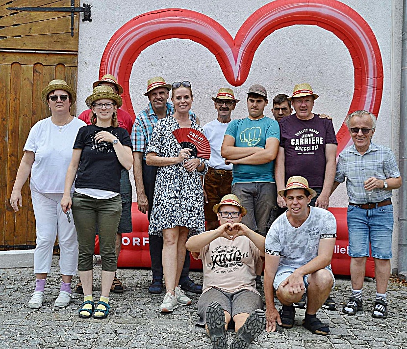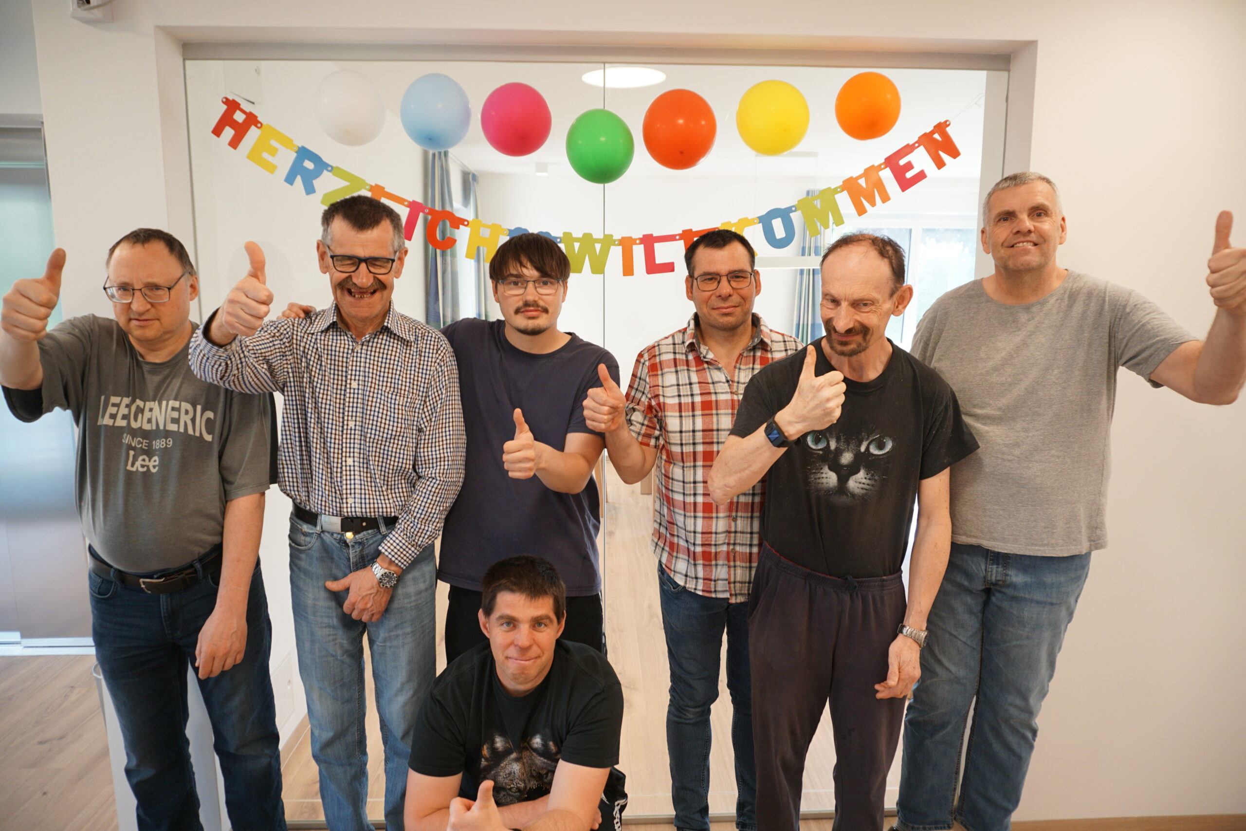 | alt: | Mehrere Erwachsene sitzen eng beieinander und lächeln in die Kamera, eine Person legt einem Mann den Arm um die Schulter. |