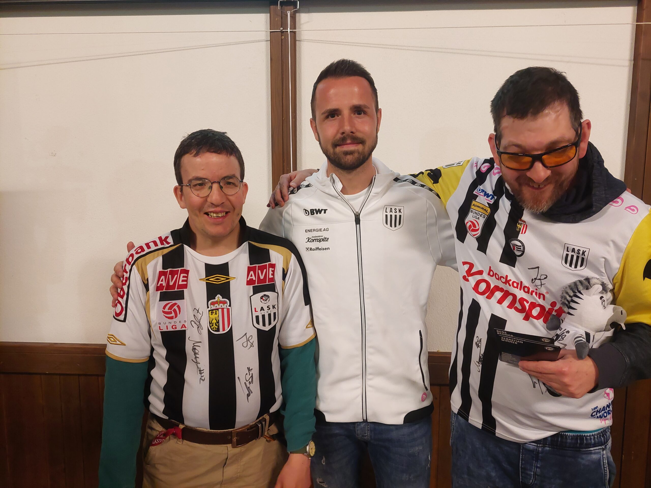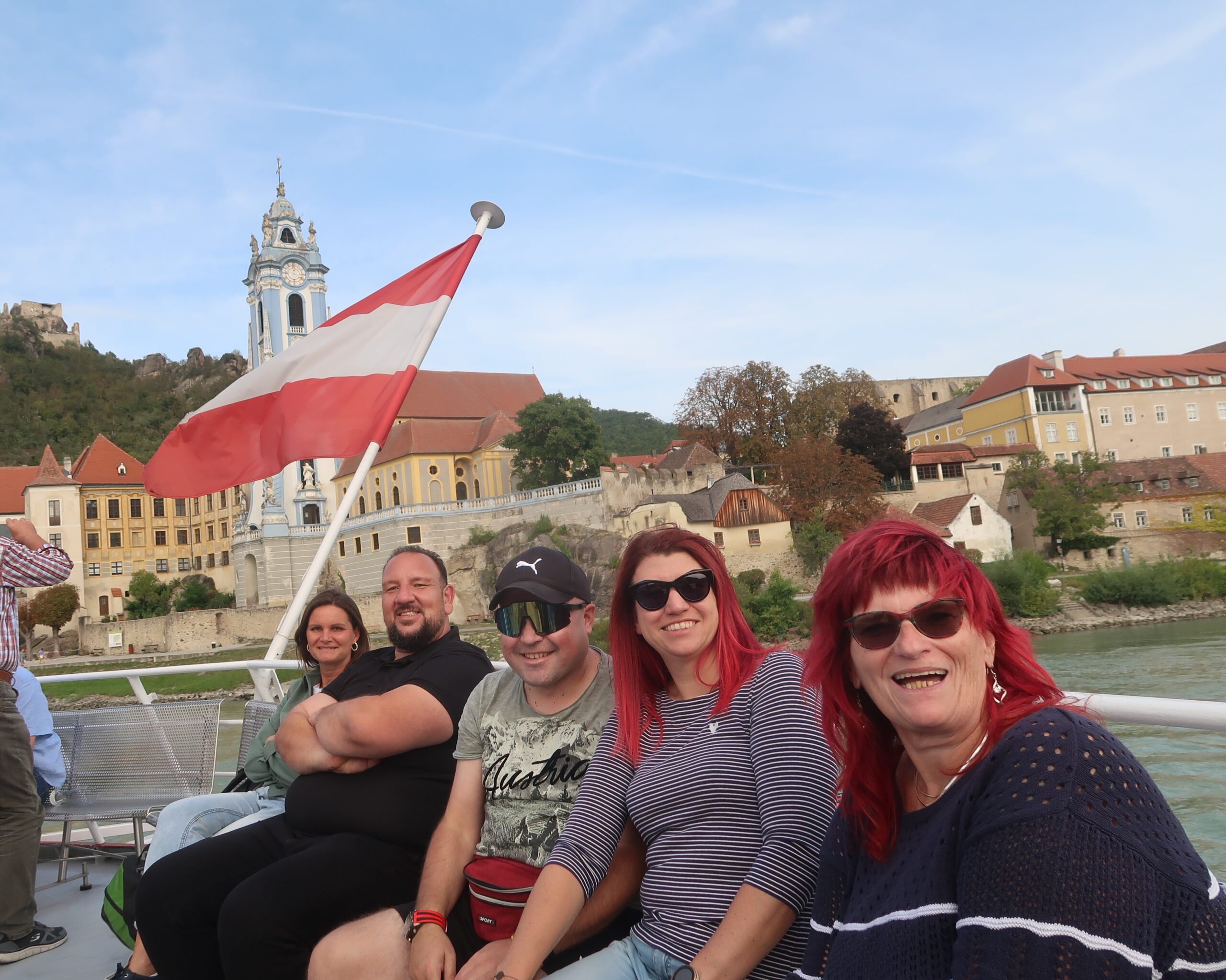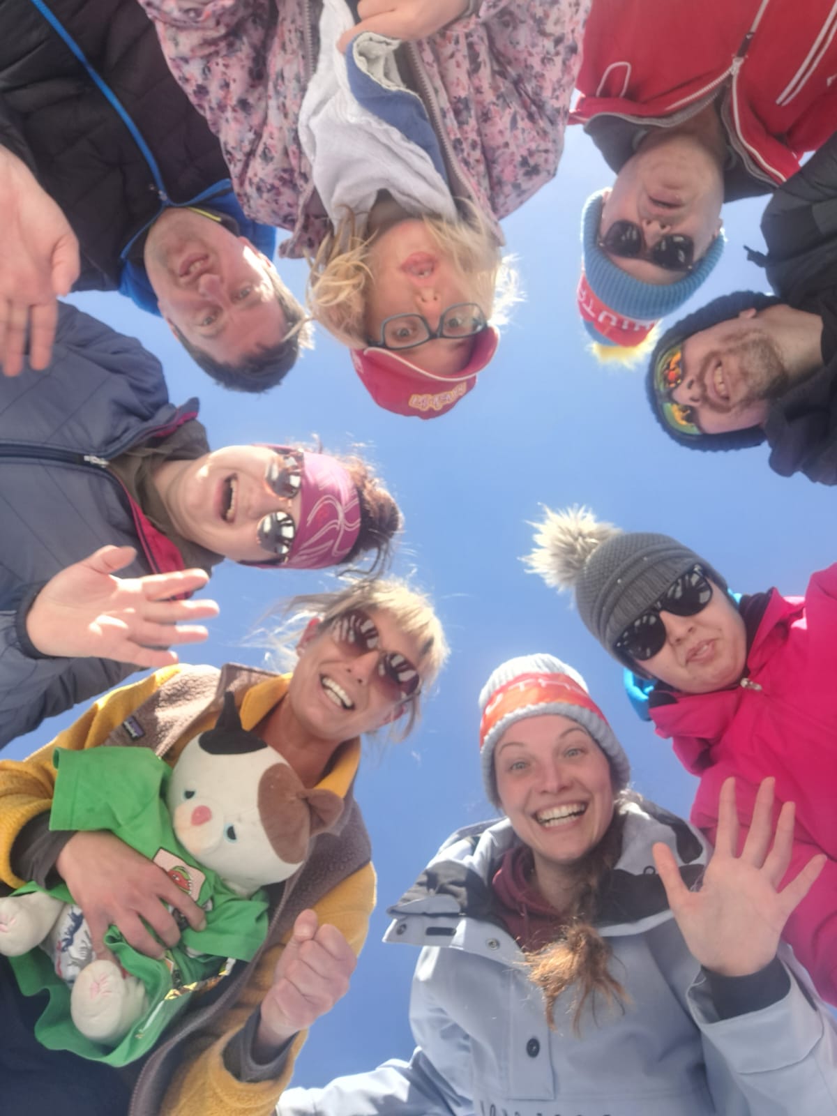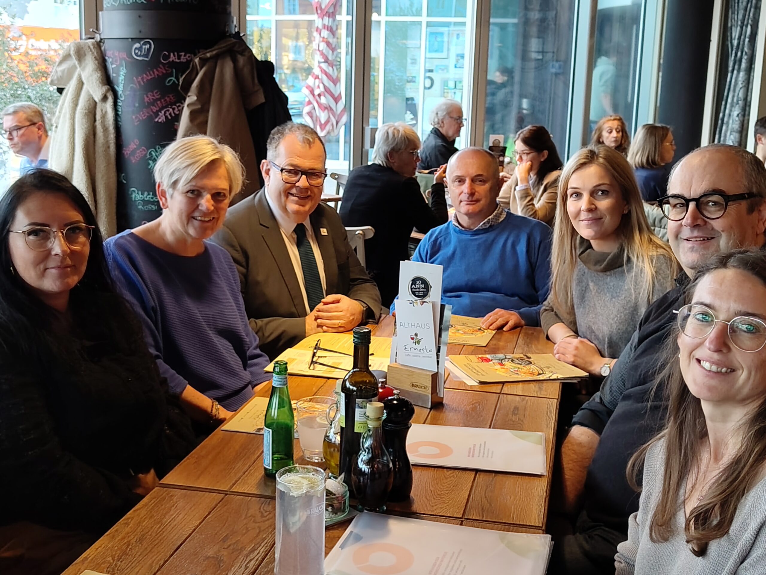 | alt: | Mehrere Erwachsene sitzen eng beieinander und lächeln in die Kamera, eine Person legt einem Mann den Arm um die Schulter. |
