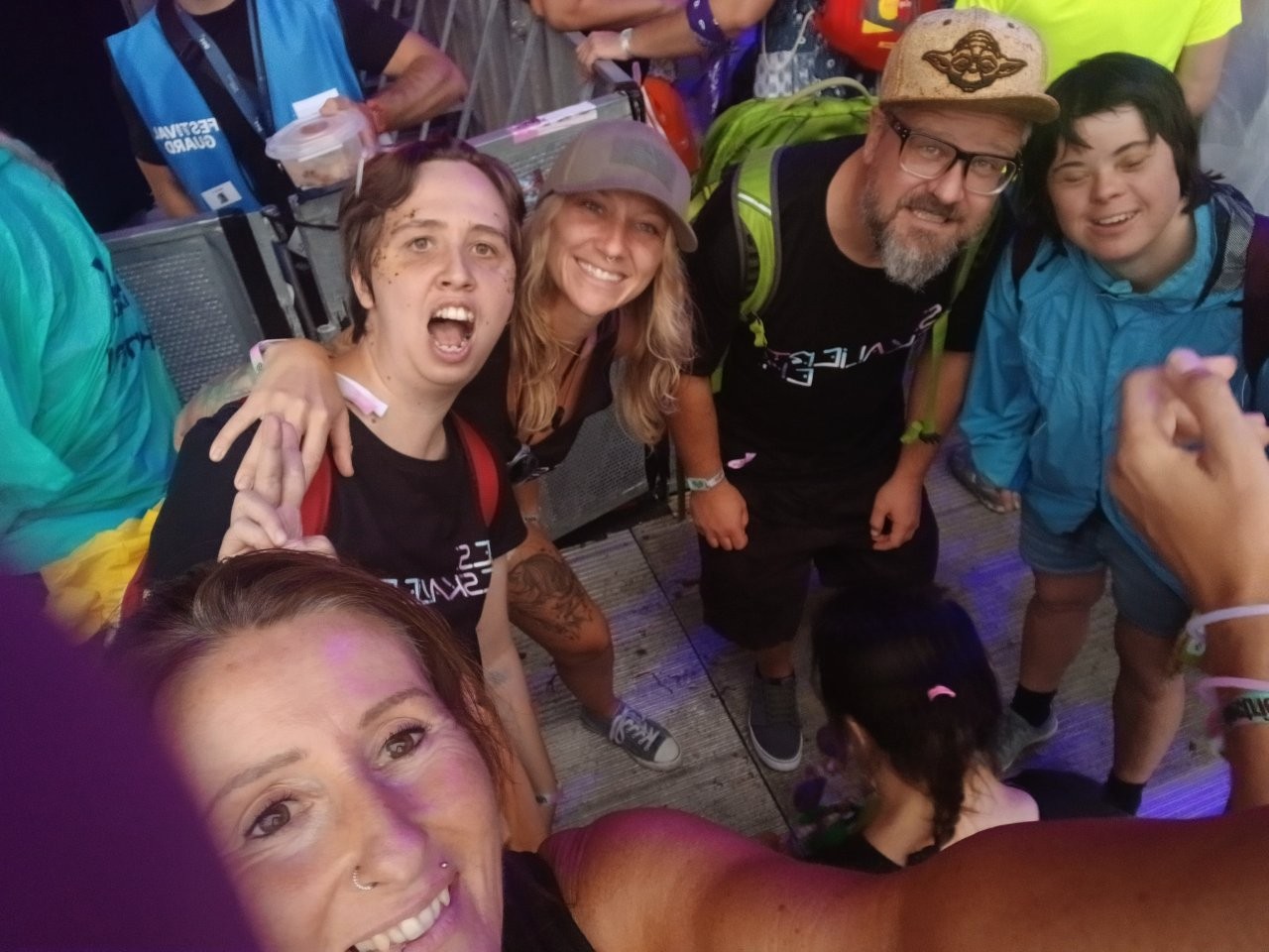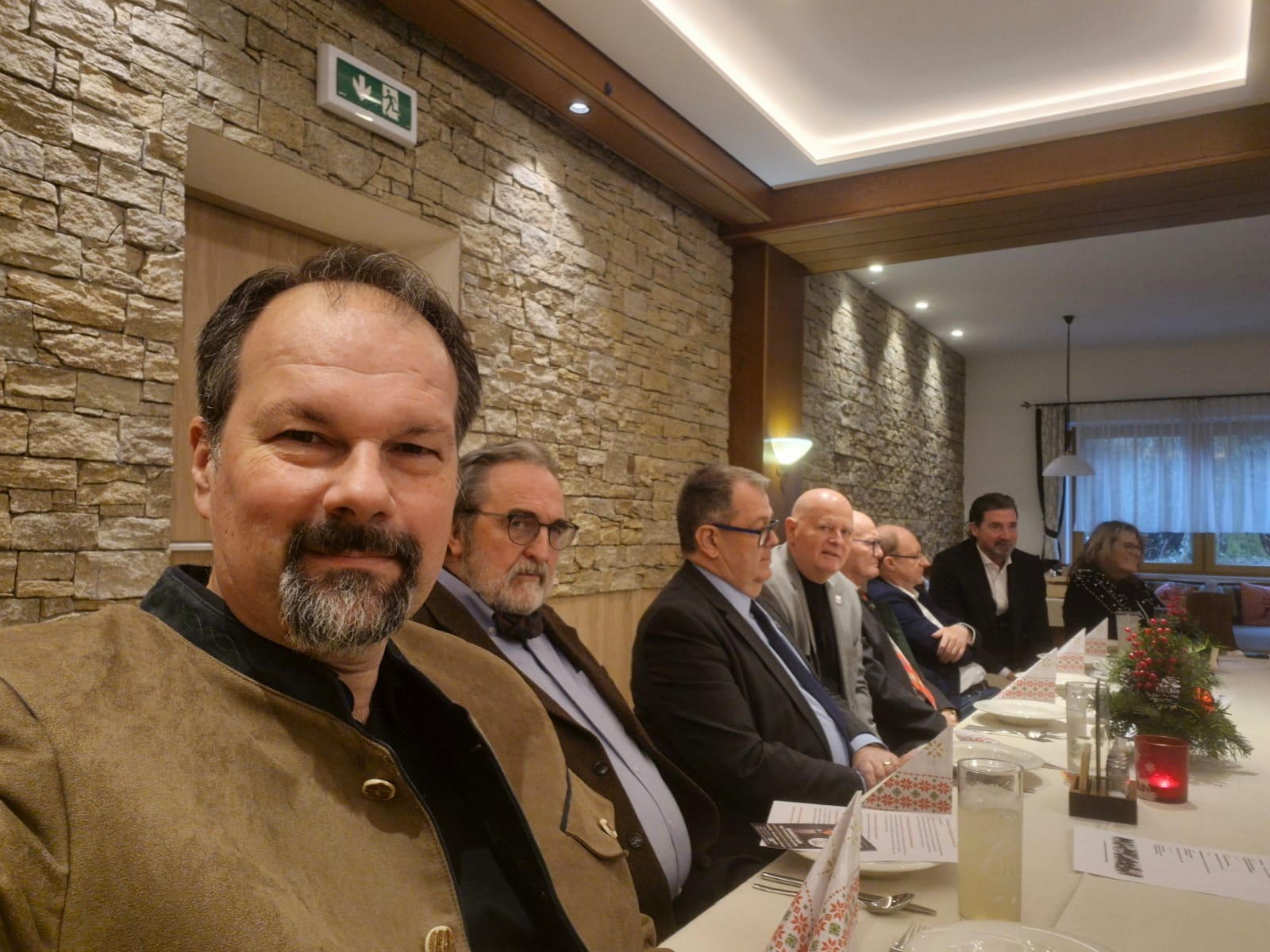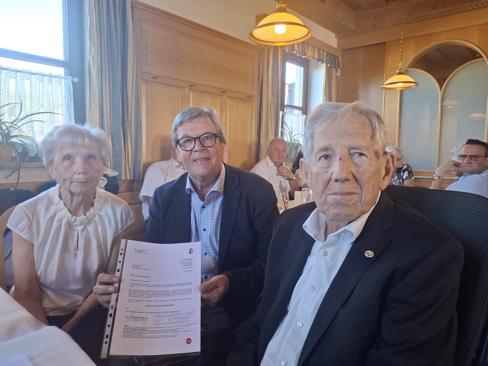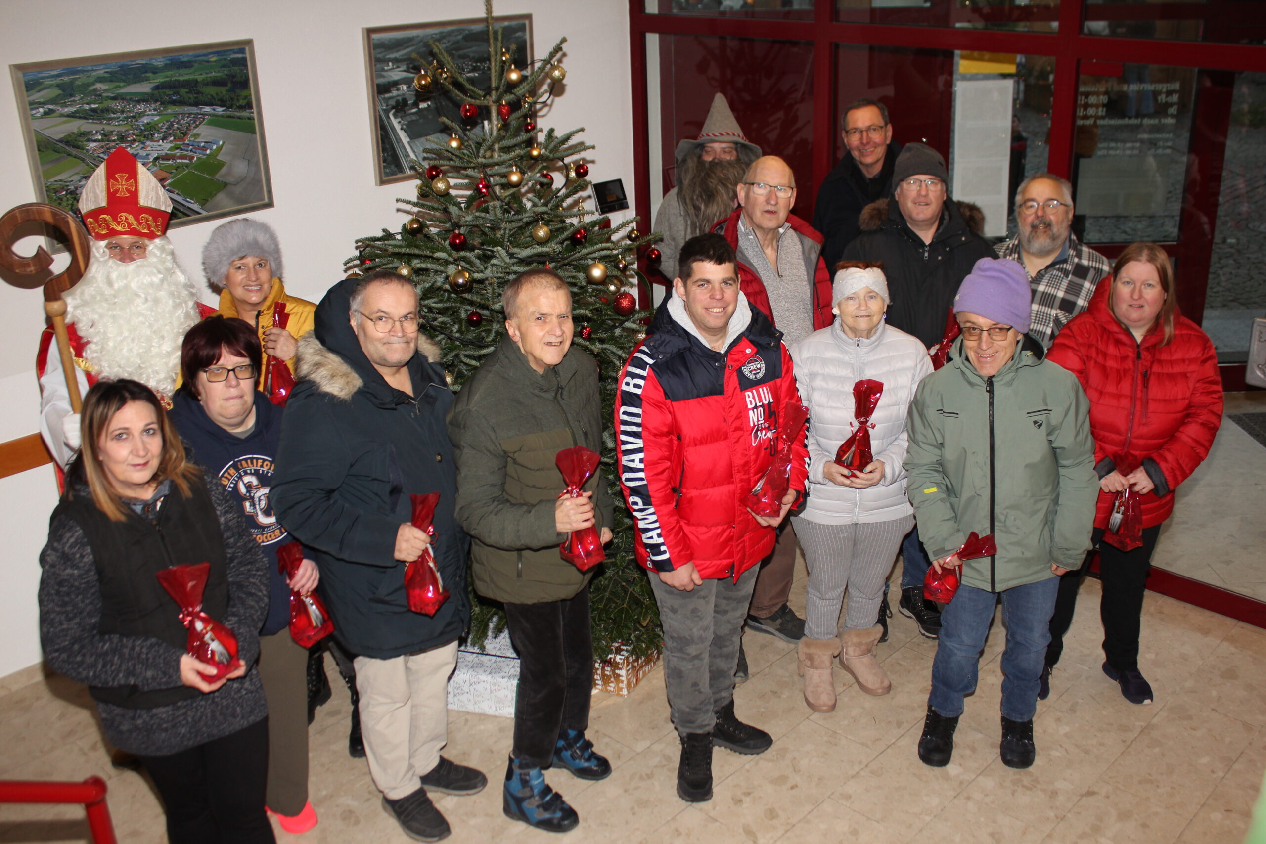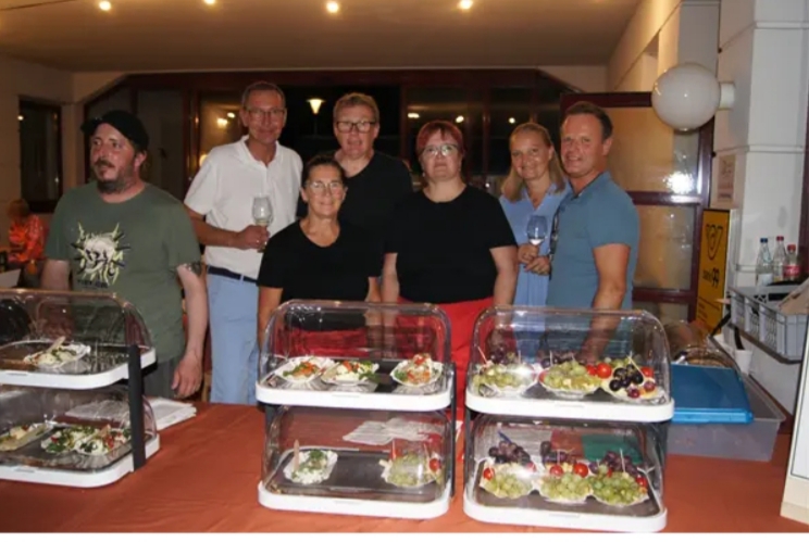 | alt: | Mehrere Erwachsene sitzen eng beieinander und lächeln in die Kamera, eine Person legt einem Mann den Arm um die Schulter. |