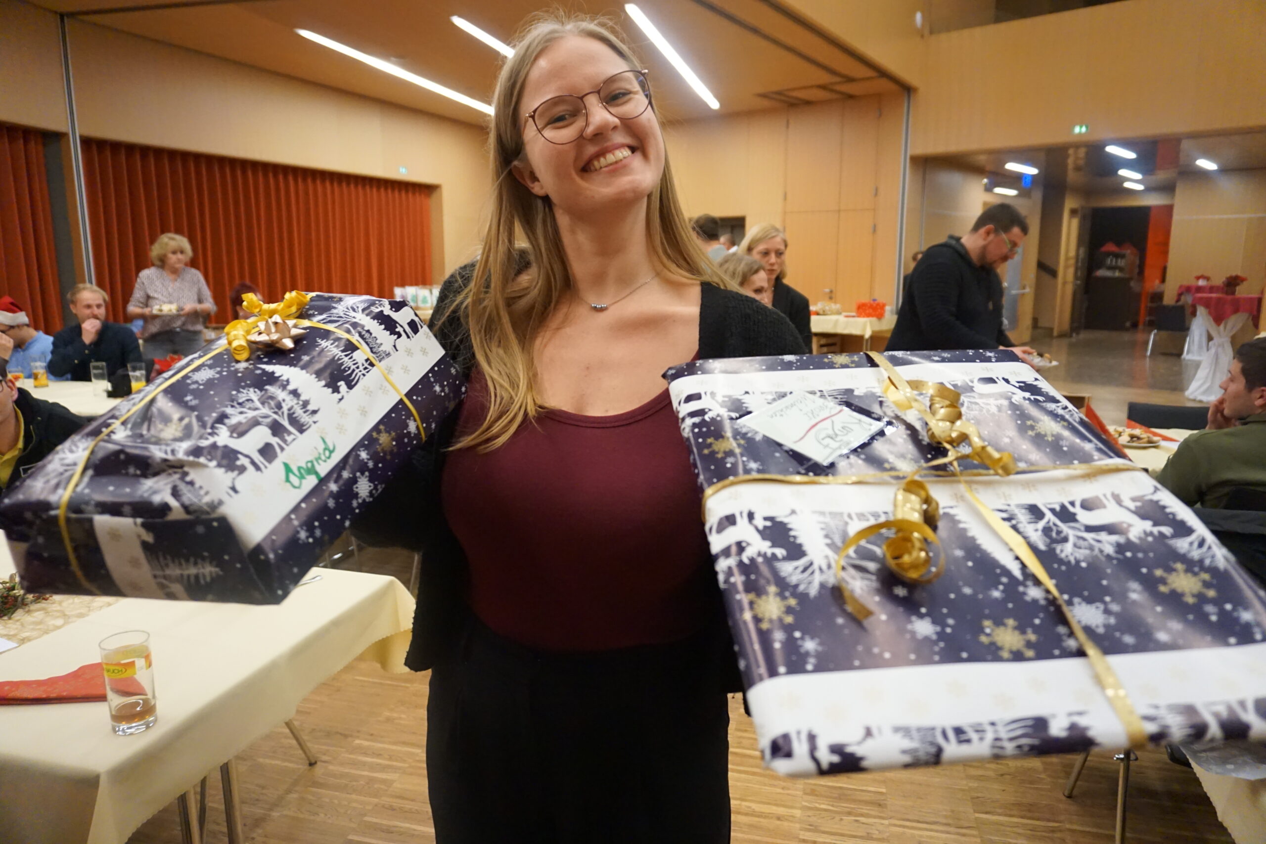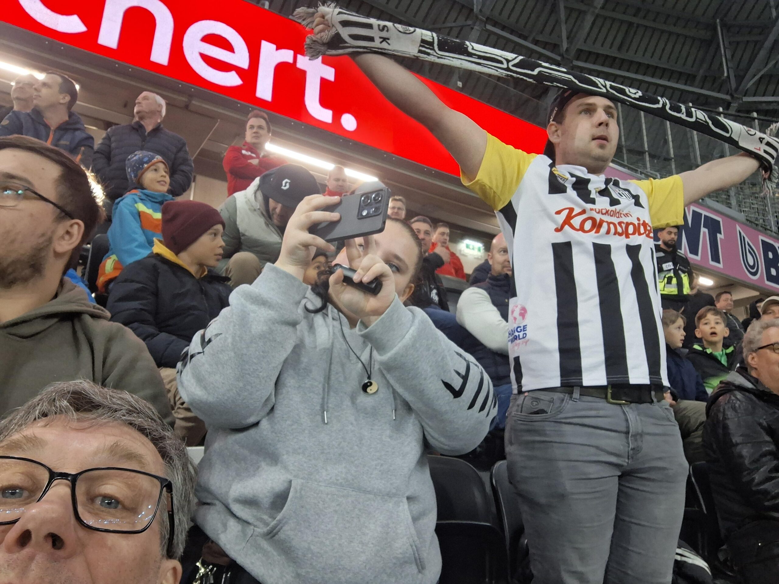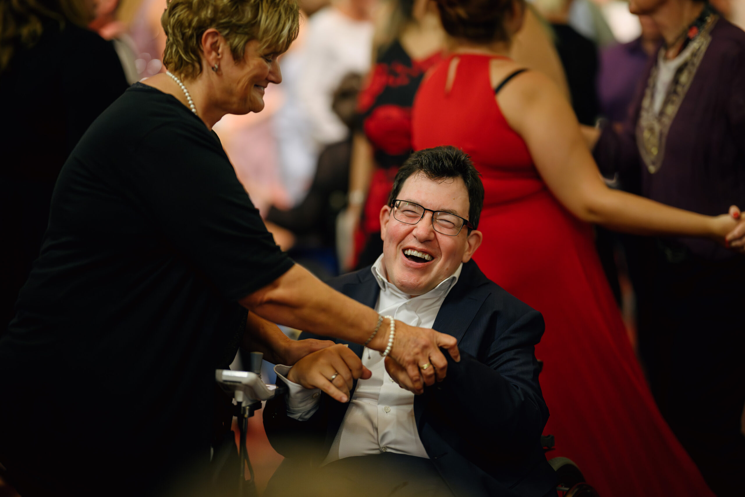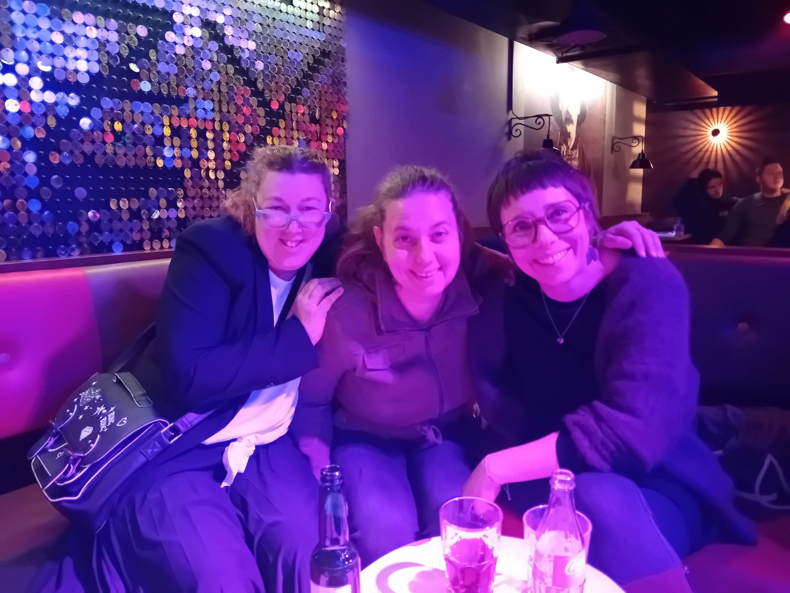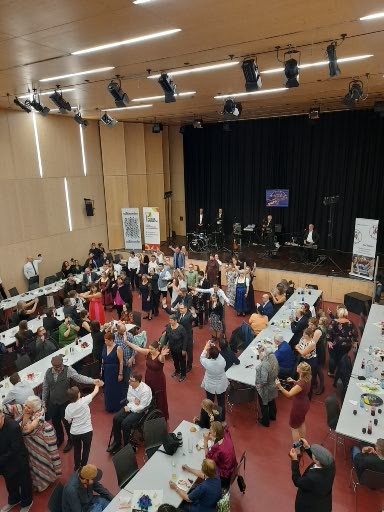 | alt: | Mehrere Erwachsene sitzen eng beieinander und lächeln in die Kamera, eine Person legt einem Mann den Arm um die Schulter. |