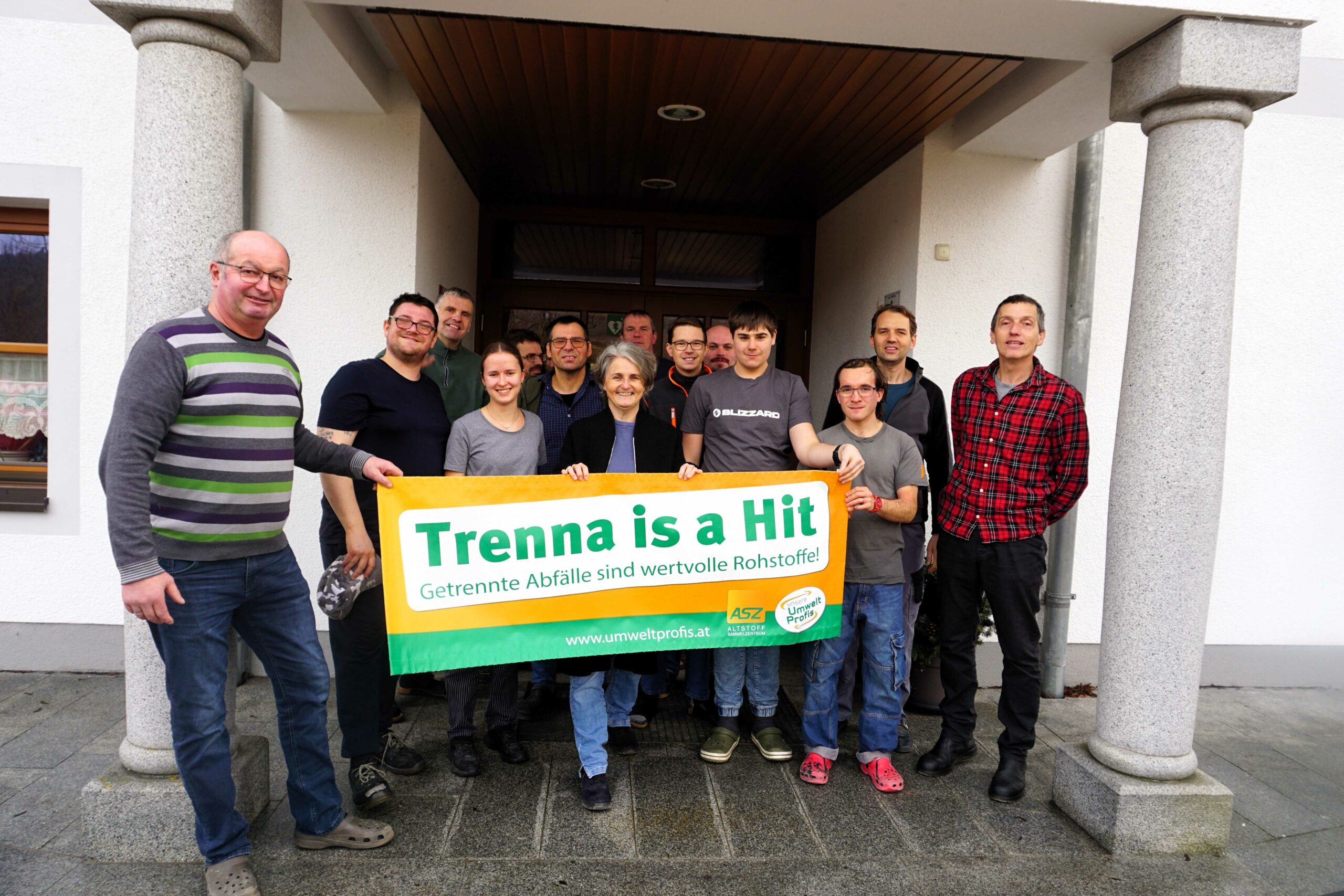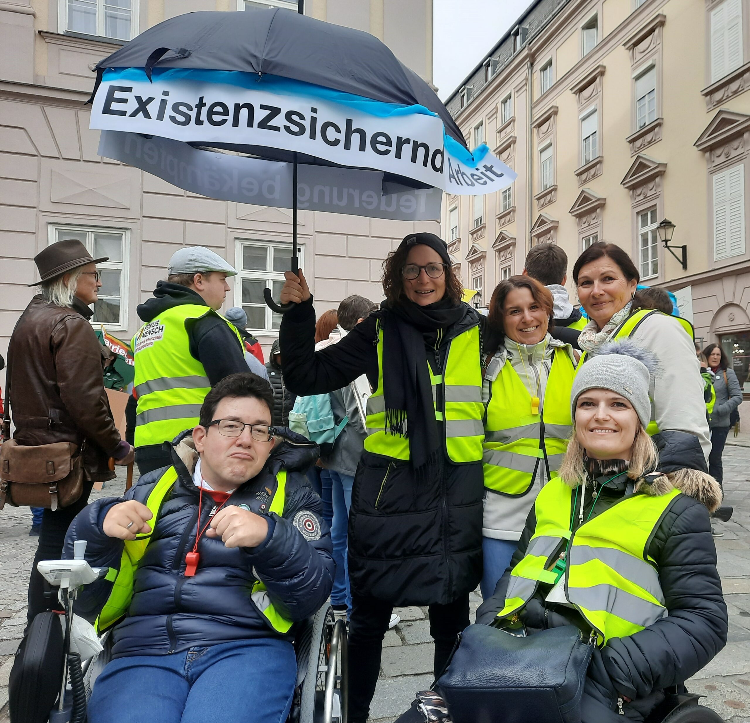 | alt: | Gruppe von Personen mit Bannern und Schildern steht auf einem Platz vor einem Gebäude, mehrere Personen tragen Warnwesten. |