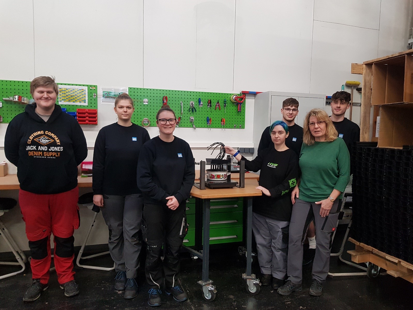 | alt: | Mehrere Personen sitzen an einem Tisch und arbeiten konzentriert mit Werkzeugen. |