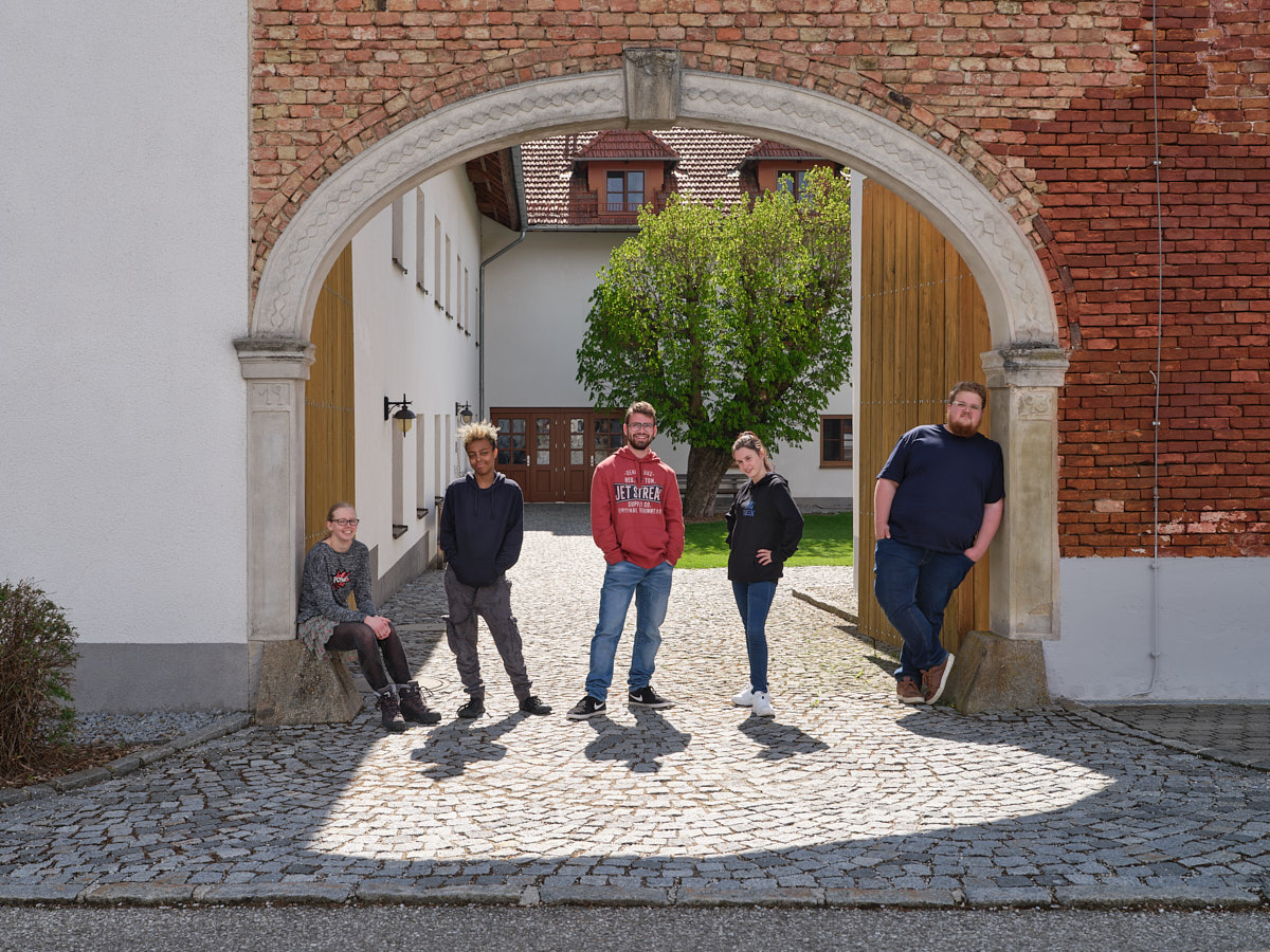 | alt: | Mehrere Personen stehen unter einem gemauerten Torbogen im Freien. |