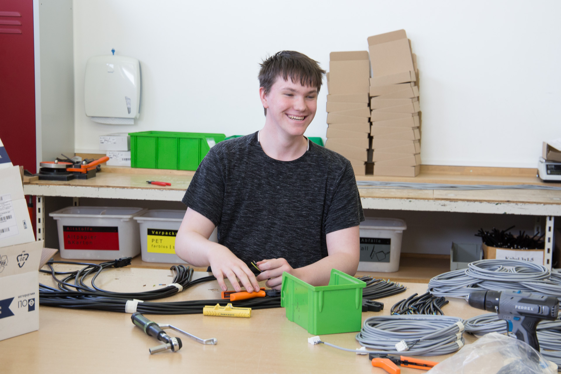 | alt: | Große Werkhalle mit mehreren Arbeitsplätzen, an denen Menschen gemeinsam Produkte verpacken und sortieren – strukturierte Arbeitsumgebung mit Teamarbeit. |