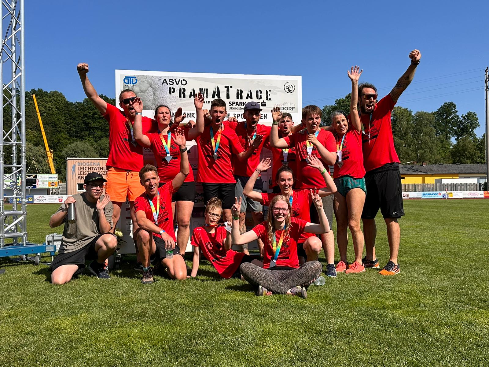 | alt: | Gruppe von Erwachsenen blickt gemeinsam in die Kamera im Grünen bei einer Teamübung. |