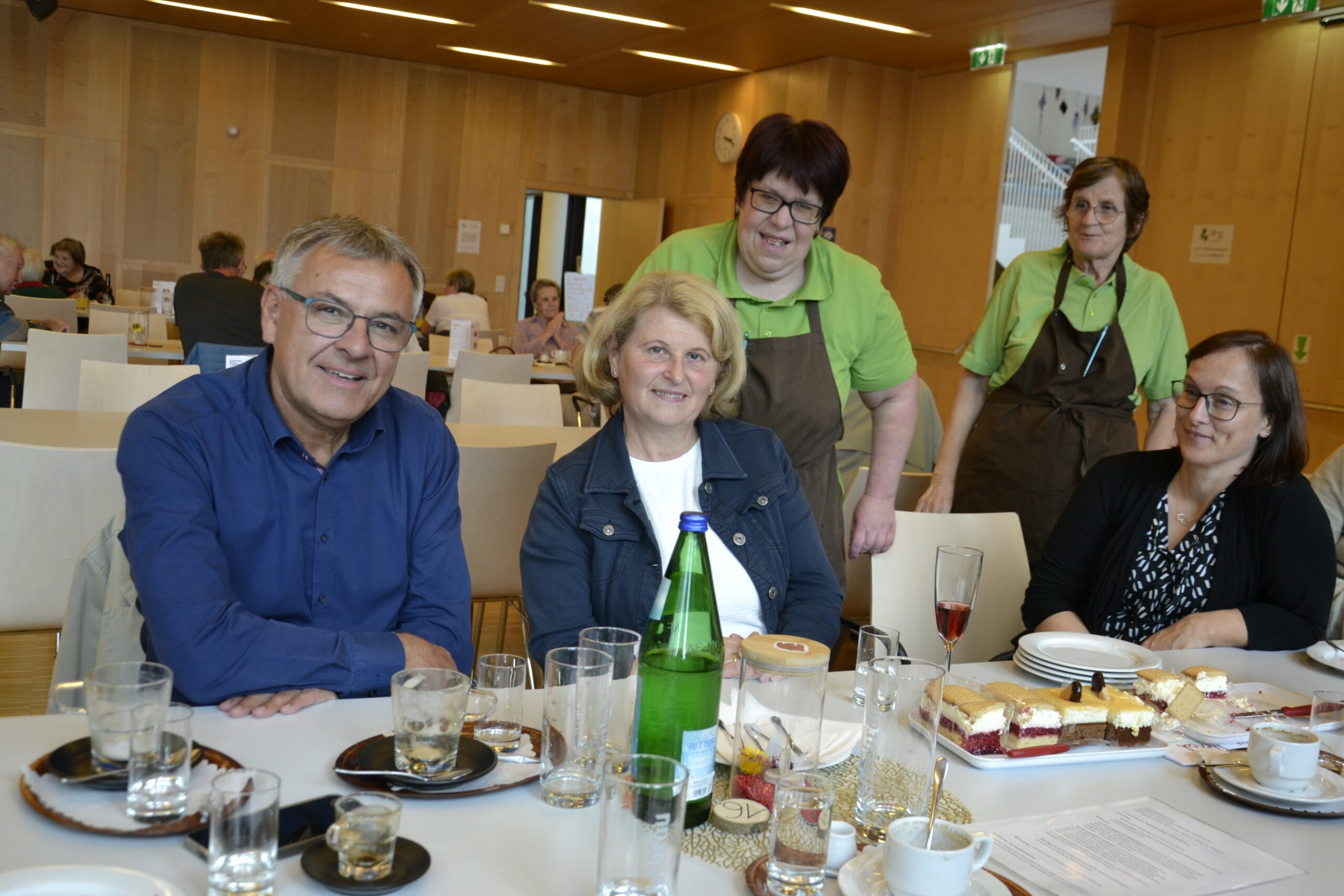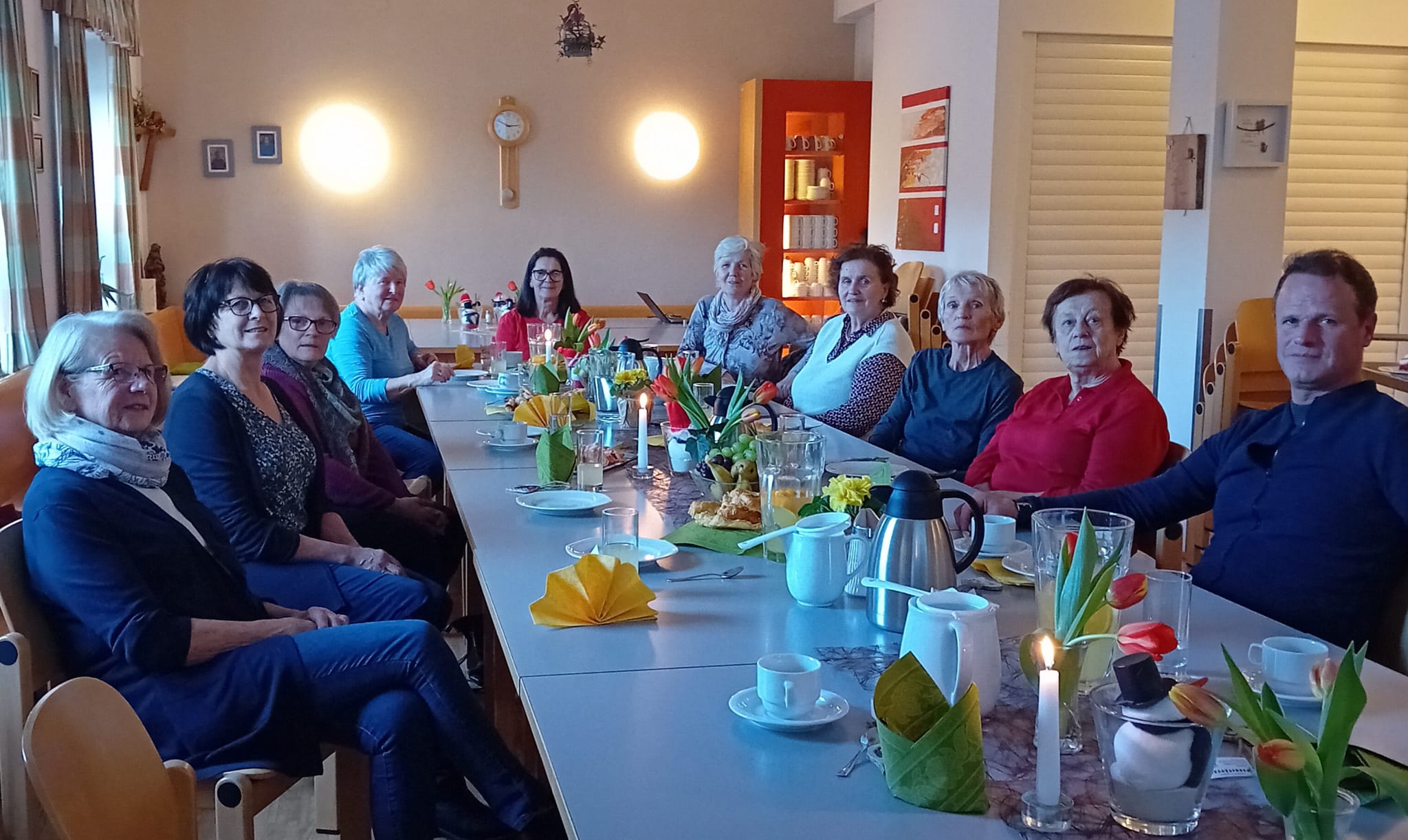 | alt: | Mehrere Erwachsene sitzen gemeinsam an einem Esstisch und essen und trinken zusammen – gemeinschaftliches Wohnen mit teilweiser Unterstützung im Alltag. |