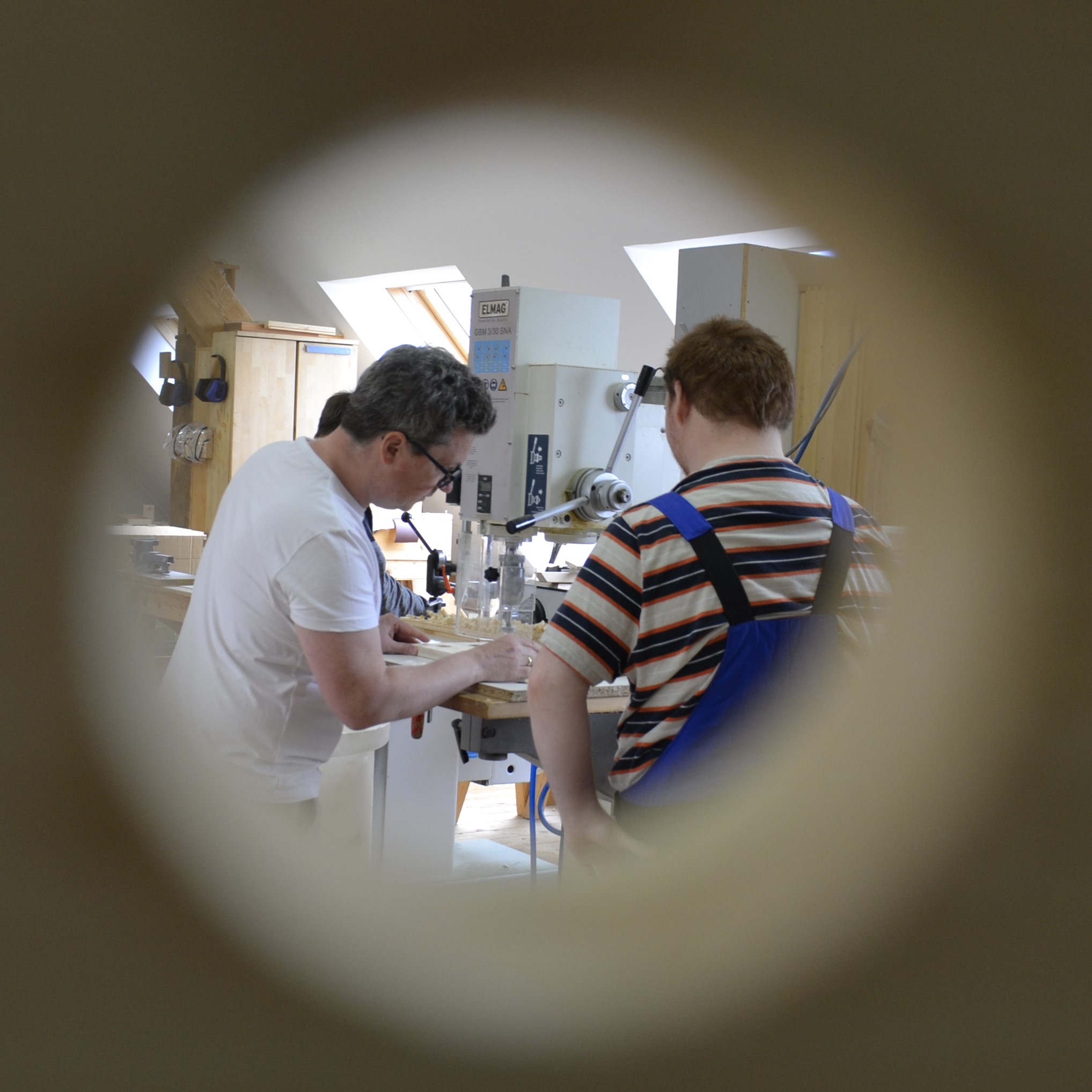 | alt: | Mehrere Personen arbeiten in einer Holzwerkstatt an Werkbänken und bearbeiten Holz. |