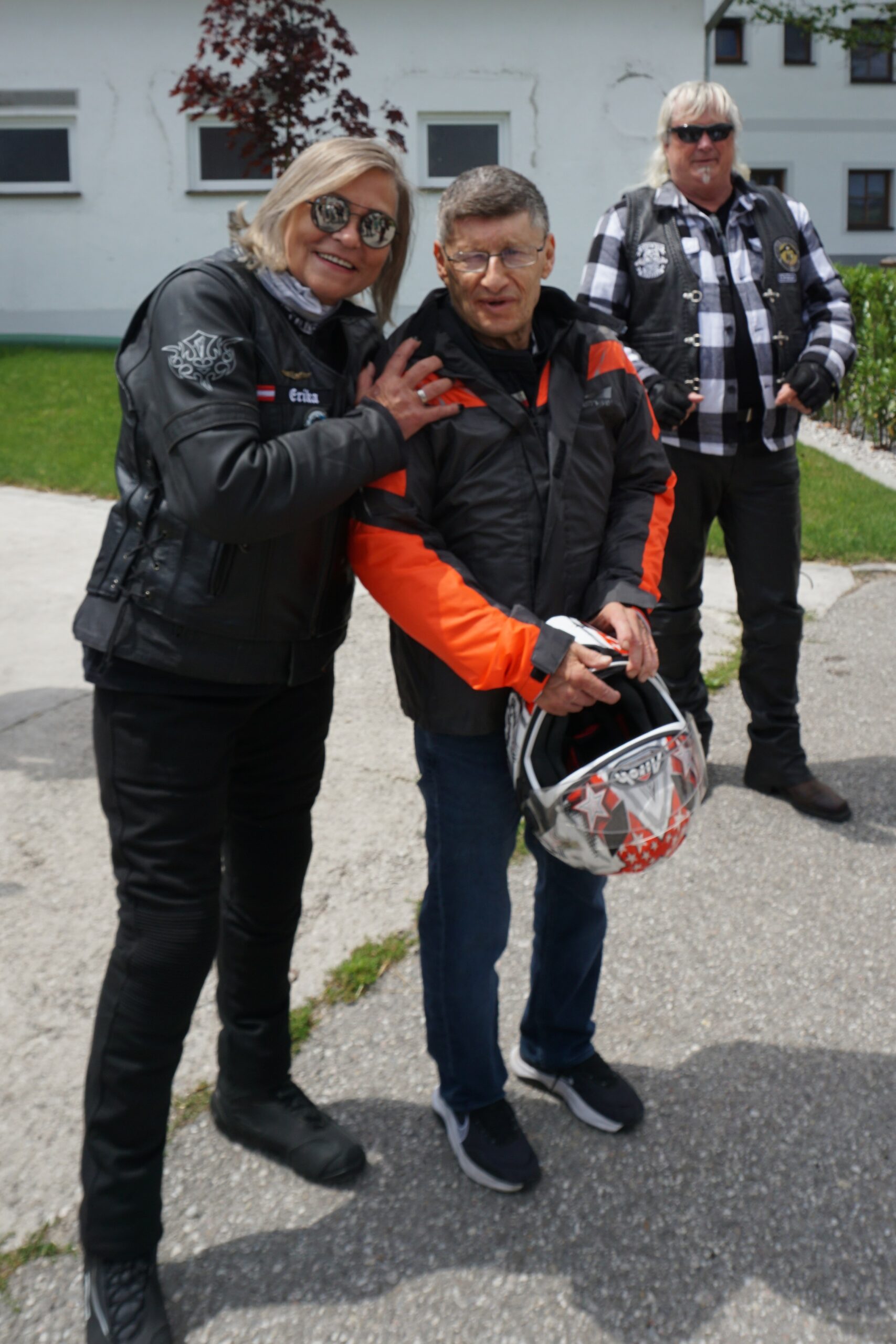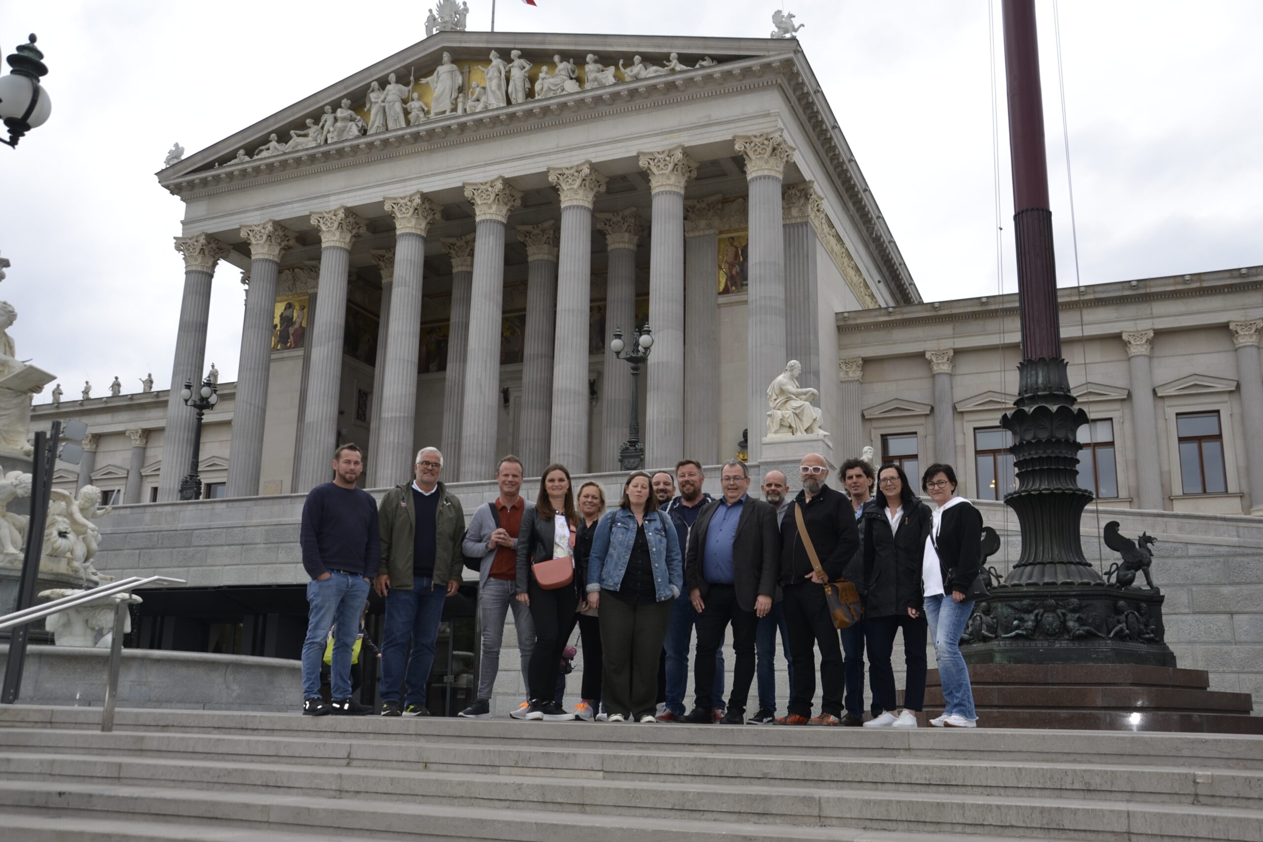 | alt: | Mehrere Erwachsene sitzen nebeneinander an einem Gebäude im Freien und unterhalten sich. |