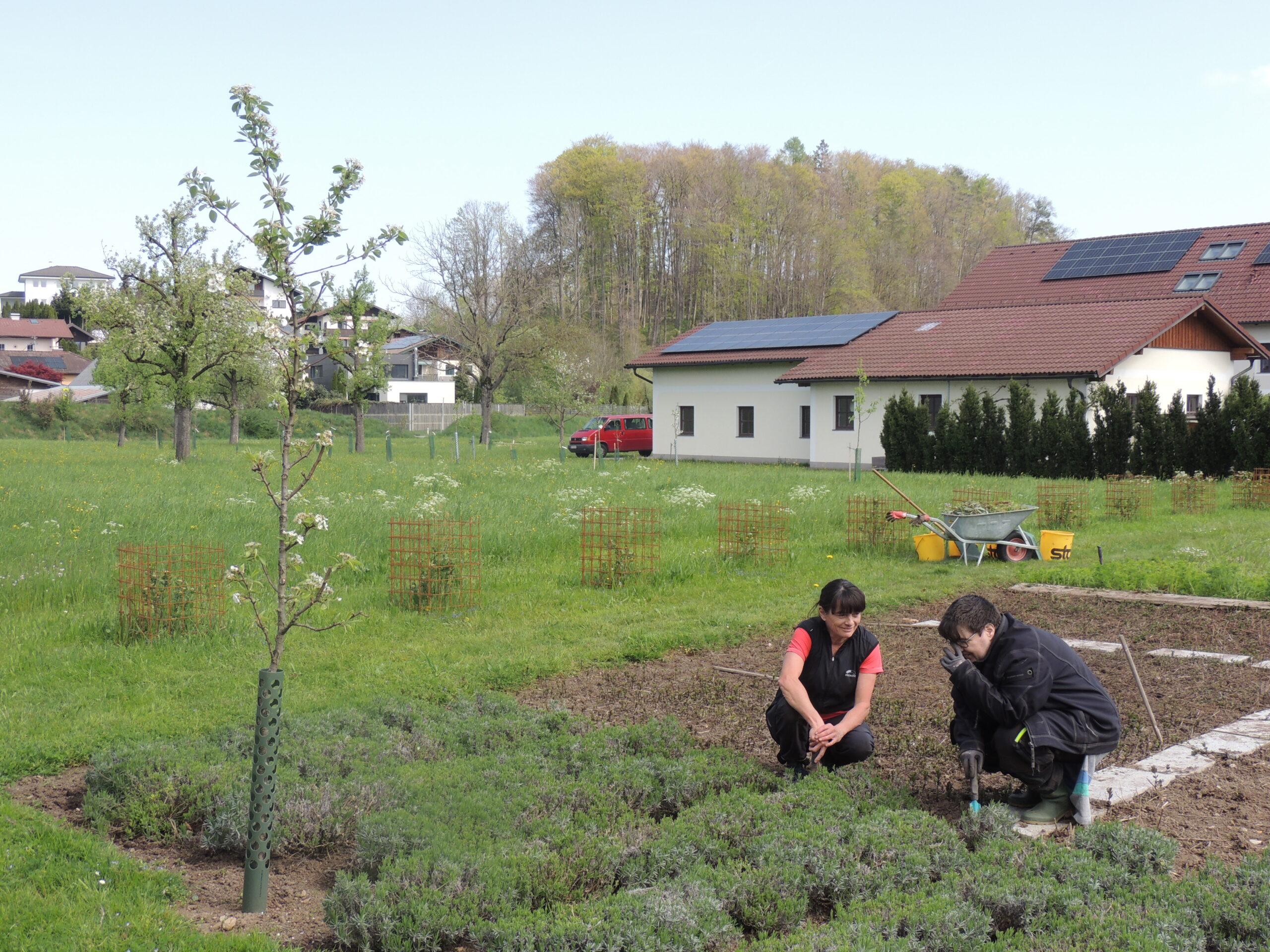 | alt: | Mehrere Personen arbeiten gemeinsam in einem Garten an Hochbeeten – begleitetes Wohnen mit gemeinschaftlichen Aktivitäten im Freien. |