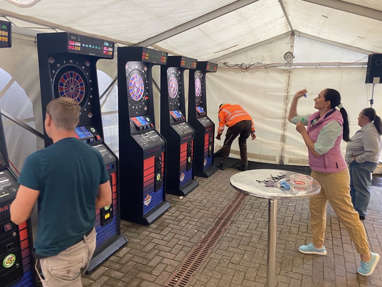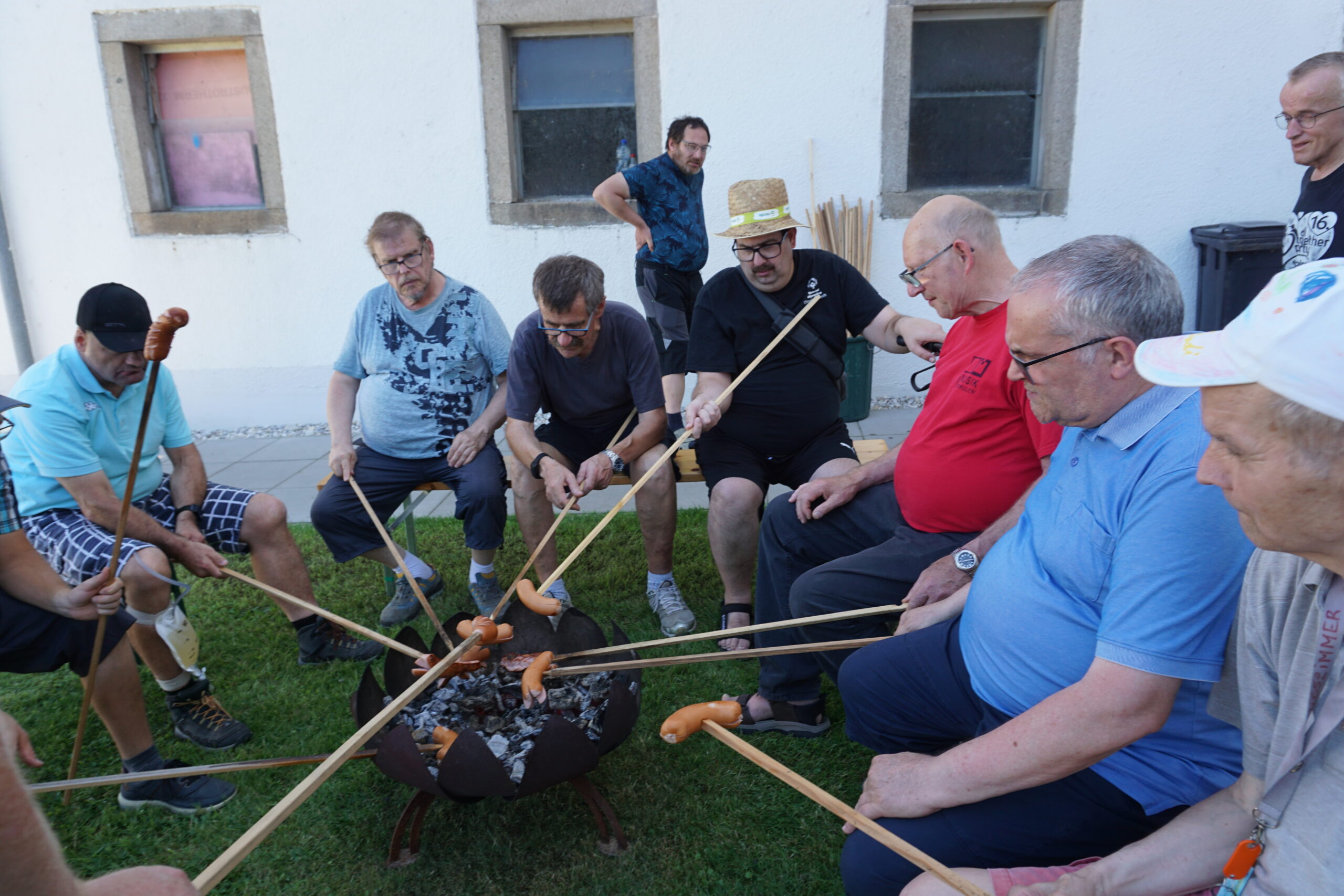 | alt: | Mehrere Personen stehen auf einer Wiese und spielen ein Boccia oder ein ähnliches Spiel. |