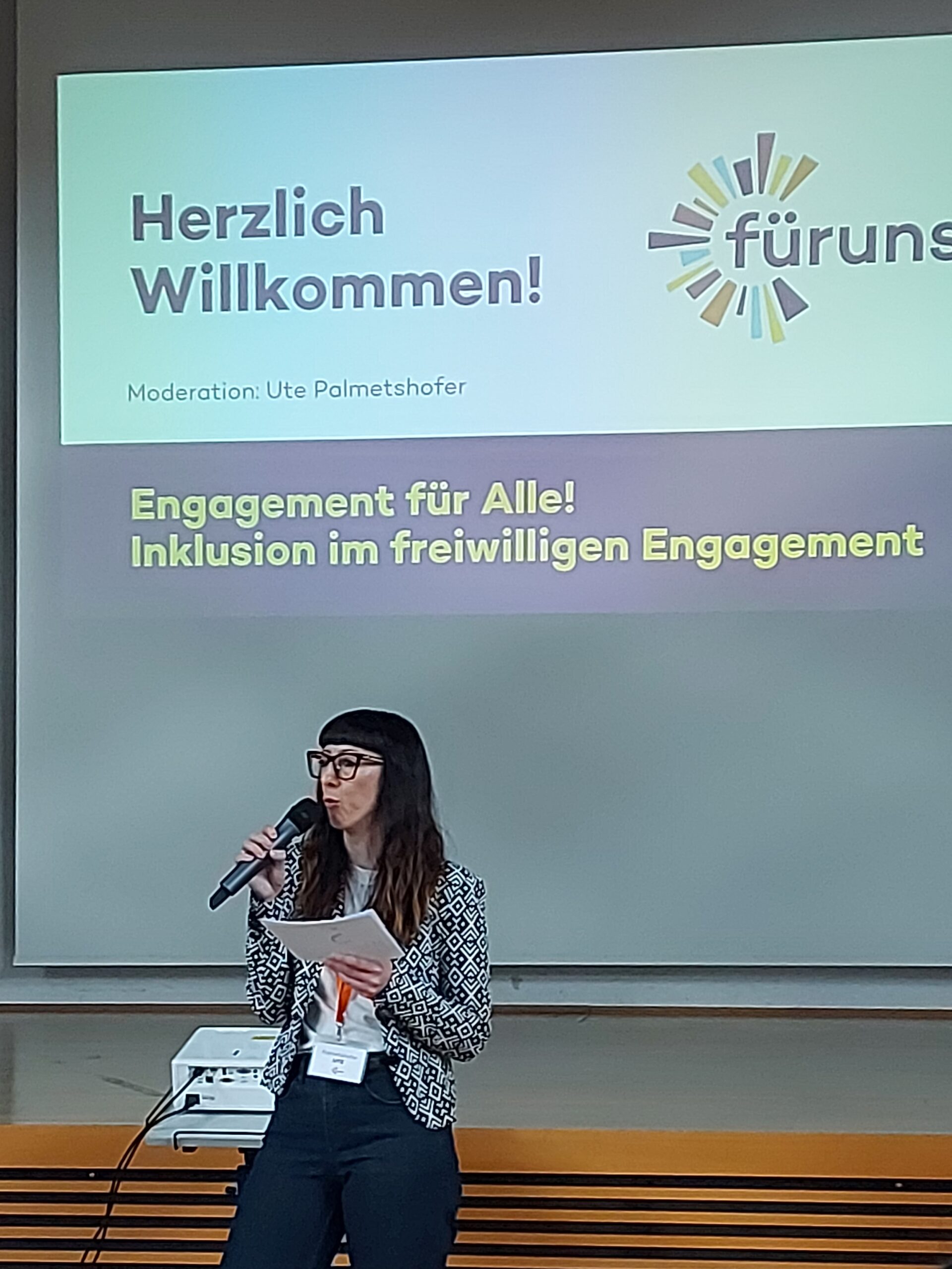 | alt: | Inklusionsarbeit – Icon mit stilisiertem Rednerpult vor mehreren Personen. |