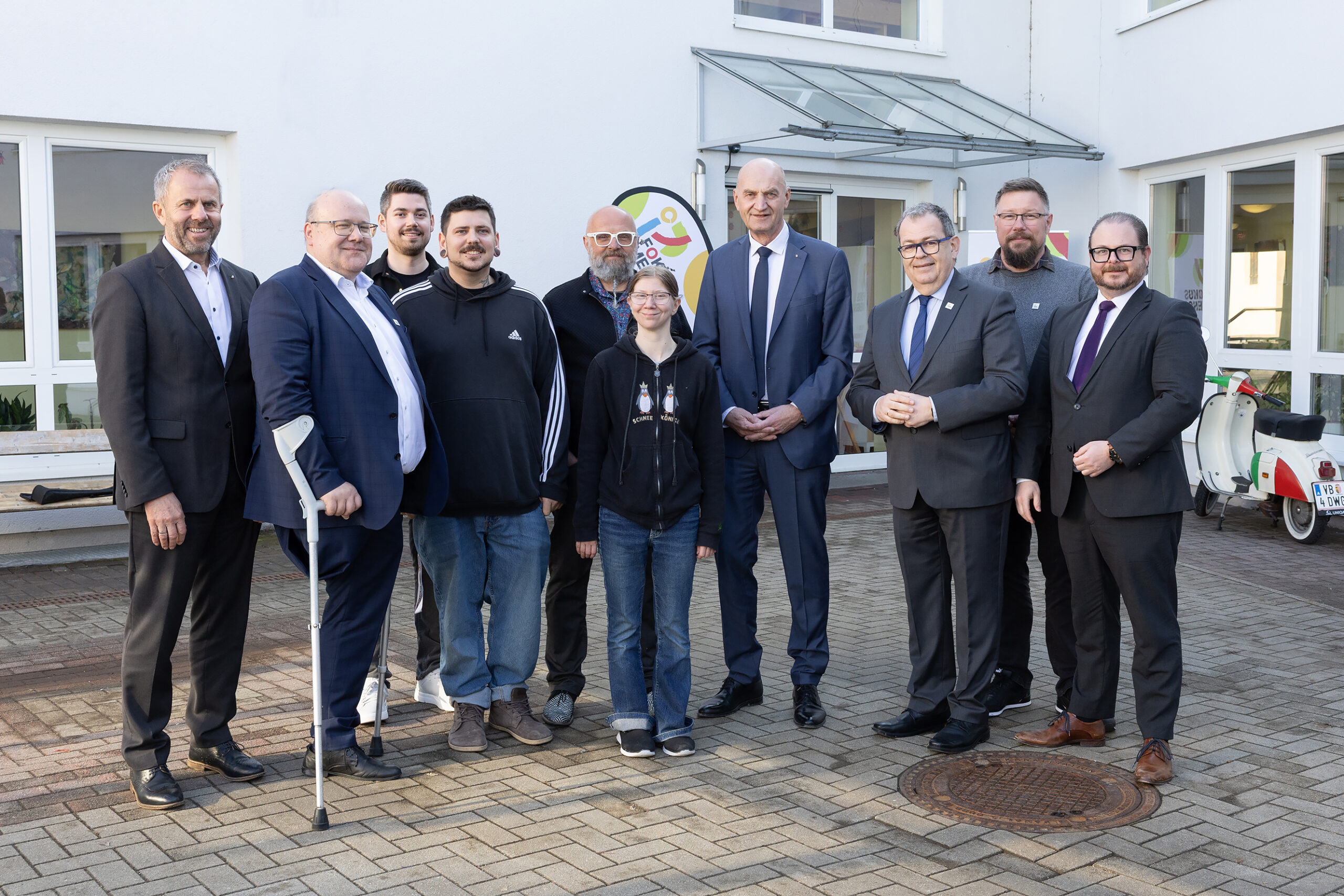 | alt: | Mehrere Personen sitzen und stehen vor einem Wohnhaus mit Treppe und Garten – gemeinsames Wohnen in einem unterstützten Wohnumfeld. |