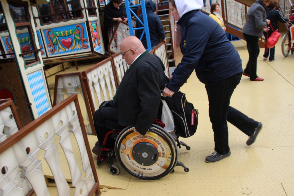 Wir probierten auch die „Oide Wies´n“ aus. Hierbei handelt es sich um einen eigens abgetrennten Bereich, zu dem man einen Eintritt zahlen muss (entfällt ab einem Grad der Behinderung von 50 Prozent). Im „Traditionszelt“ steht an zwei Tischen je nur eine Bank. Dort findet man als Rollifahrer so gut wie immer Platz und oft zusätzlich a paar mehr oder weniger „echte“ Boar´n (Bayern) zum Zuprosten und Ratschen.