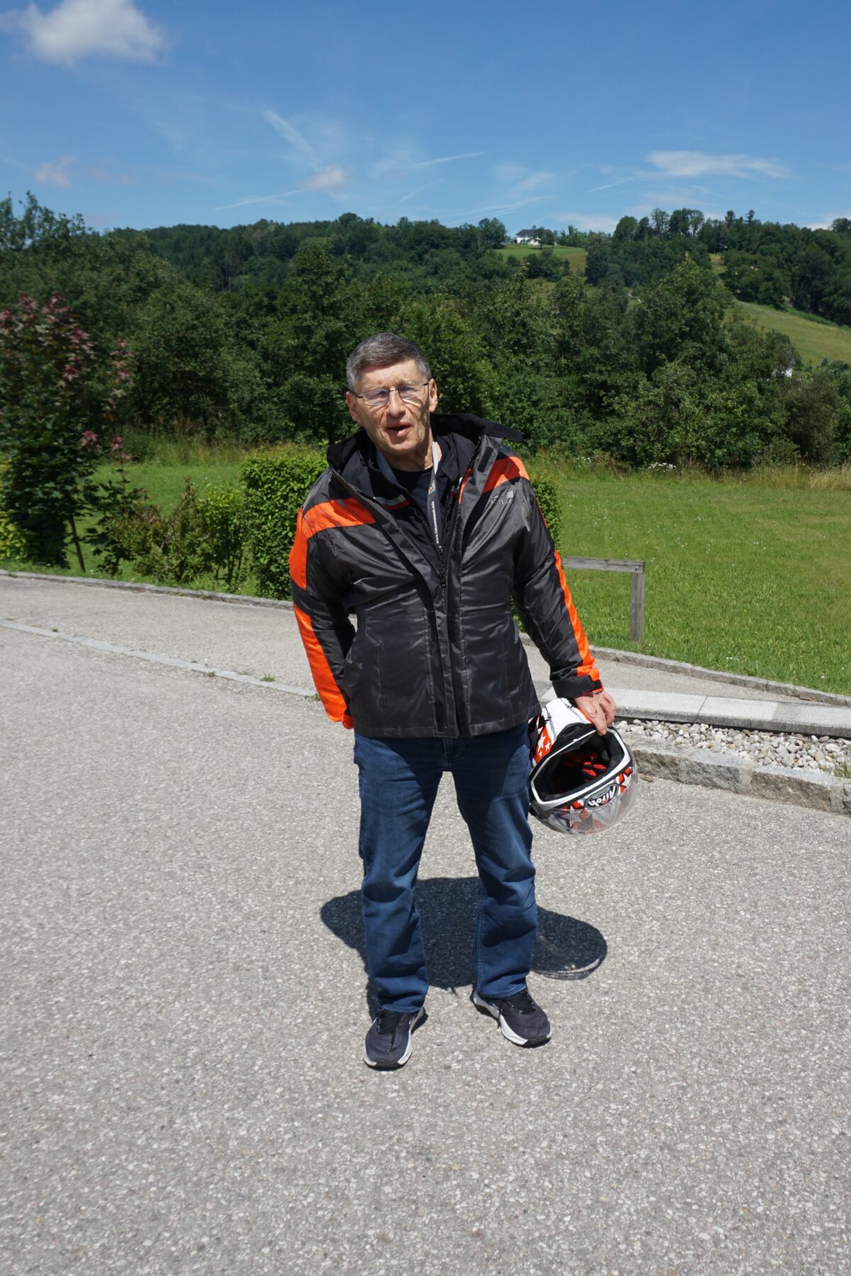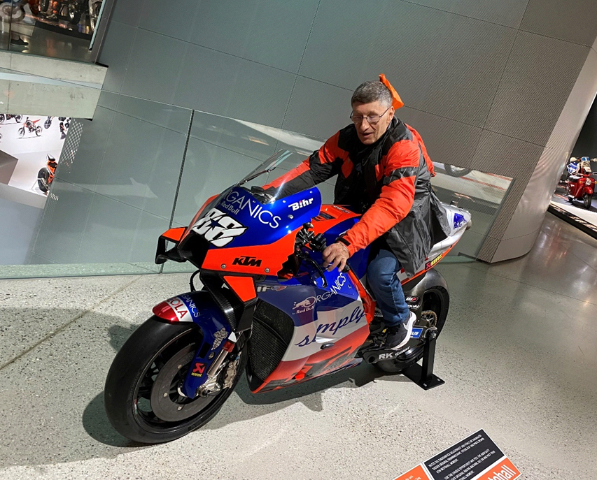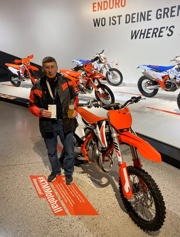„Ich wusste ja bereits, dass ich mit dem Motorrad mitfahren darf. Aber so richtig vorstellen konnte ich mir noch nichts, wie das wird. Gegen Mittag wurde ich zum Hof gebracht - ich war richtig nervös! Ich stand bei der Villa, als es dann laut wurde und ein Motorrad um das andere um die Kurve kam, es hörte gar nicht mehr auf. 42 waren es. Die meisten kamen auf mich zu, um mich zu begrüßen […] Ich durfte mir aussuchen, wo ich mitfahren möchte! […] Es war das riesige Trike von Roland Undras mit 180 PS, das gefiel mir besonders gut. Ordentlich bekleidet mit Jacke, Helm und Handschuhe konnte es endlich losgehen. Mann… war ich aufgeregt! Wir fuhren also vom Hof Schlüßlberg Richtung Ried […] und nach einer Stunde Fahrt kamen wir in Mattighofen an. Anschließend wurde ich in die Holding mit Führung eingeladen, wo die spannende Geschichte von KTM präsentiert wird. […]