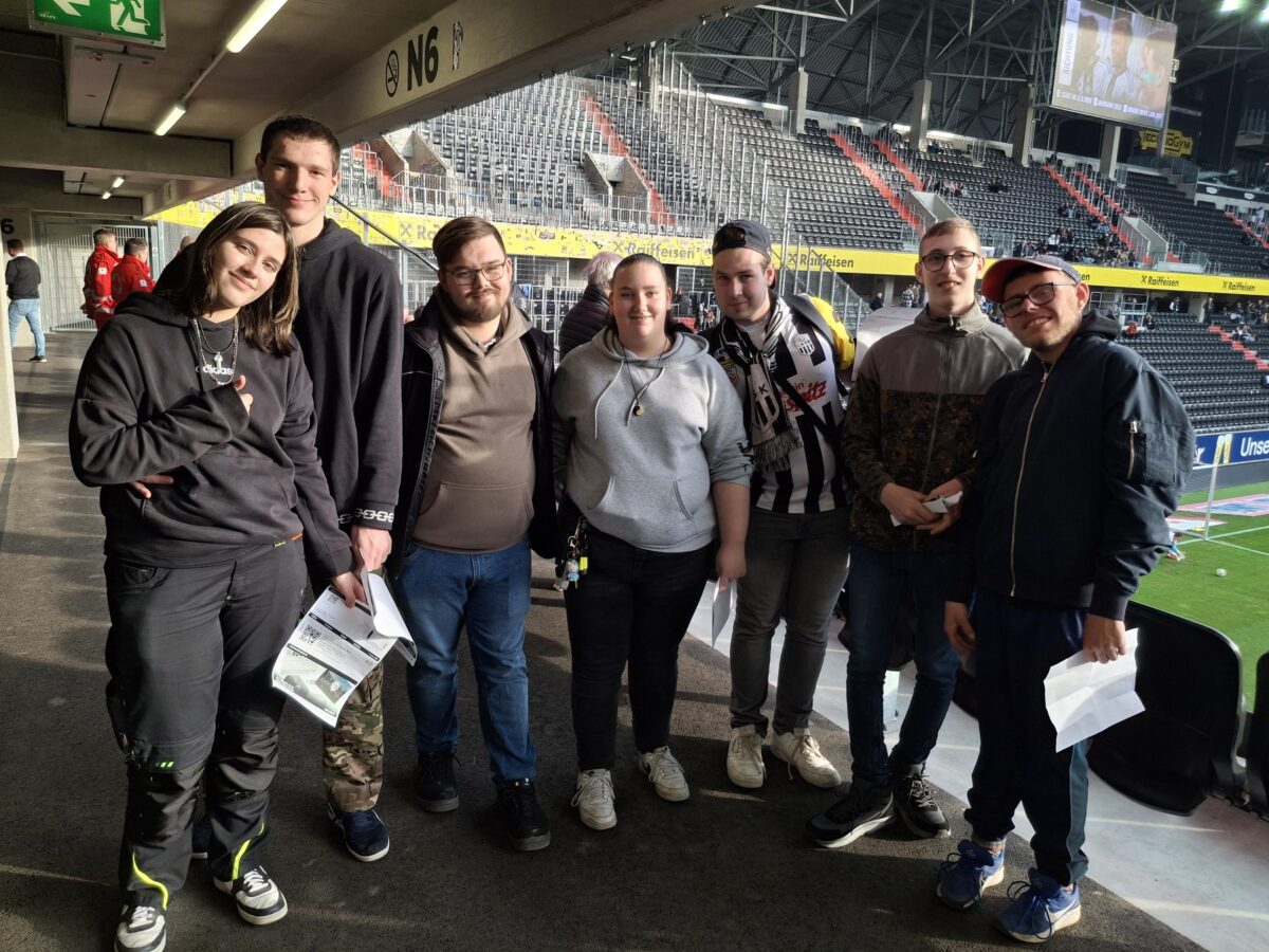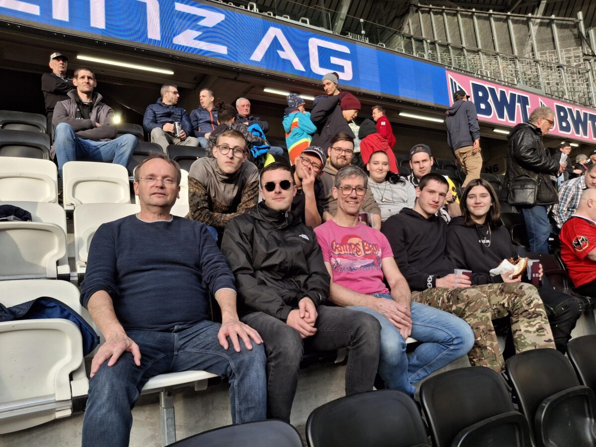 Sport, Spannung und Stimmung: Eine Gruppe von sieben Jugendlichen aus dem Hof Tollet machten sich gemeinsam mit einem Betreuer im Fokus-Mensch-Bus auf den Weg ins Linzer Stadion, um beim LASK-Spiel mit dabei zu sein. Zwei weitere Betreuer reisten privat an.