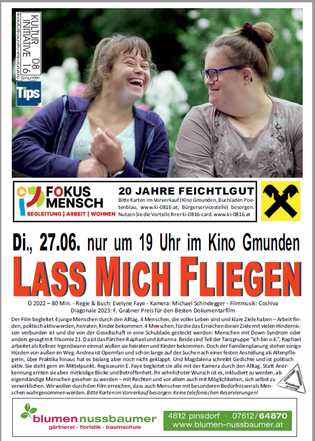 Hier ein kleiner Rückblick auf einen außergewöhnlichen Kinoabend mit dem Film "Lass mich fliegen..." in Gmunden. Zahlreiche Gäste von nah und fern sind unserer Einladung gefolgt und haben gemeinsam den Film genossen, in dem fünf Menschen voller Energie, Lebensfreude und Einzigartigkeit und mit Down-Syndrom von ihren Lebensträumen erzählen.