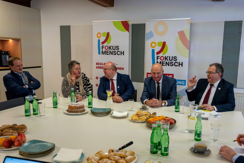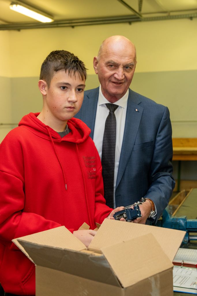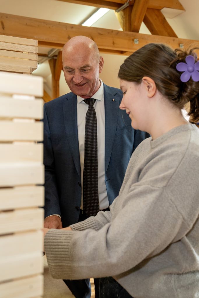 Nach einer kurzen Präsentation über unser Gesamtunternehmen Fokus Mensch, dessen Angebote, Dienstleistungen und den damit verbundenen Herausforderungen, besichtigte Dörfel gemeinsam mit Bürgermeisterin (Tollet) Gisela Mayr, die ebenfalls zu Gast war, und einer Delegation von Fokus Mensch die unterschiedlichen Werkstätten des Hofs. Von der Industriewerkstatt über die Kabelwerkstatt bis hin zur Tischlerei führte der Weg. Bei allen Stationen war Begeisterung spürbar – auf beiden Seiten. Die jungen Menschen zeigten mit Stolz ihre Fähigkeiten und erklärten die ihnen anvertrauten Aufgaben. Fokus Mensch-Mitarbeiterin Birgit Sickinger stellte klar: „Wir machen hier nicht ‚Beschäftigung‘ als Selbstzweck, sondern Auftragsarbeiten. Alles, was hier erledigt wird, wird gebraucht.“