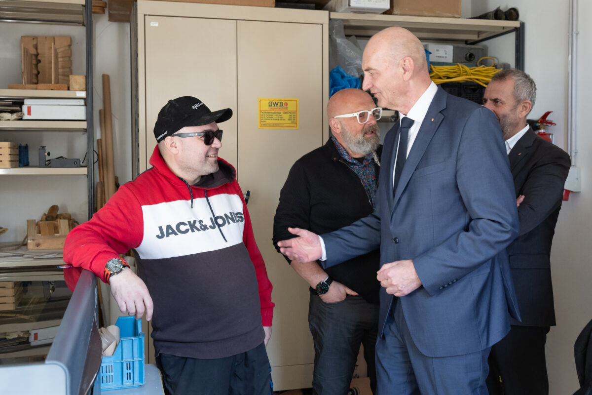 Bei der anschließenden Führung durch die Werkstätten und den Wohnbereich kam Landesrat Dörfl mit Mitarbeiterinnen und Mitarbeitern sowie mit einigen begleiteten Menschen ins Gespräch. Besonders bewegend war auch der kurze Besuch bei der Gedenkstätte für verstorbene Menschen mit Behinderung.