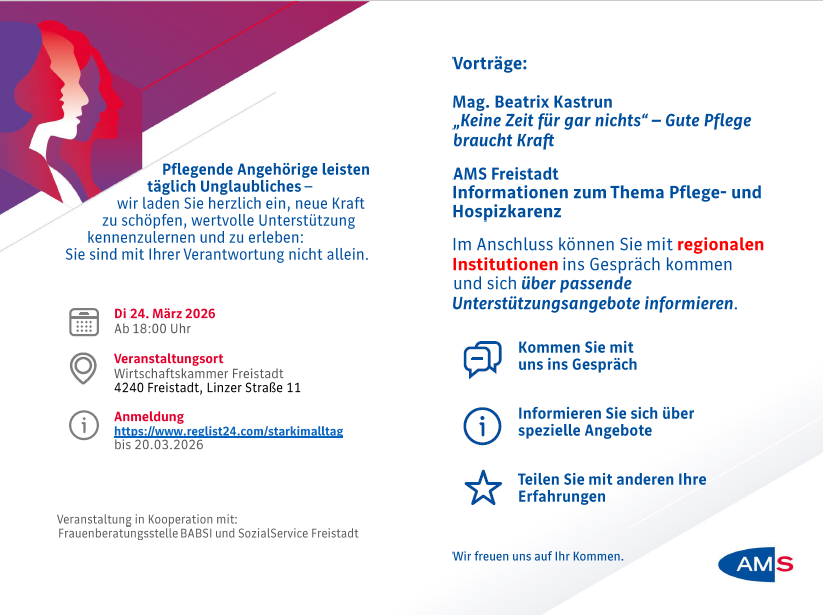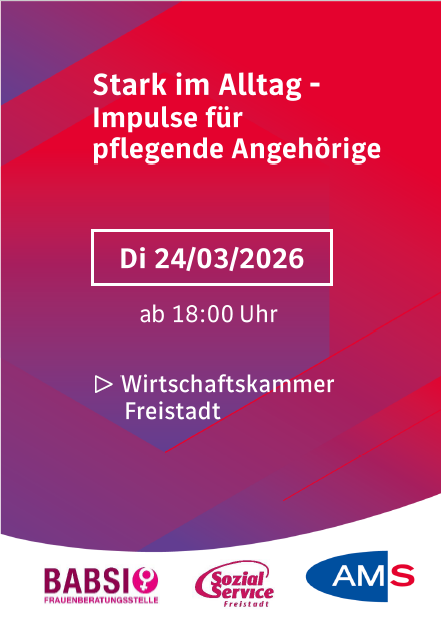 Wir von Fokus Mensch möchten euch als Service-Leistung Veranstaltung auf die Veranstaltung „Stark im Alltag -Impulse für pflegende Angehörige“ aufmerksam machen! Der Abend ist eine Kooperation mit: Frauenberatungsstelle BABSI, SozialService Freistadt und AMS.